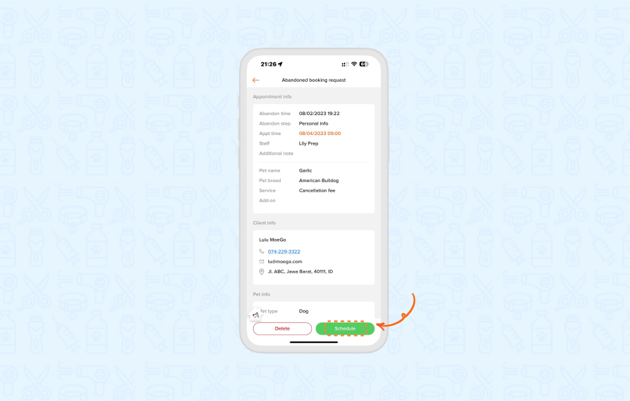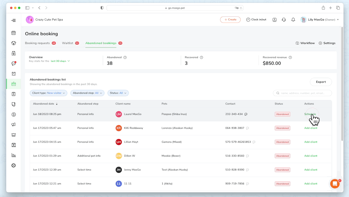- After reaching out to an existing client or a new client after adding him or her to your client list. You can click on <Schedule> to directly schedule an appointment and turn them into recovered clients.