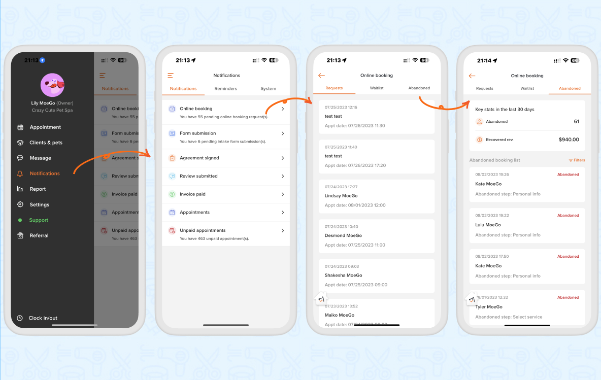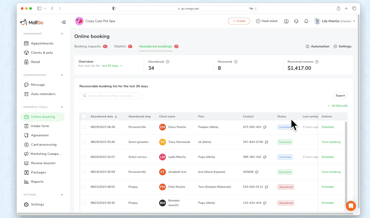 Abandoned Booking for Online Booking is designed to help you reconnect with potential clients who couldn't complete an online booking and facilitate the recovery of these bookings!