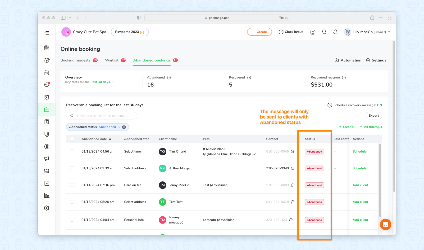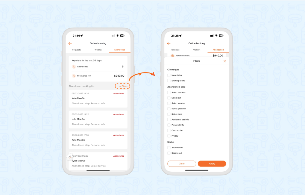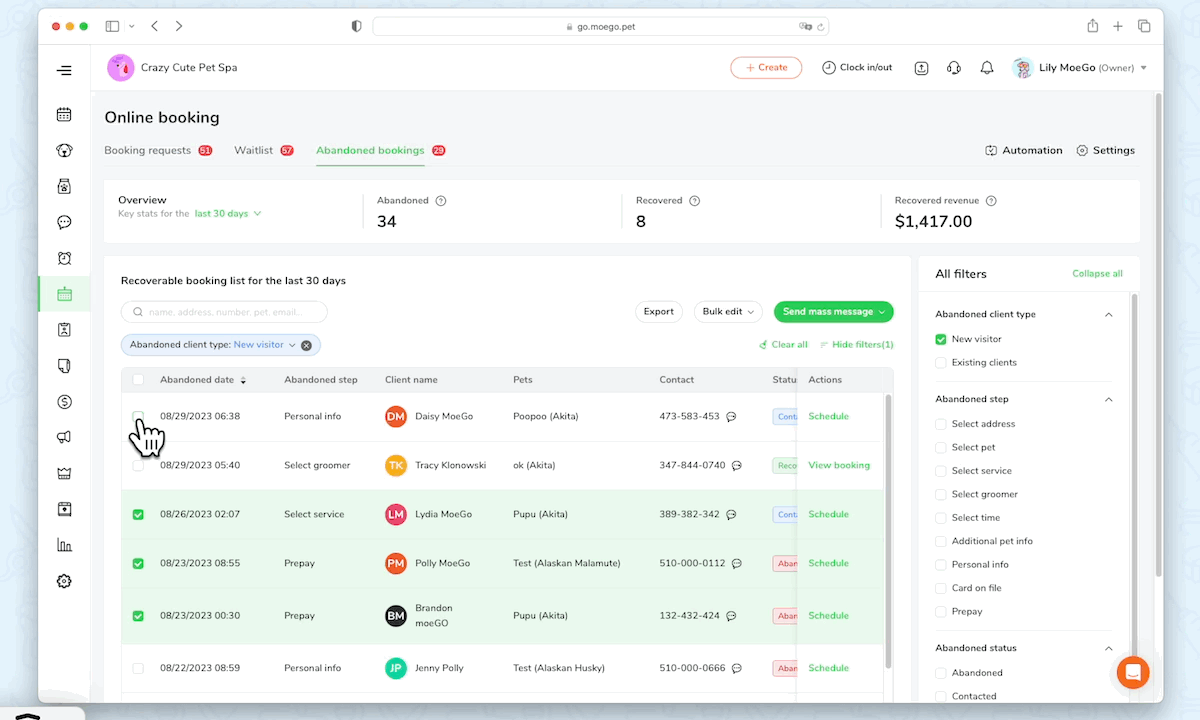 - By applying the filters in Abandoned Booking list, you can filter the prospect by client type, steps where they abandon, status (recovered/abandoned/contacted), abandoned date, and last contact time.