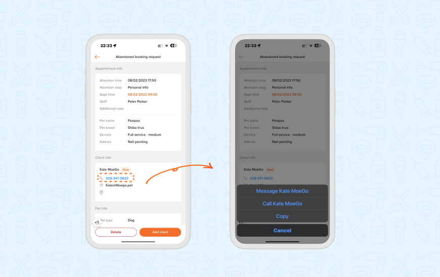 You can click on the pre-filled number on the client detail page to directly call or message the client to confirm their information.