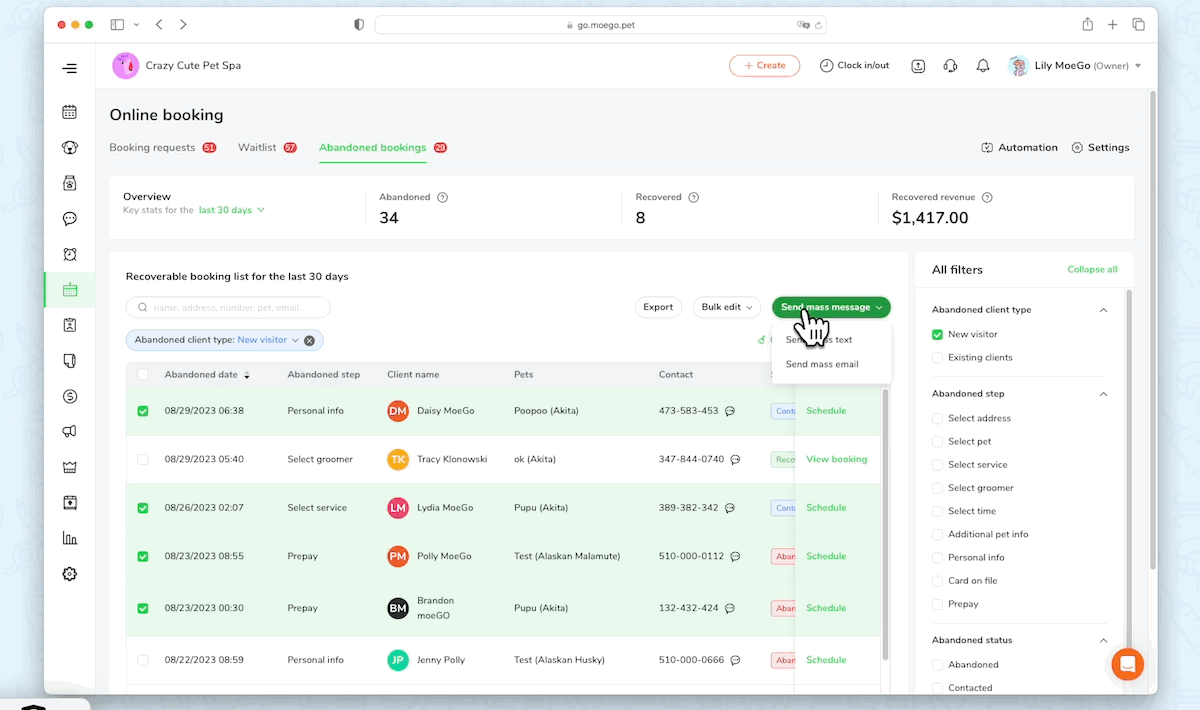 By clicking < Sending mass text >, you can write a tailored message to all the prospects, or, you can click on < Recovery template > to use a text template we designed specifically for recovering abandoned booking clients.