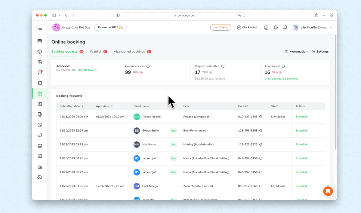For the customers who visited your booking site but failed to submit booking requests for different reasons, now you can recover them at your fingertips. You can easily assist with their booking via call or message with their pre-filled info, directly schedule appointments for them, regularly track your recovery performance, identify trends, and optimize strategies to enhance booking recovery over time.