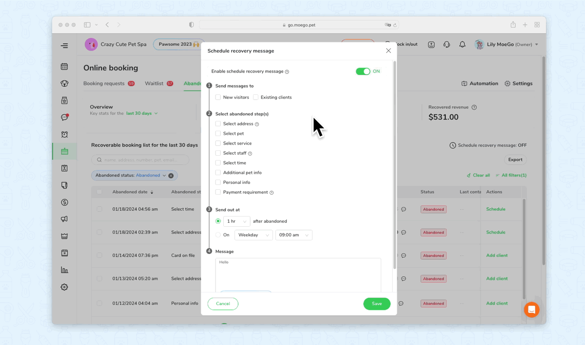 The Schedule Recovery Message is a powerful tool to help you send scheduled, personalized two-way messages to your site visitors who almost became your customers. This feature helps you seamlessly deliver tailored communication and assistance to clients who may have trouble completing the booking. Once enabled, the system will automatically add site visitors who responded to your client list.