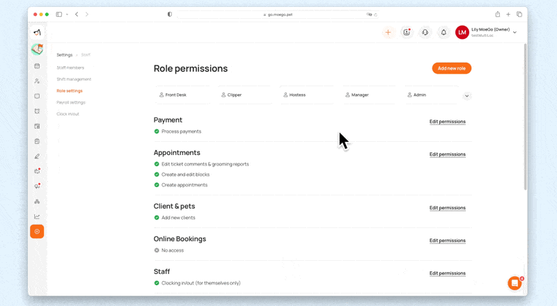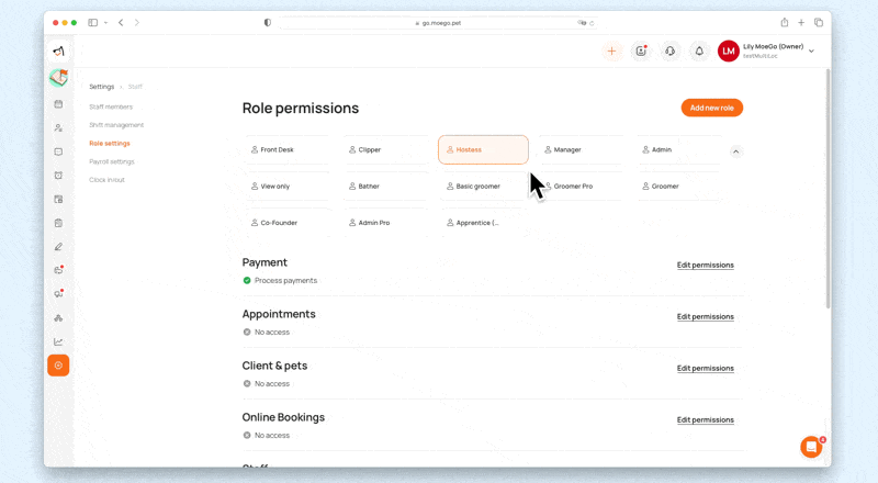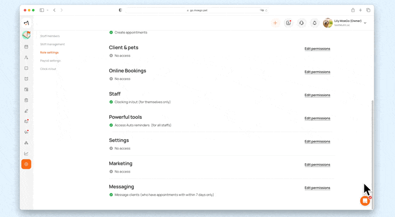With MoeGo's staff settings page, you have the flexibility to tailor staff roles and permissions to suit your business needs.