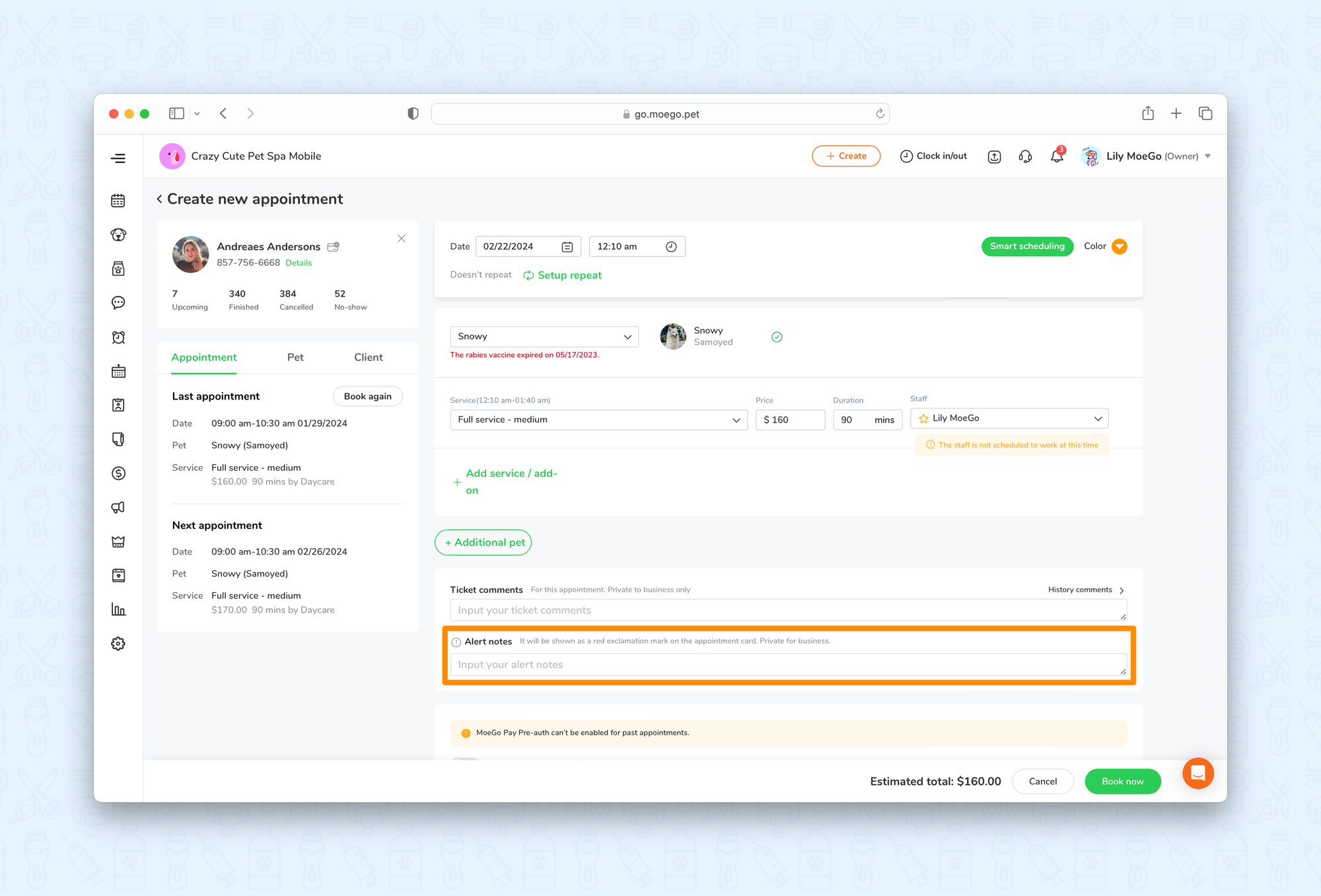 - On the appointment booking page, select the < alert note text box > to add and save the alert note