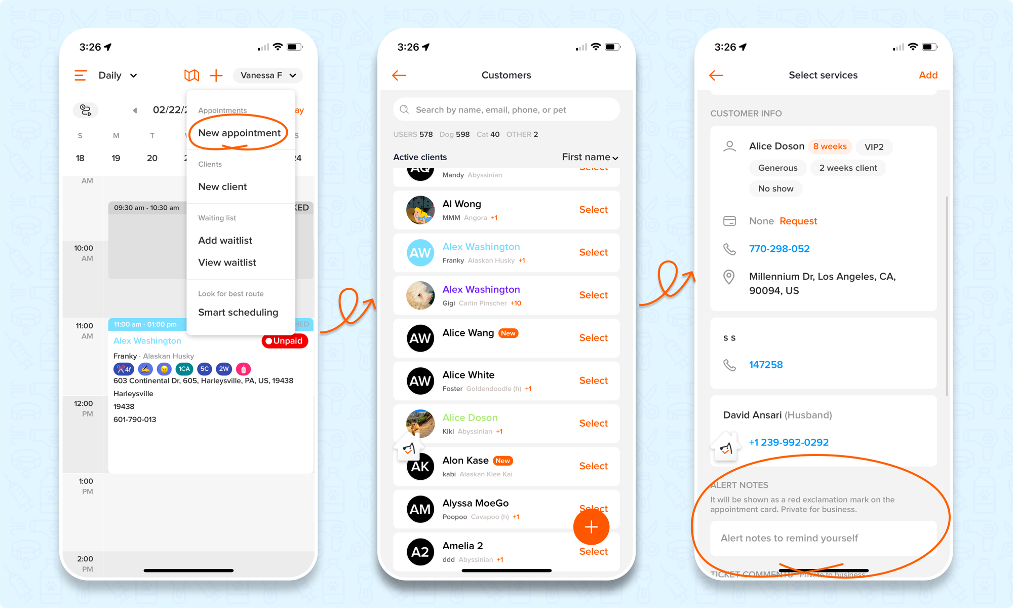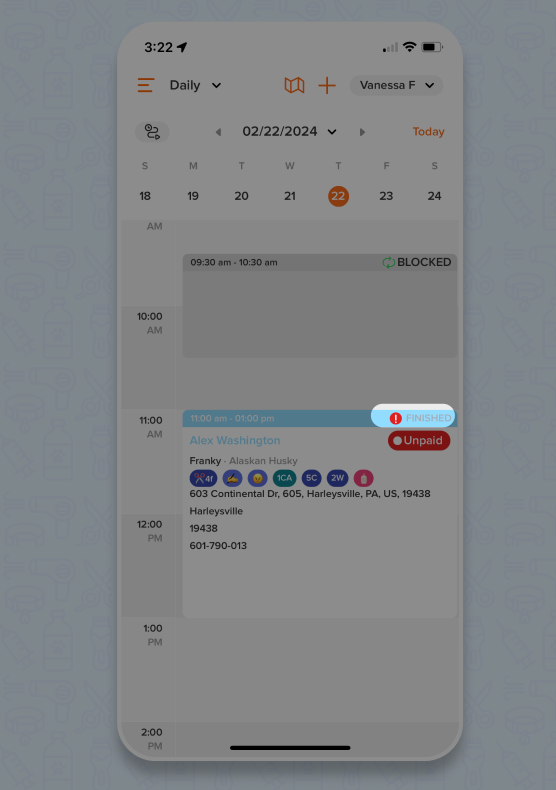 The alert note serves as a distinctive type of ticket comment. Upon completion, a red exclamation mark will prominently display on the appointment card, catching your attention. To view the note, hover your mouse over it on the desktop version, or click on the exclamation mark to instantly reveal the details.