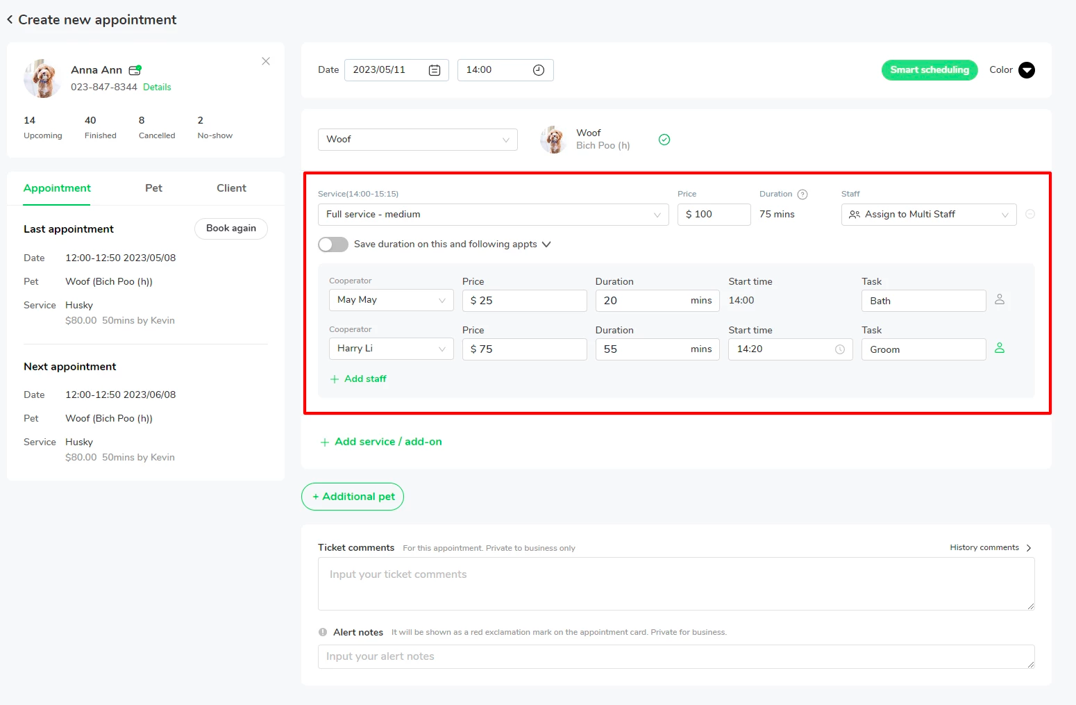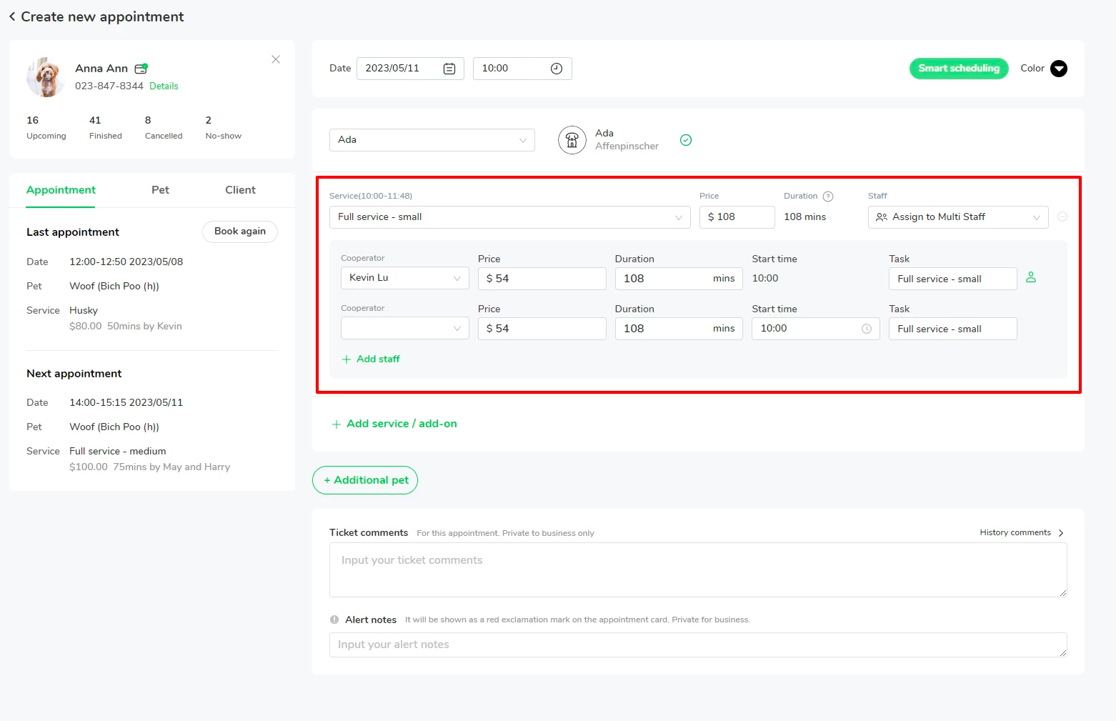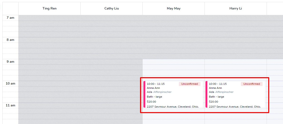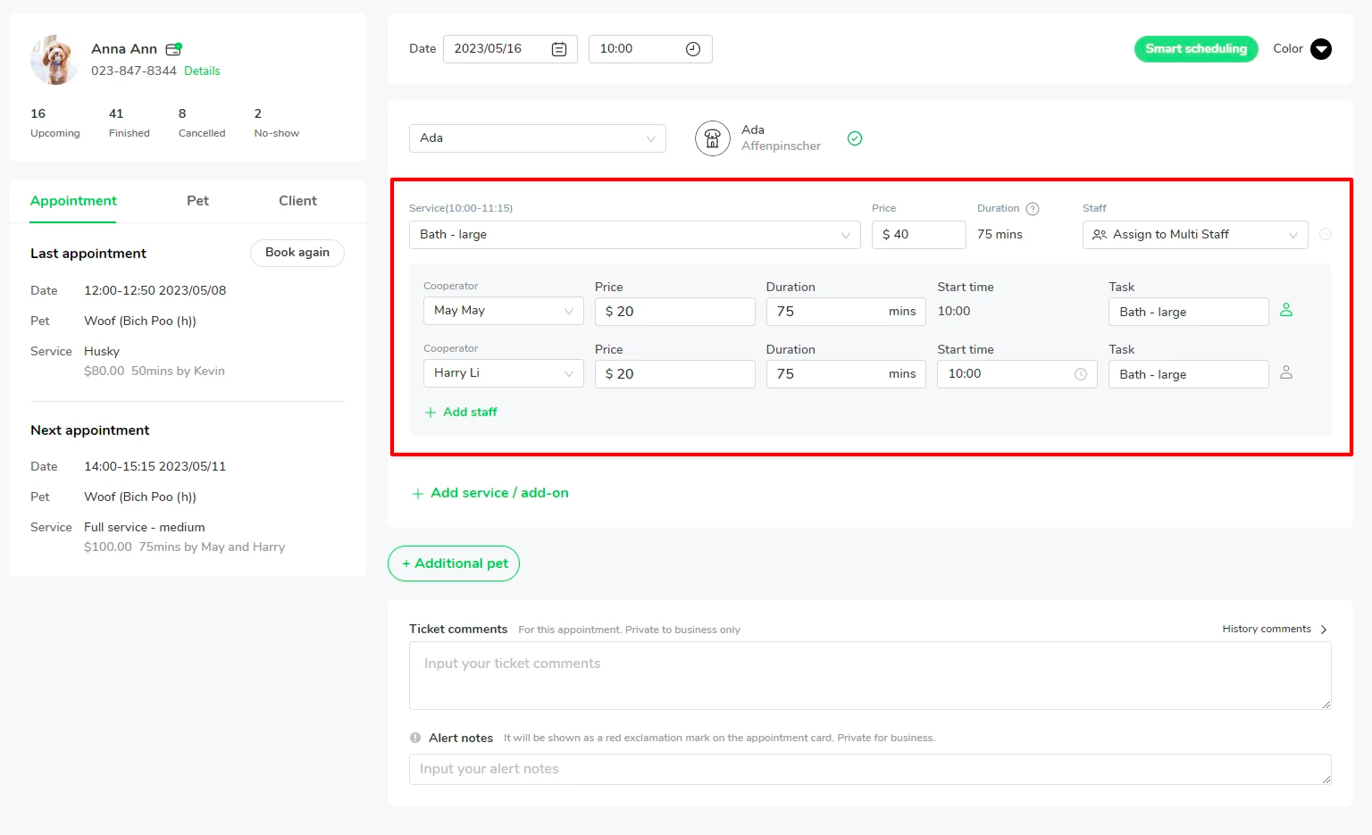 In this case, Ada is a large dog, May and Harry will be working together to get the bath done. You can schedule the service for Ada as below.