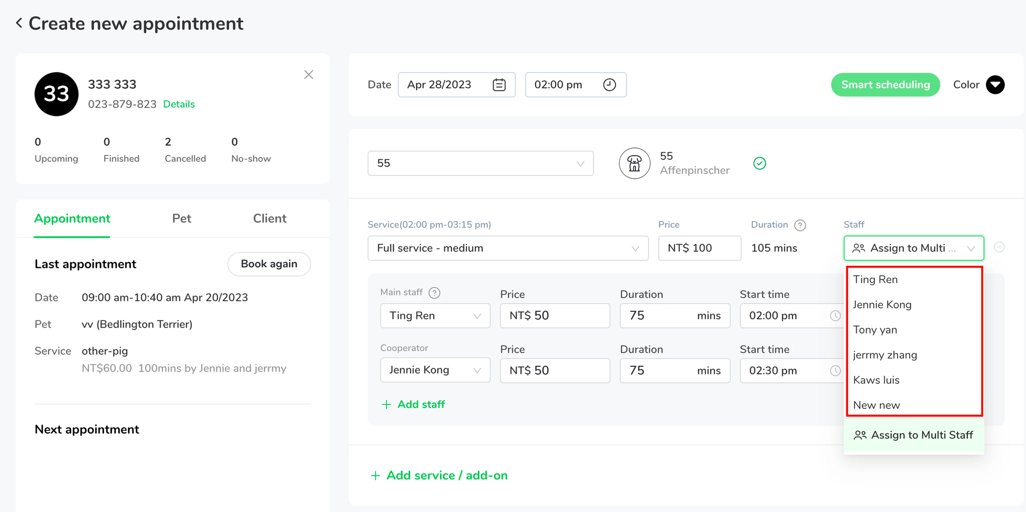 Grooming operations are dynamic. When handling large or energetic dogs, or when our furry client is assigned to separate bather and groomer, it is quite common for multiple staff members to collaborate on providing services in salons. However, it’s hard to manage staff availability and payroll calculations through online tool under collaboration cases. For the first time in the industry, you can track and compensate your staff precisely by simply assigning them to the corresponding service with the newly-invented multi-staff per service feature.