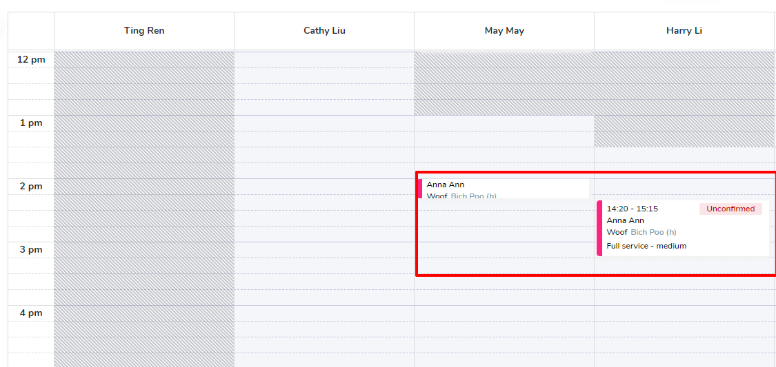 For instance, May and Harry will be working on Woof’s full groom service. Woof will take a bath with May which generally takes 20 minutes, followed by a haircut with Harry which takes 55 minutes. You can schedule the full groom service for Woof as below.