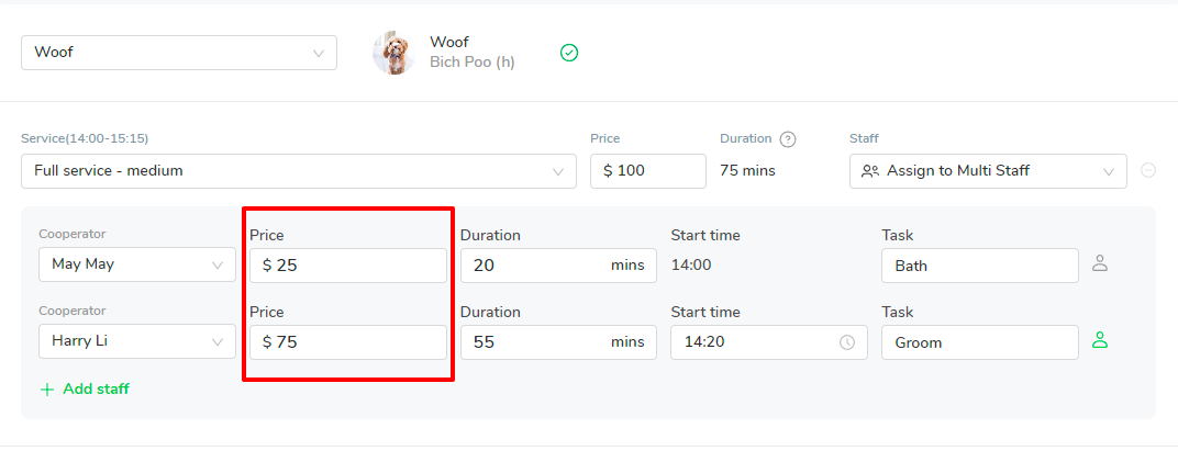 In this case, the full service price $100 will get divided between May and Harry based on the price you set up for May and Harry.