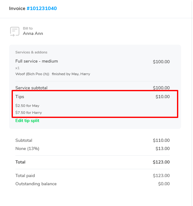 - The tip is set up to “Split by service price”, so the $10 tip will get automatically assigned to May and Harry based on the price assigned to them.
