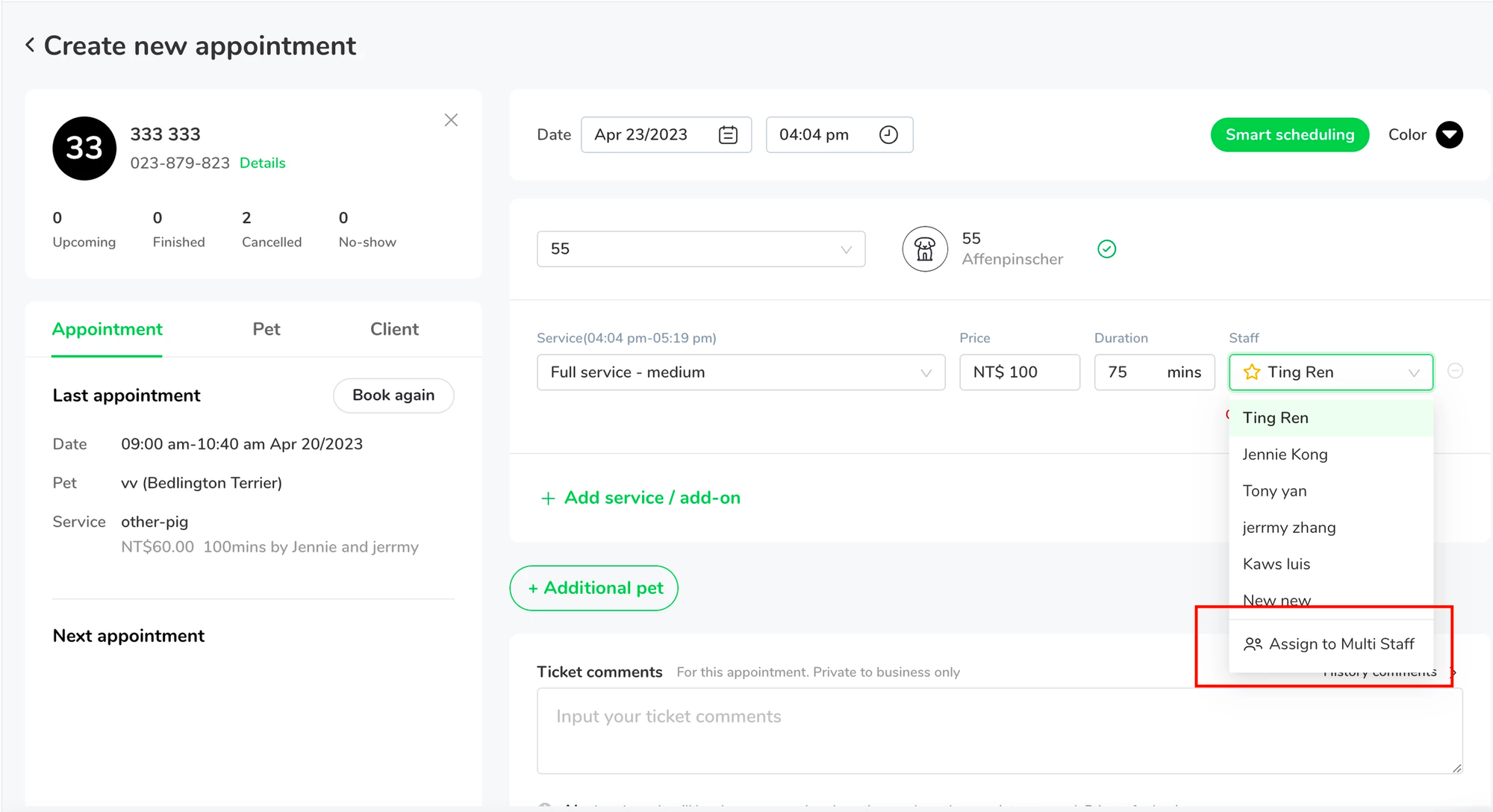 We are excited to introduce our Multi-staff per service feature. You can now assign multiple staff members to work on the same pet service!