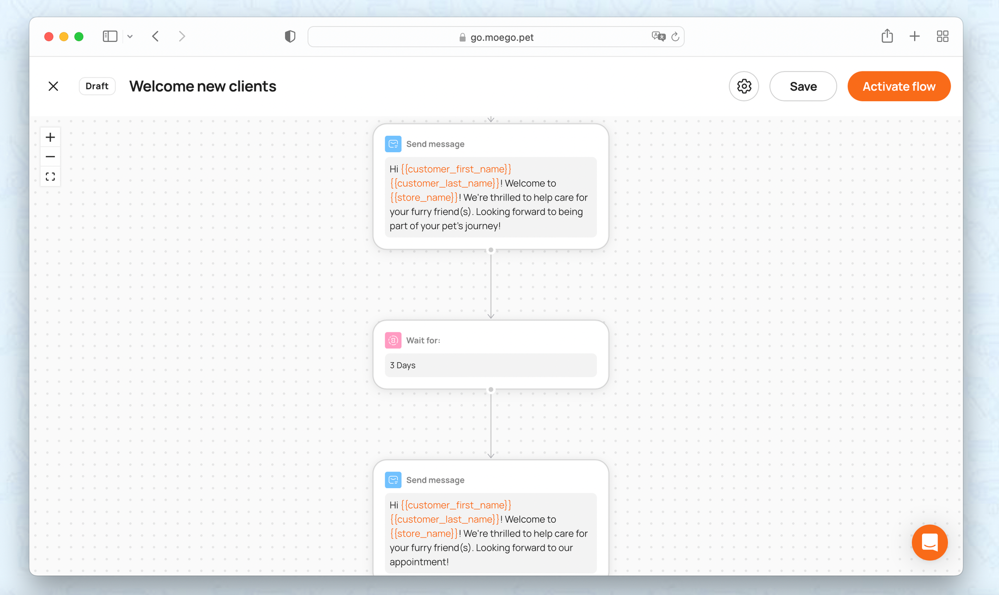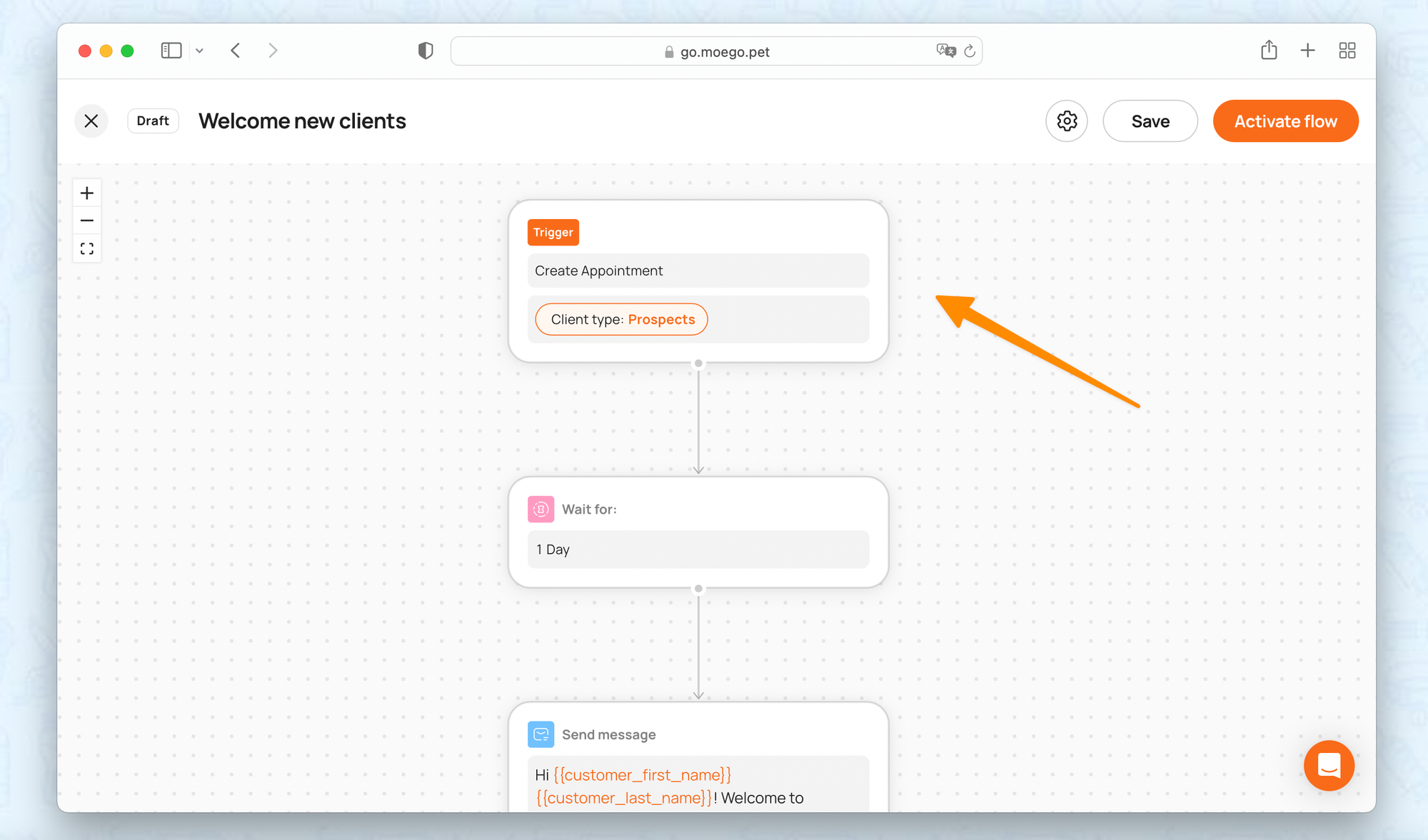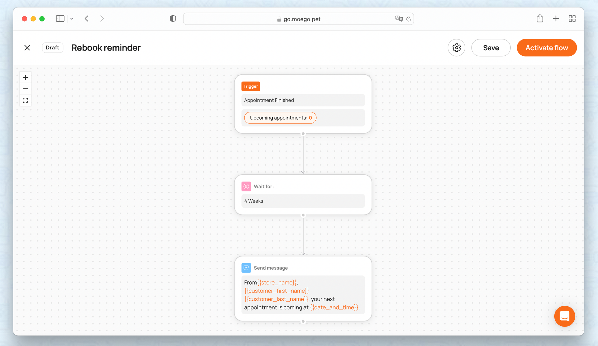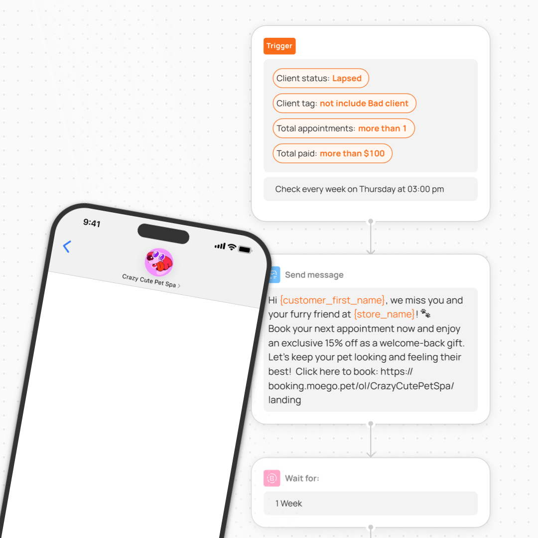 In Moego, an automated flow is a feature that initiates a specific action or experience in response to a particular behavior or event. If you're familiar with other marketing tools, you may recognize automated flows as "automationcards" or "drip campaigns." These flows streamline communication and enhance user engagement by ensuring timely and relevant interactions.