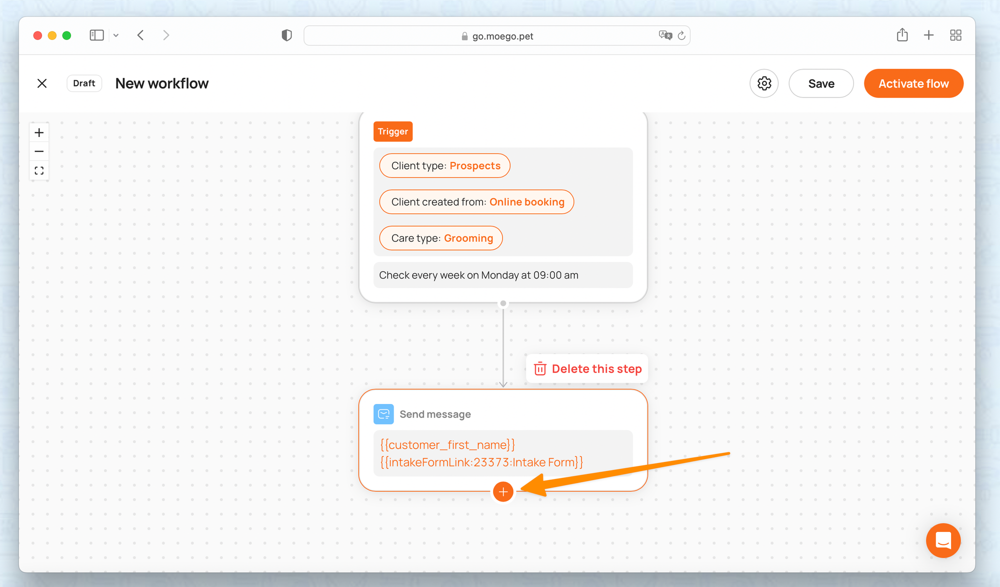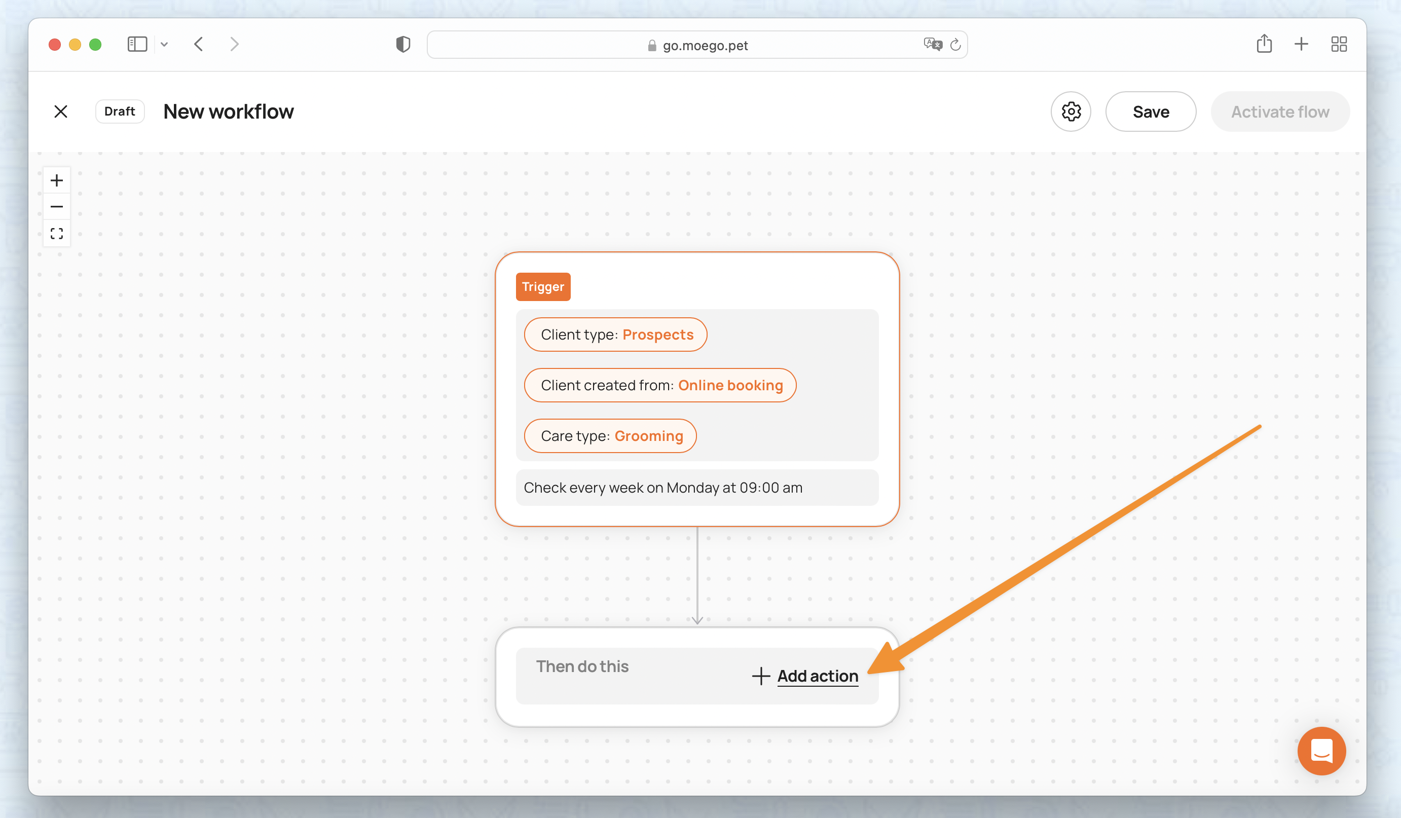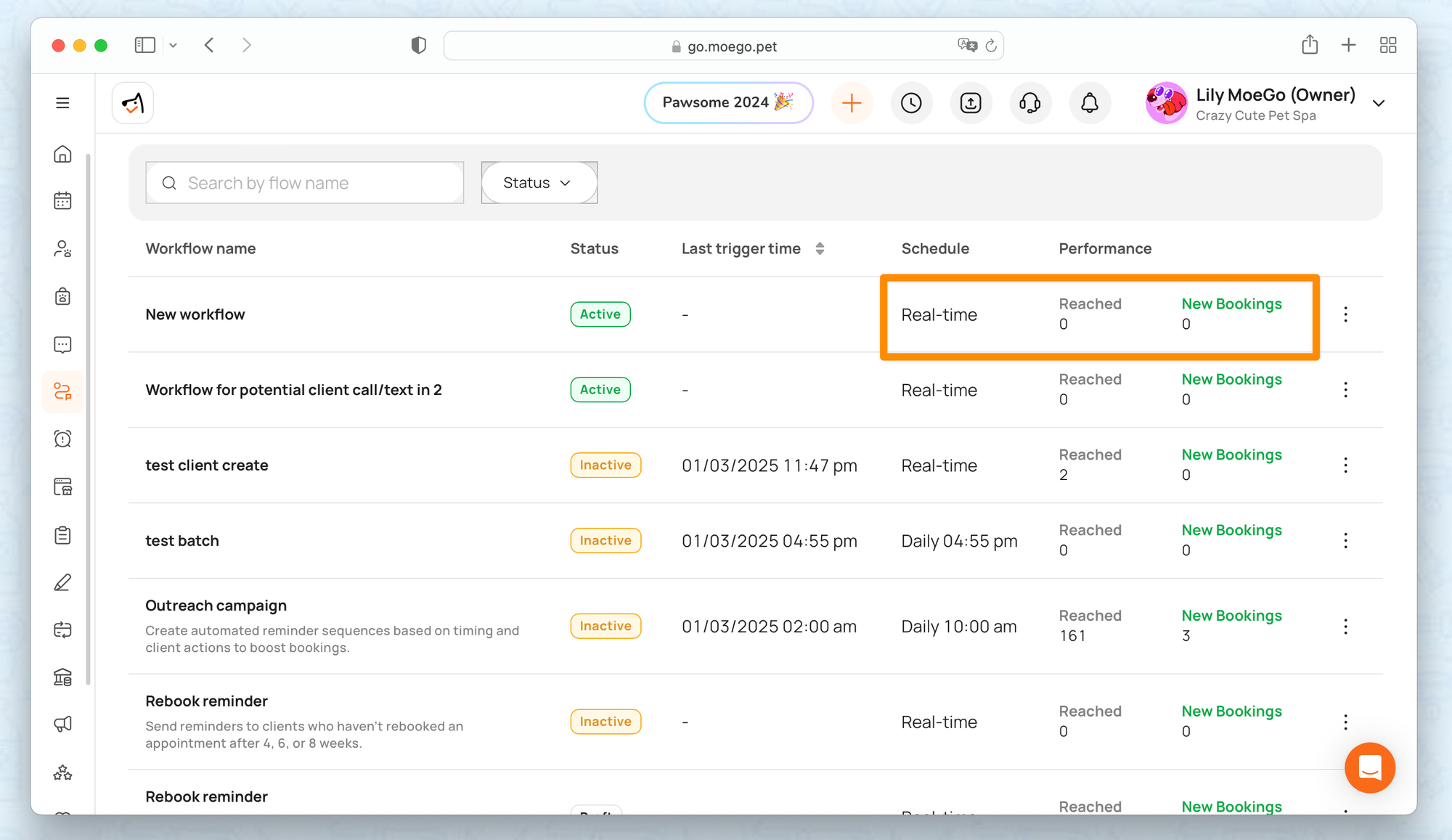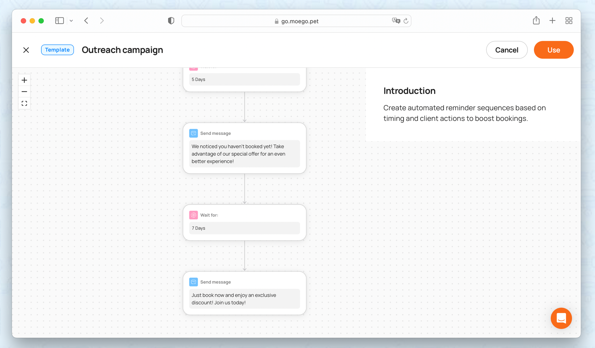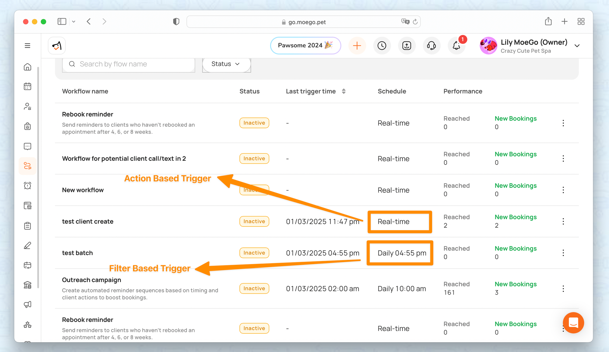 In Moego, an automated flow is a feature that initiates a specific action or experience in response to a particular behavior or event. If you're familiar with other marketing tools, you may recognize automated flows as "automationcards" or "drip campaigns." These flows streamline communication and enhance user engagement by ensuring timely and relevant interactions.