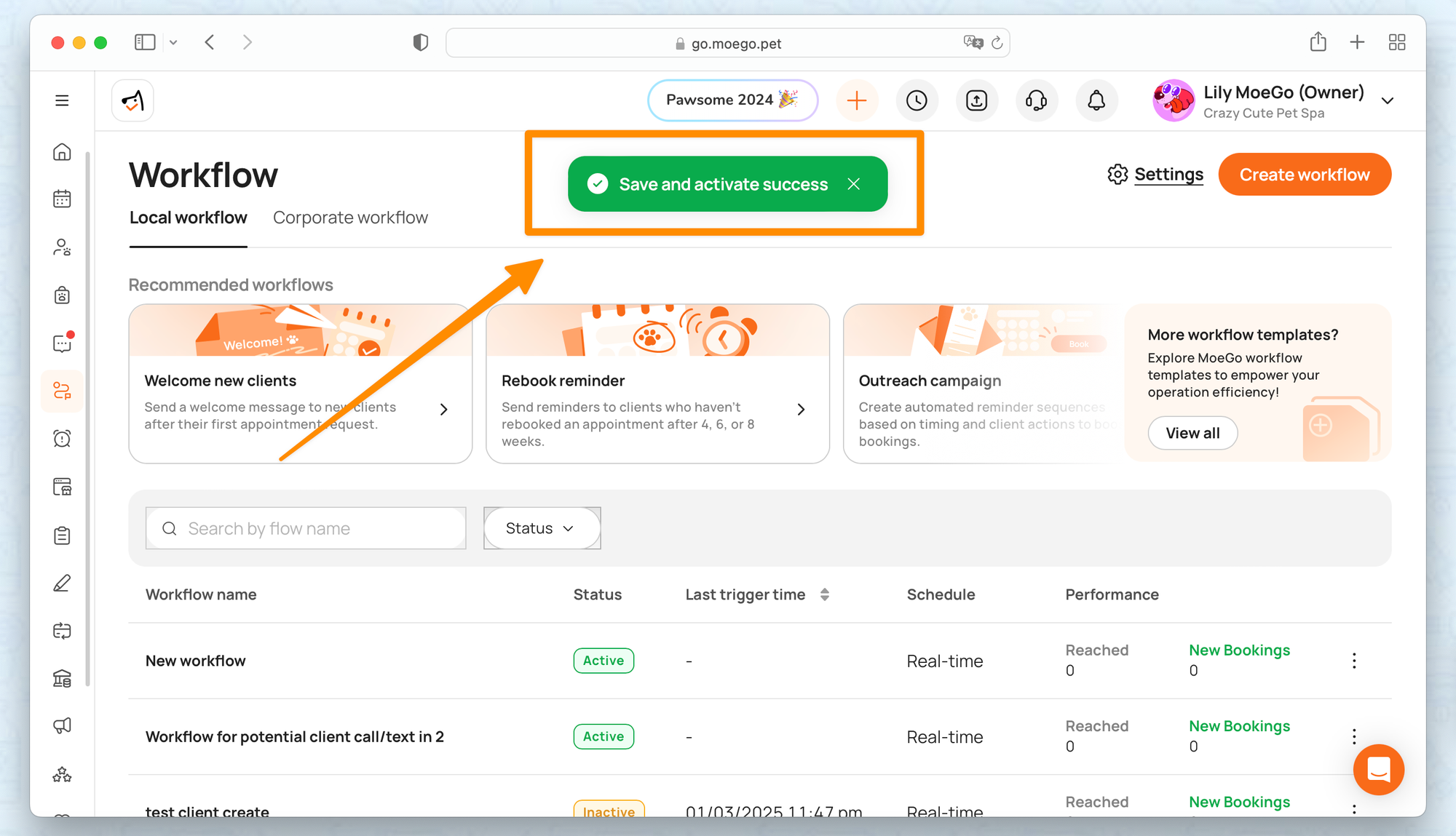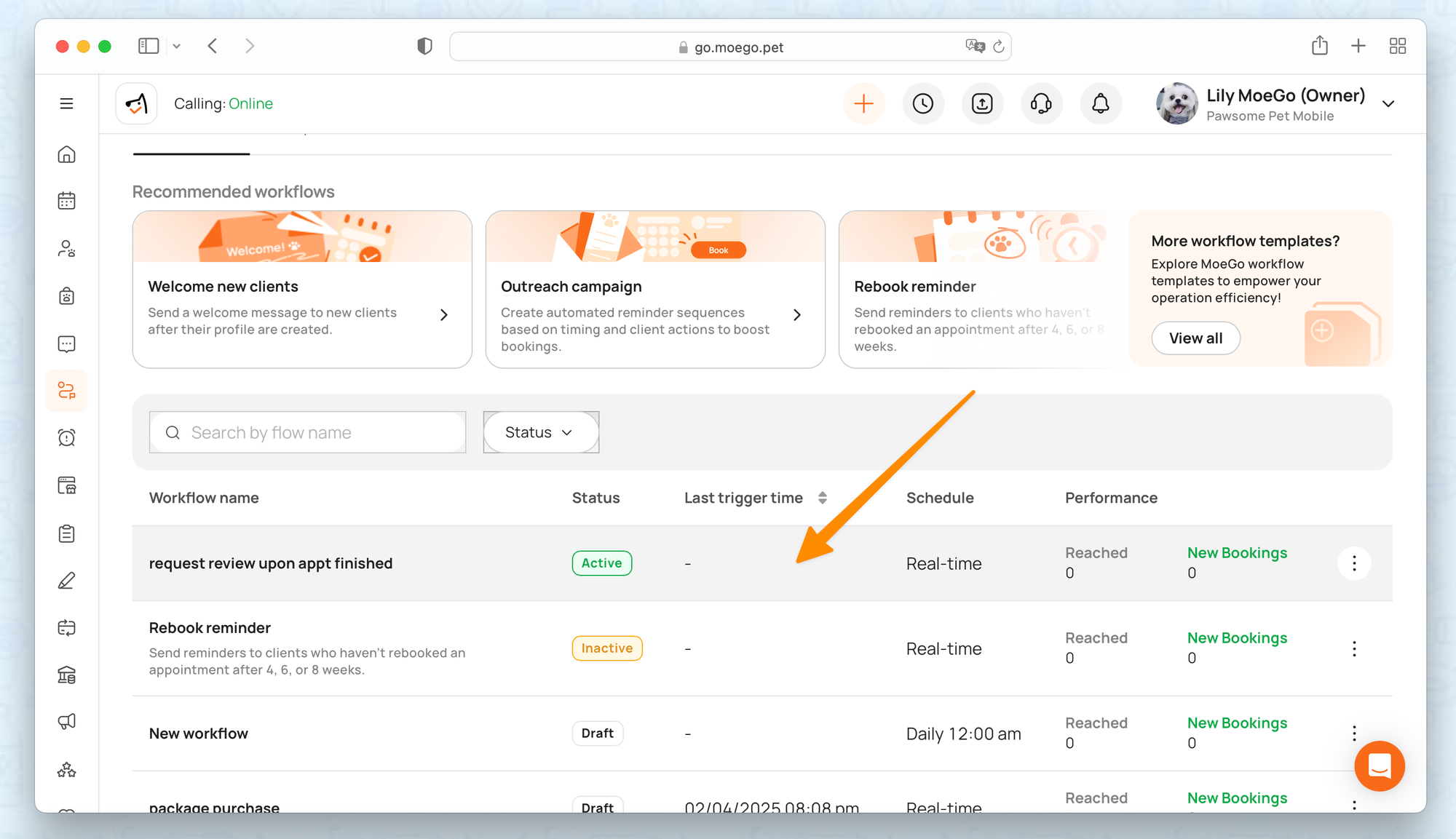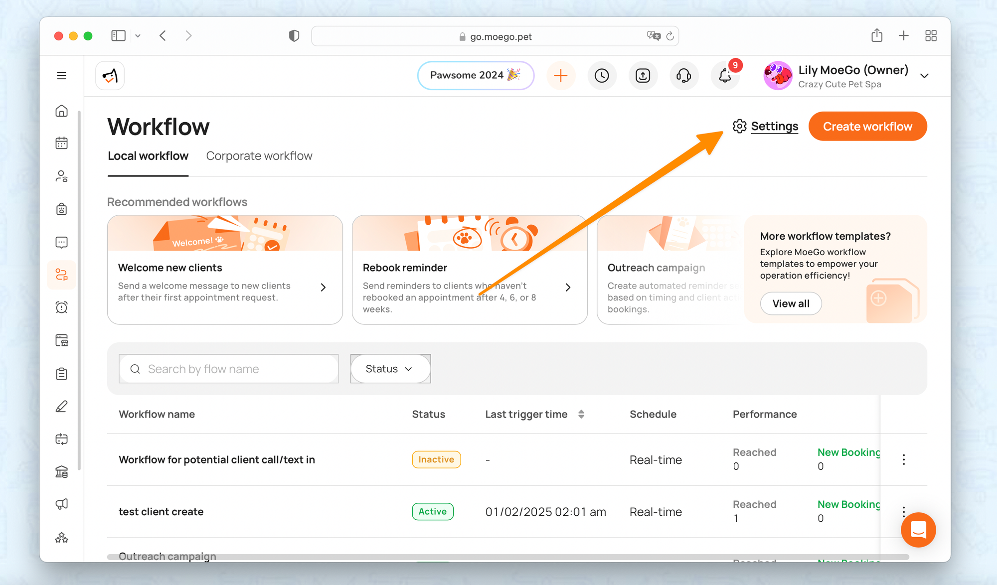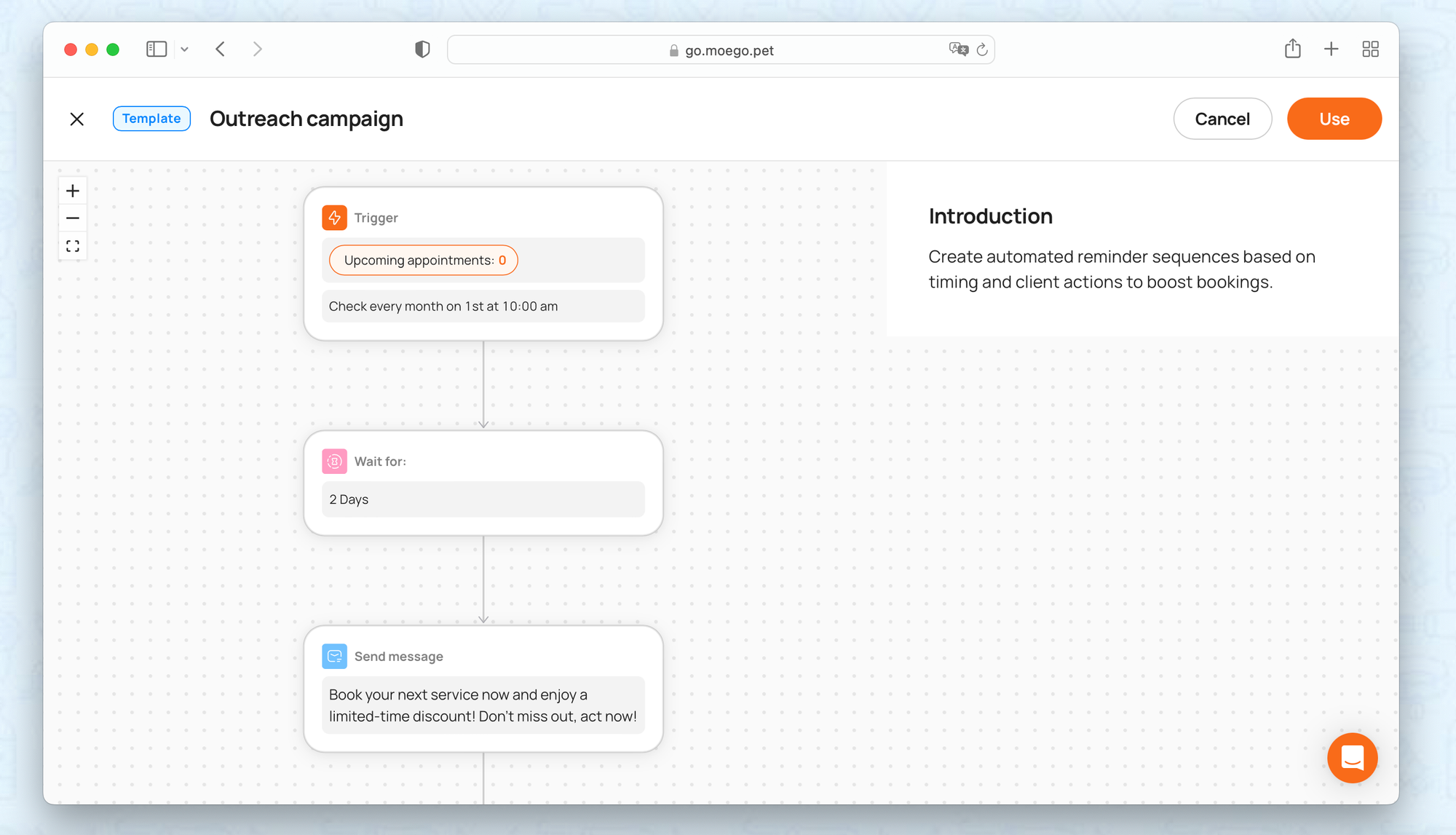 In Moego, an automated flow is a feature that initiates a specific action or experience in response to a particular behavior or event. If you're familiar with other marketing tools, you may recognize automated flows as "automationcards" or "drip campaigns." These flows streamline communication and enhance user engagement by ensuring timely and relevant interactions.