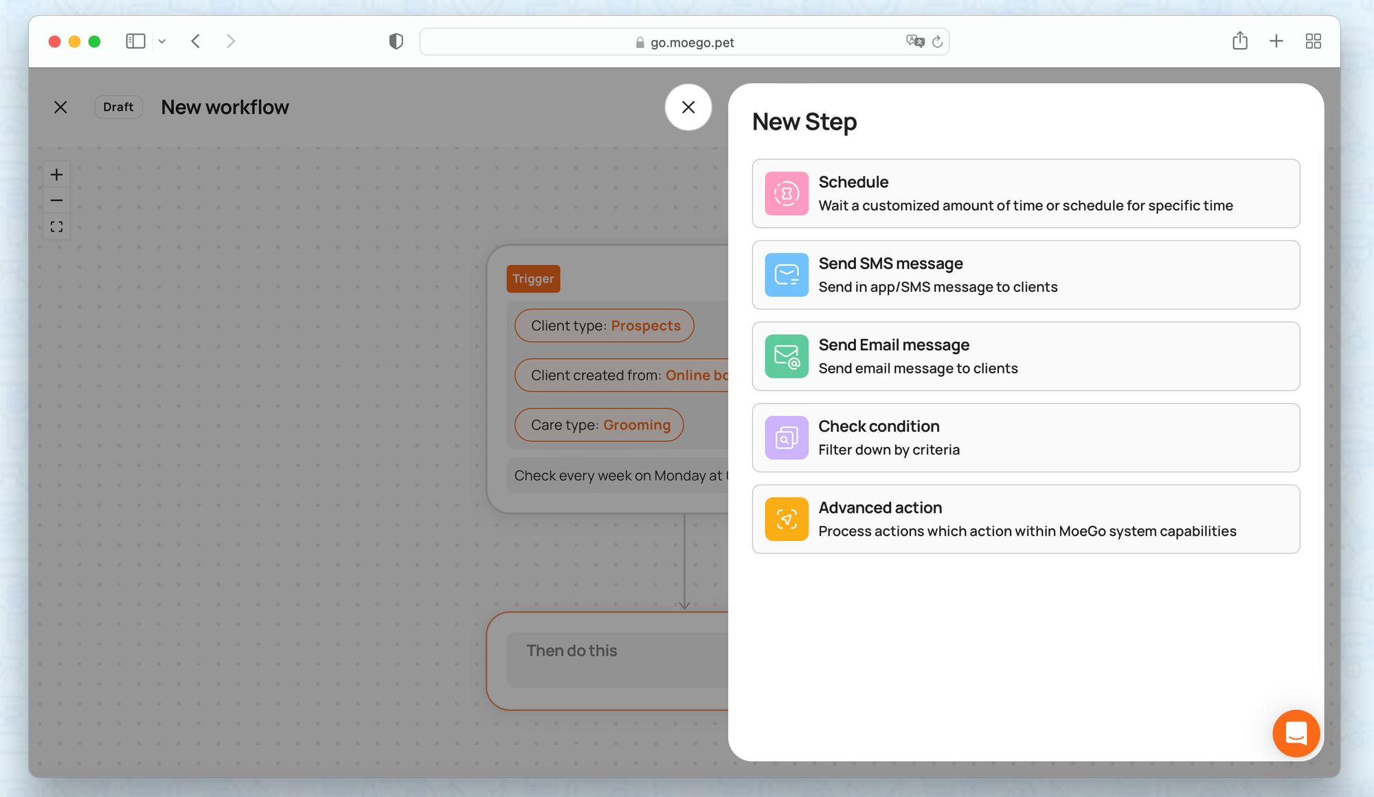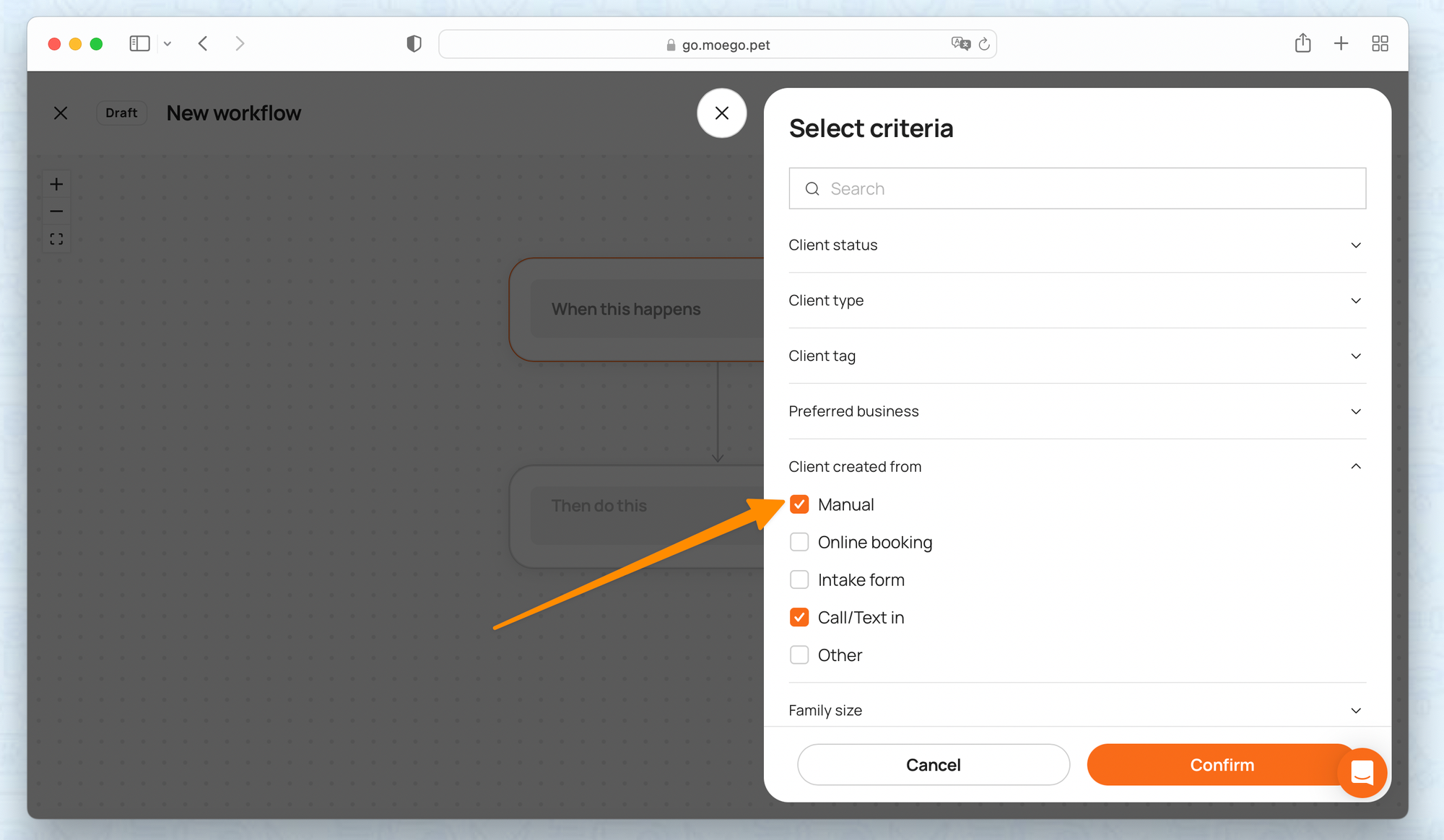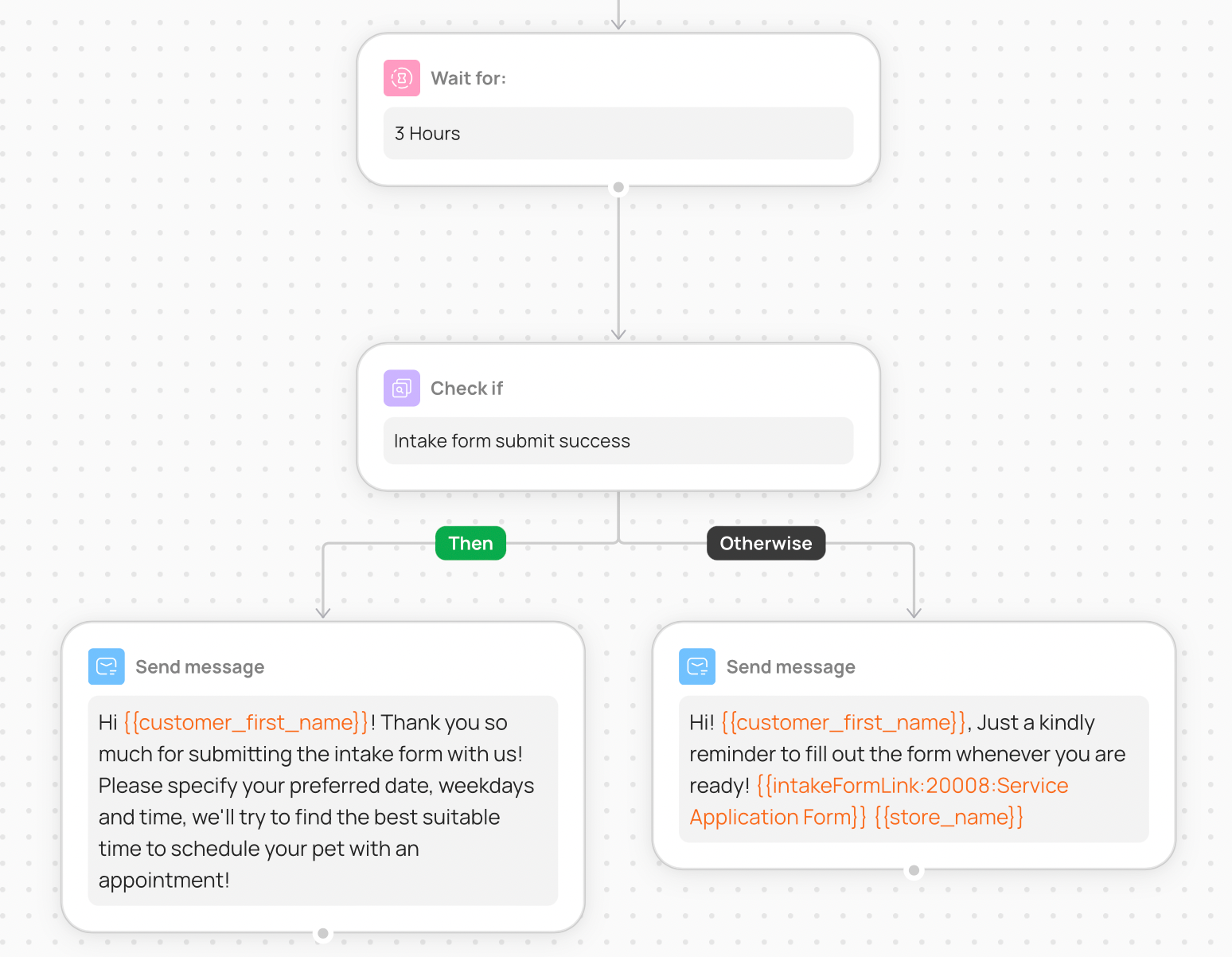 For instance, when you choose the trigger < Client Created > specify that it applies to client groups with the filter < Client Created From 'Manual' or 'Call in/Text in' >, you can set up a subsequent step to automatically send a tailored message to the new client. This message could include an intake form to collect important documents, such as pet vaccination records, agreements, or even prompts for booking their first appointment.