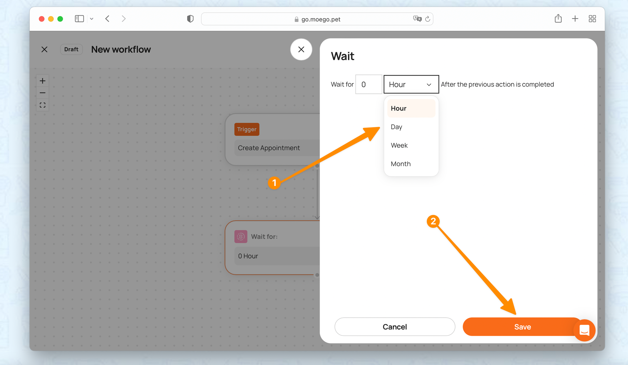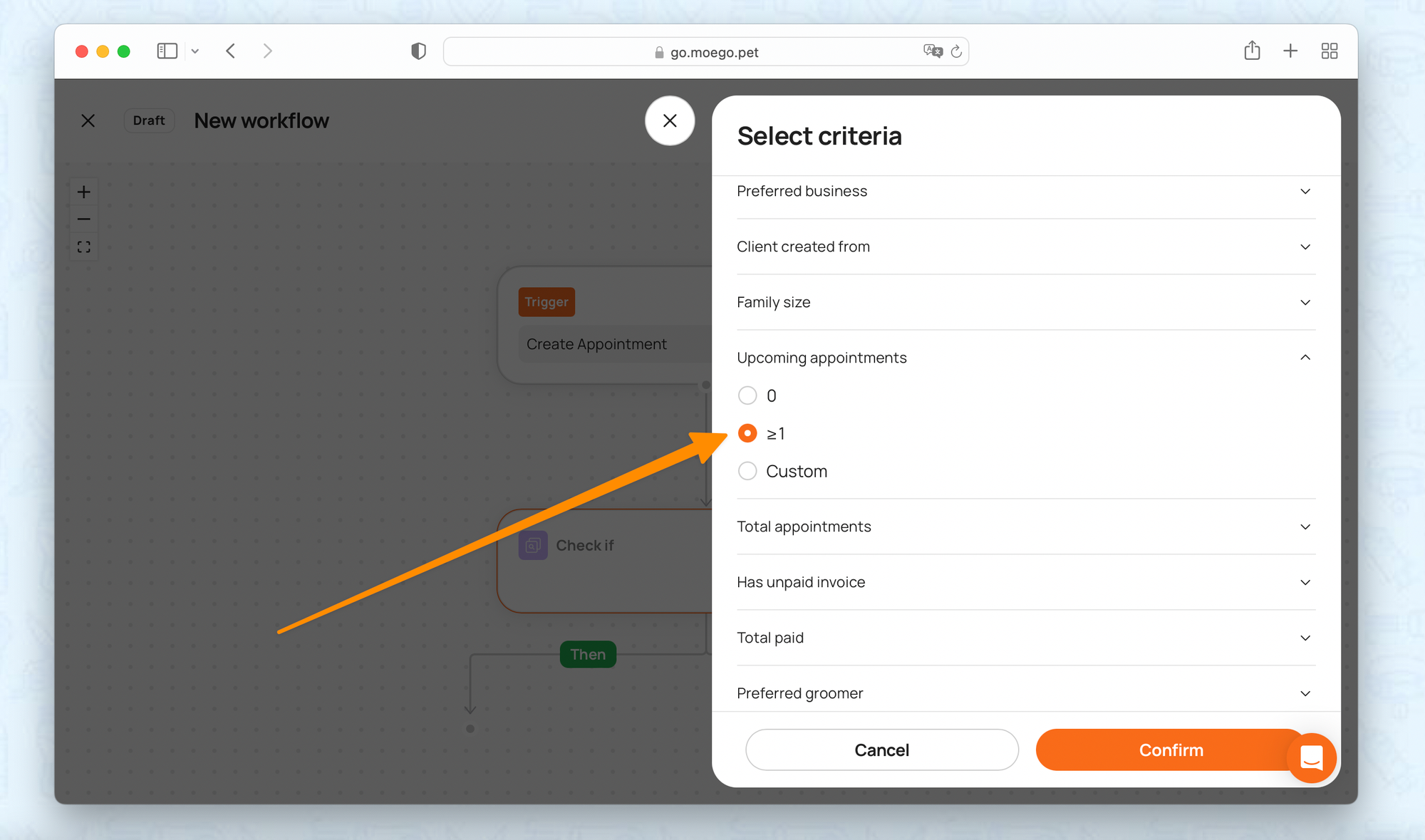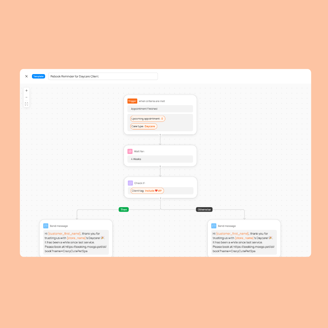 You can establish an advanced rebook reminder specifically for your daycare clients to encourage additional bookings. Begin by selecting a trigger based on completed appointments and wait for four weeks to check if they’ve scheduled any upcoming appointments.