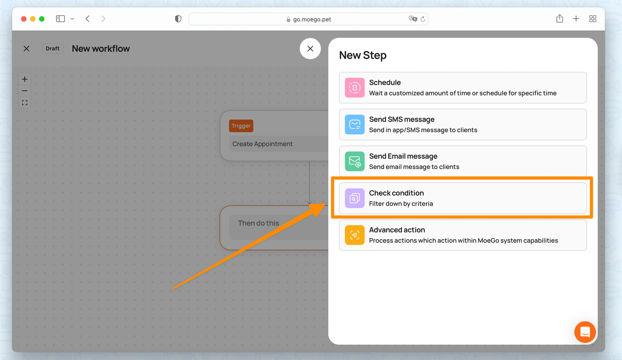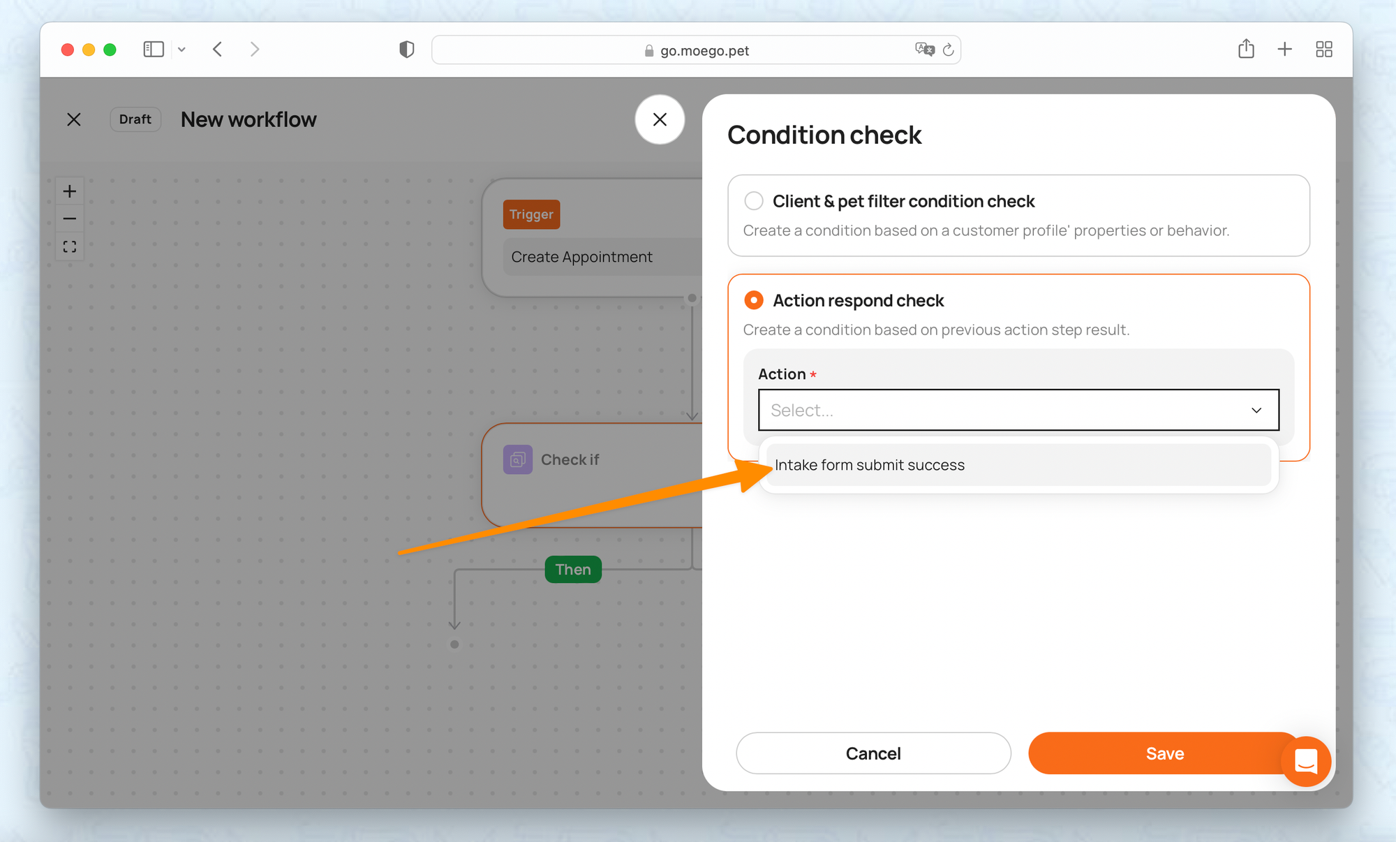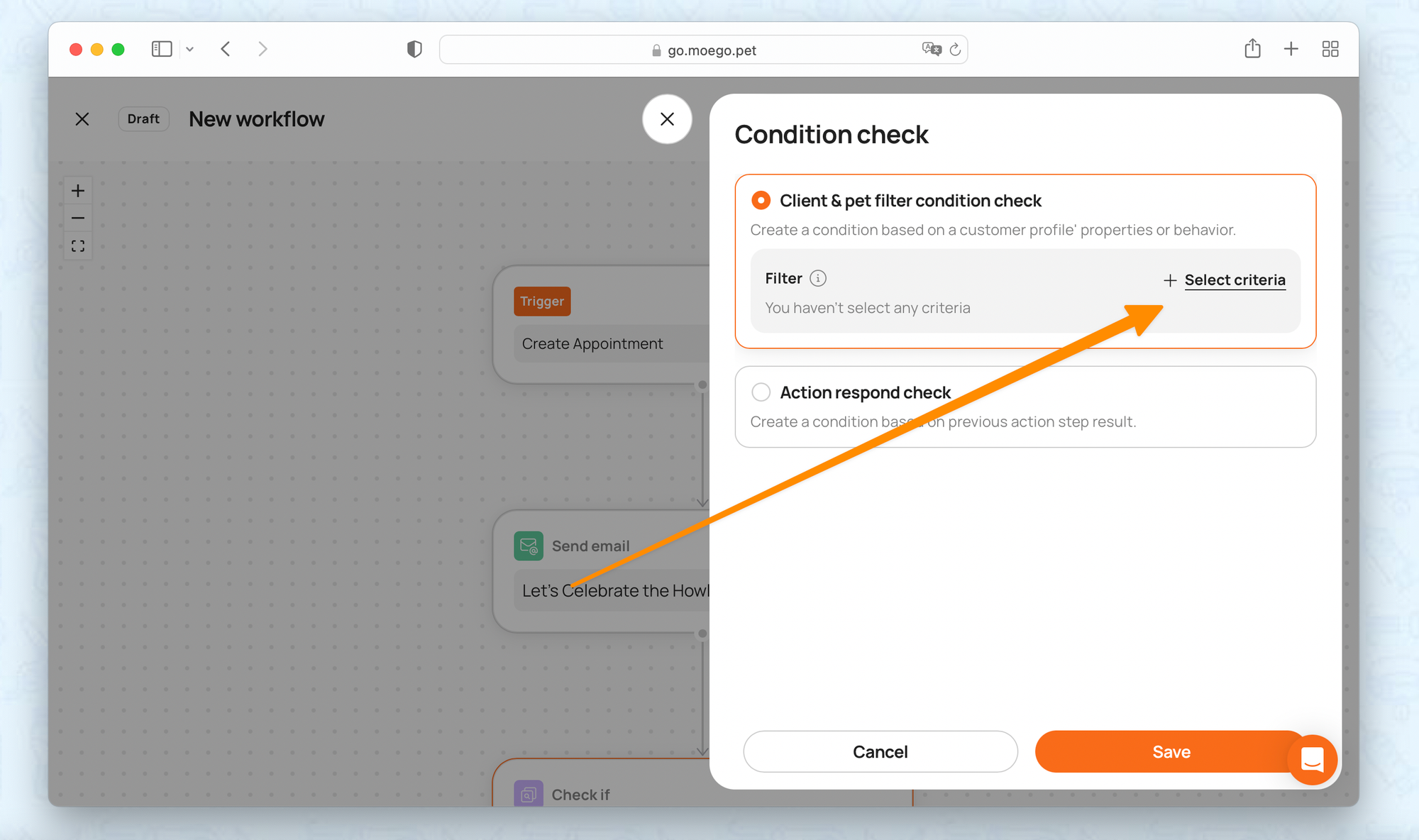 Type 1: Client & Pet Filter Condition Check: Configure the condition using client and pet filters as your criteria