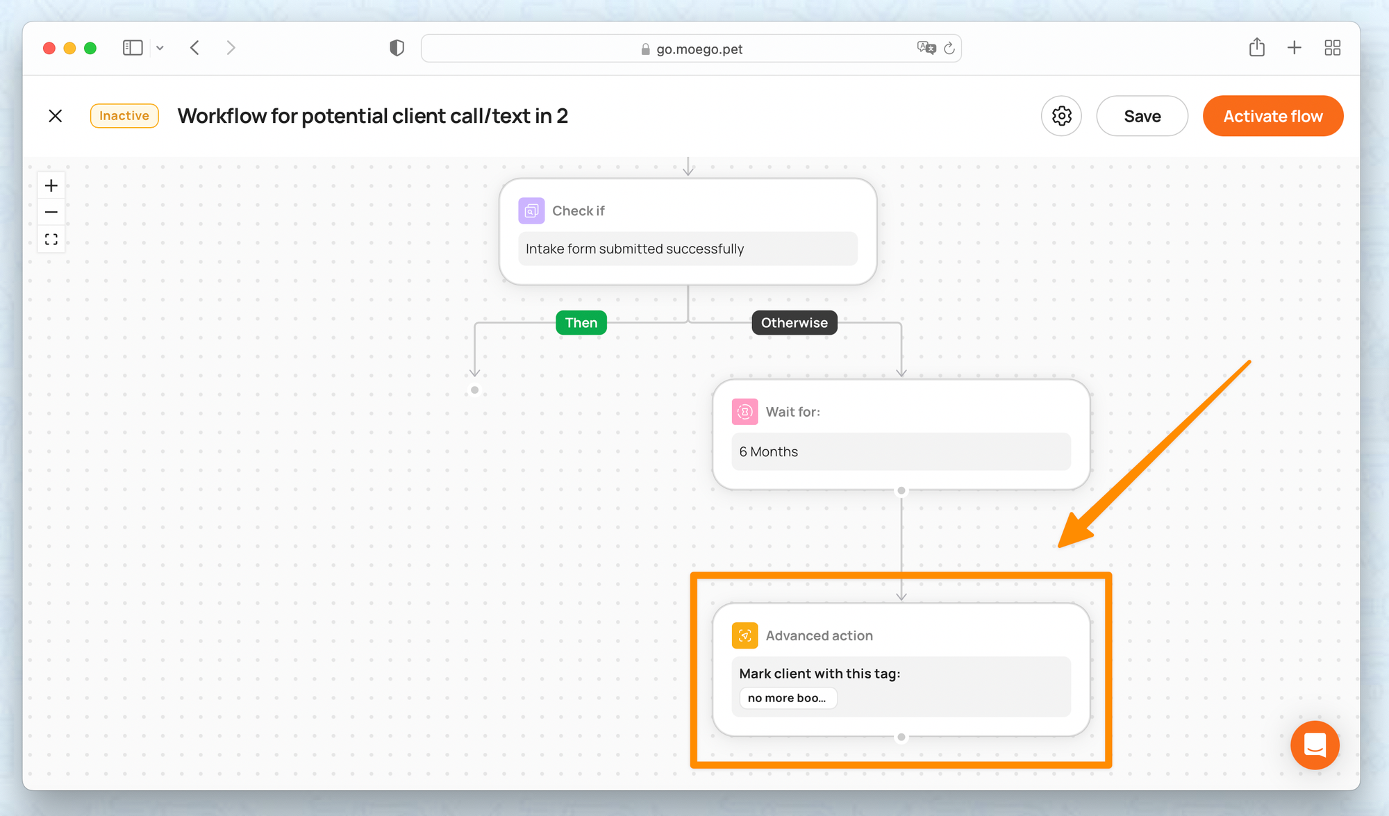 - For instance, similar to the previous example, if a client doesn't meet certain conditions (Otherwise)—such as having less than one upcoming appointment scheduled, or if they haven't responded to your message after an extended period of several months—you can utilize advanced actions to add a client tag, such as "No Response" or "Inactive Client". This helps you easily manage and categorize your clients based on their engagement levels.
