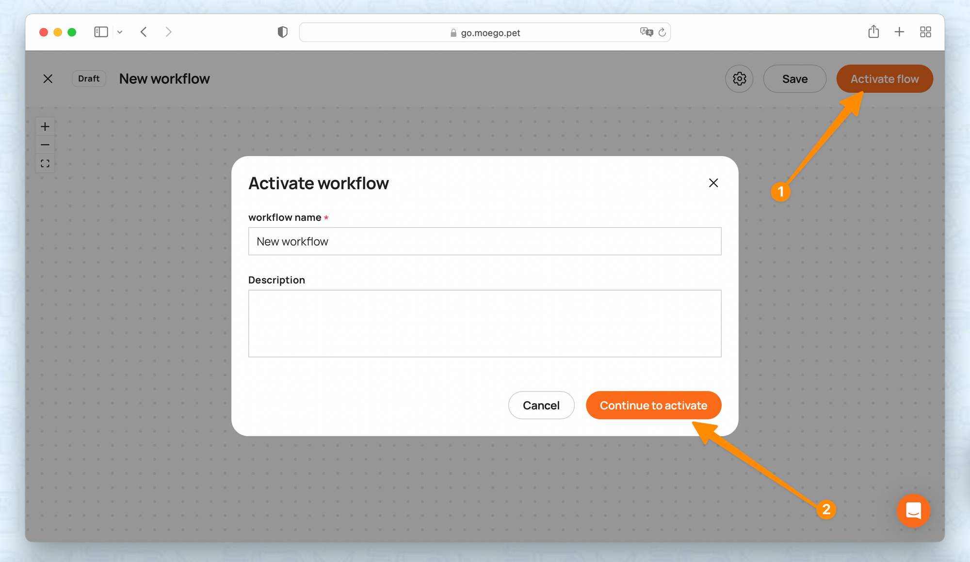- Click on < Continue to Activate > to proceed with saving your workflow