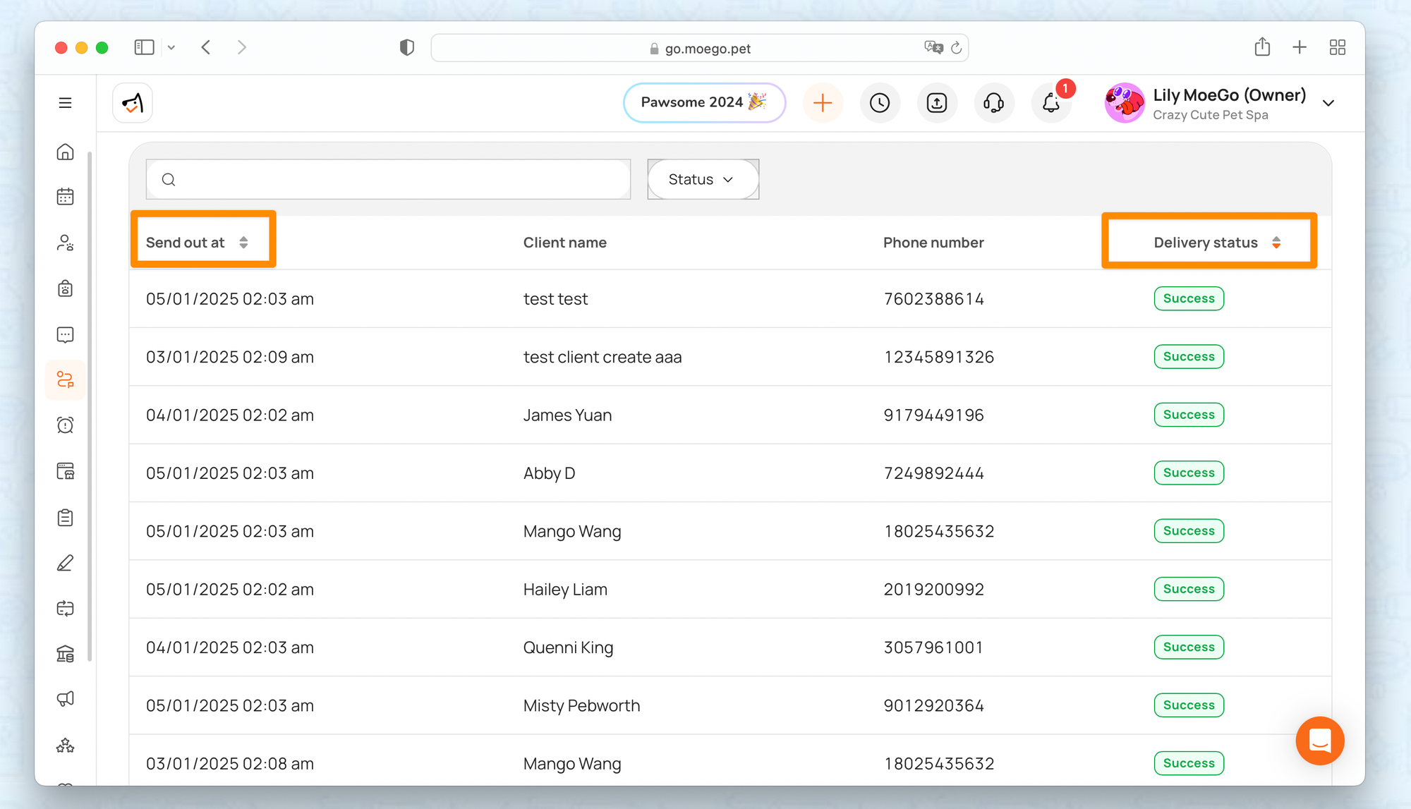 - The recipient history will display sent out time, client name, phone number/email, and delivery status.