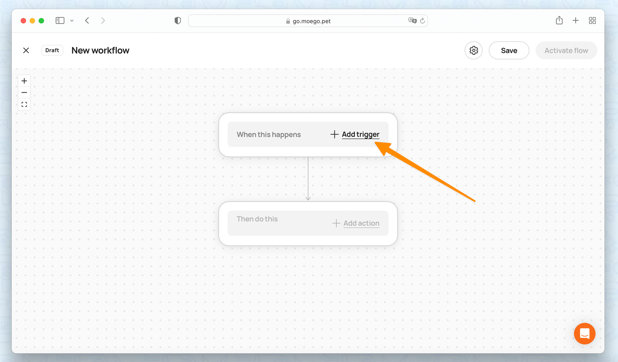 You will need to add a trigger by clicking on < Add Trigger > to start your workflow: