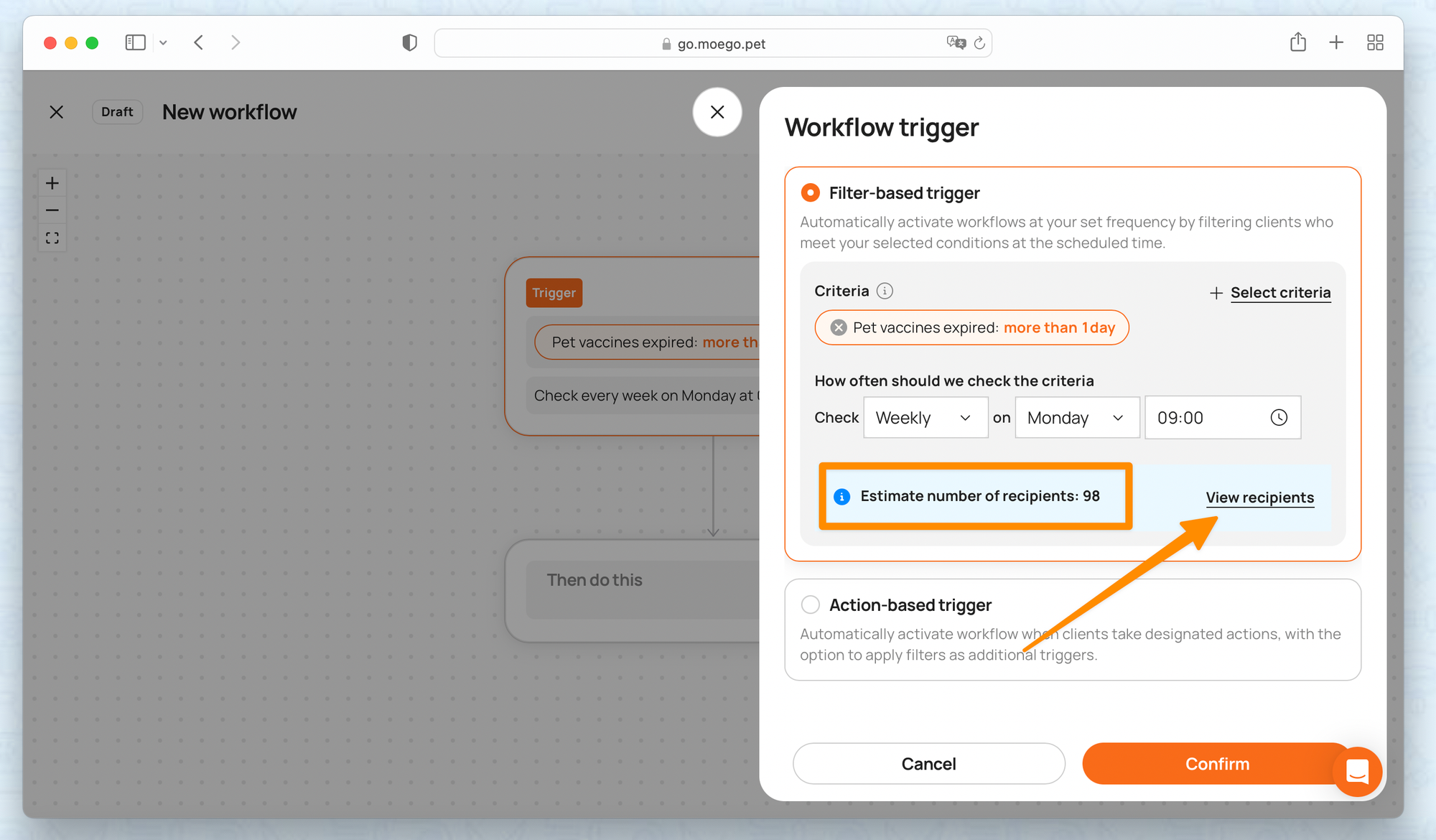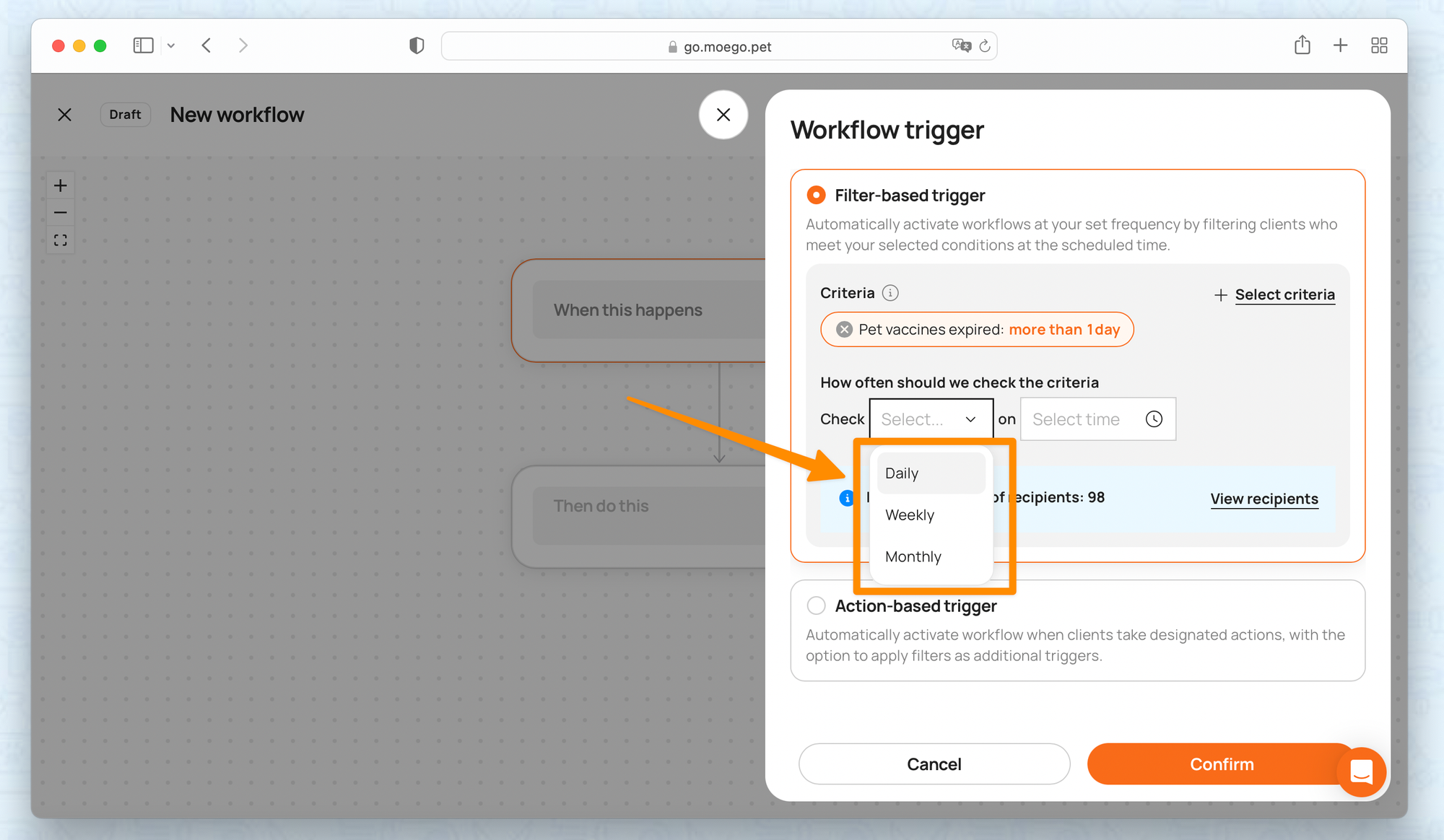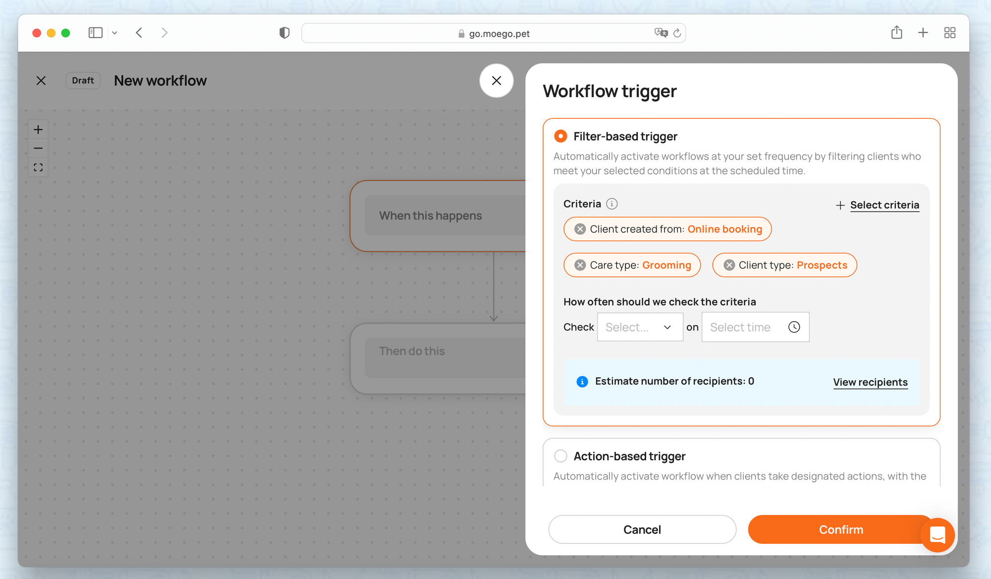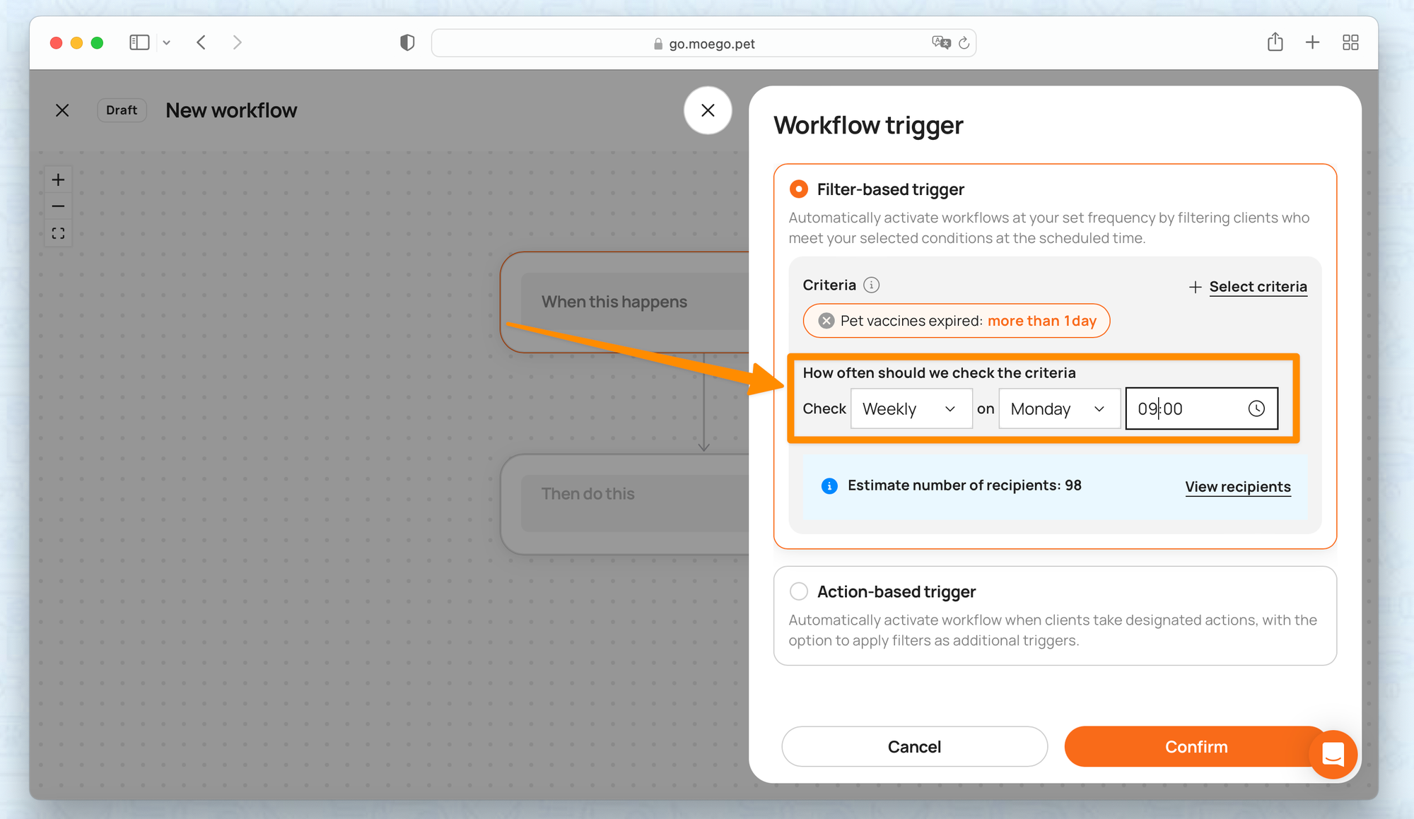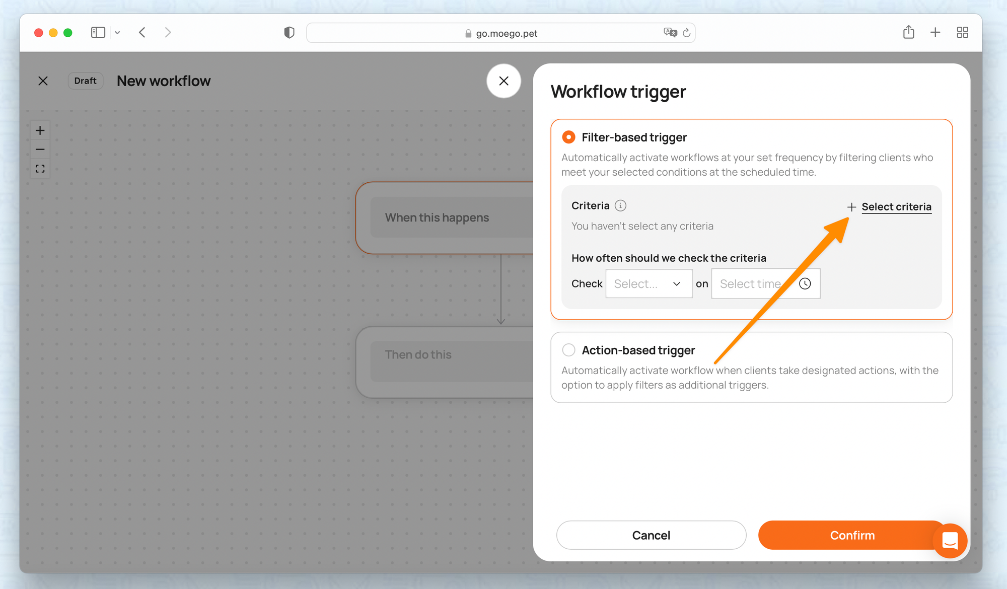 Set up a Filter-Based Trigger to automatically activate the workflow at your desired frequency—daily, weekly, or monthly—by selecting a specific client group filter. The system will run the filter at the scheduled time, ensuring that your workflows target the right clients exactly when you want to engage with them.