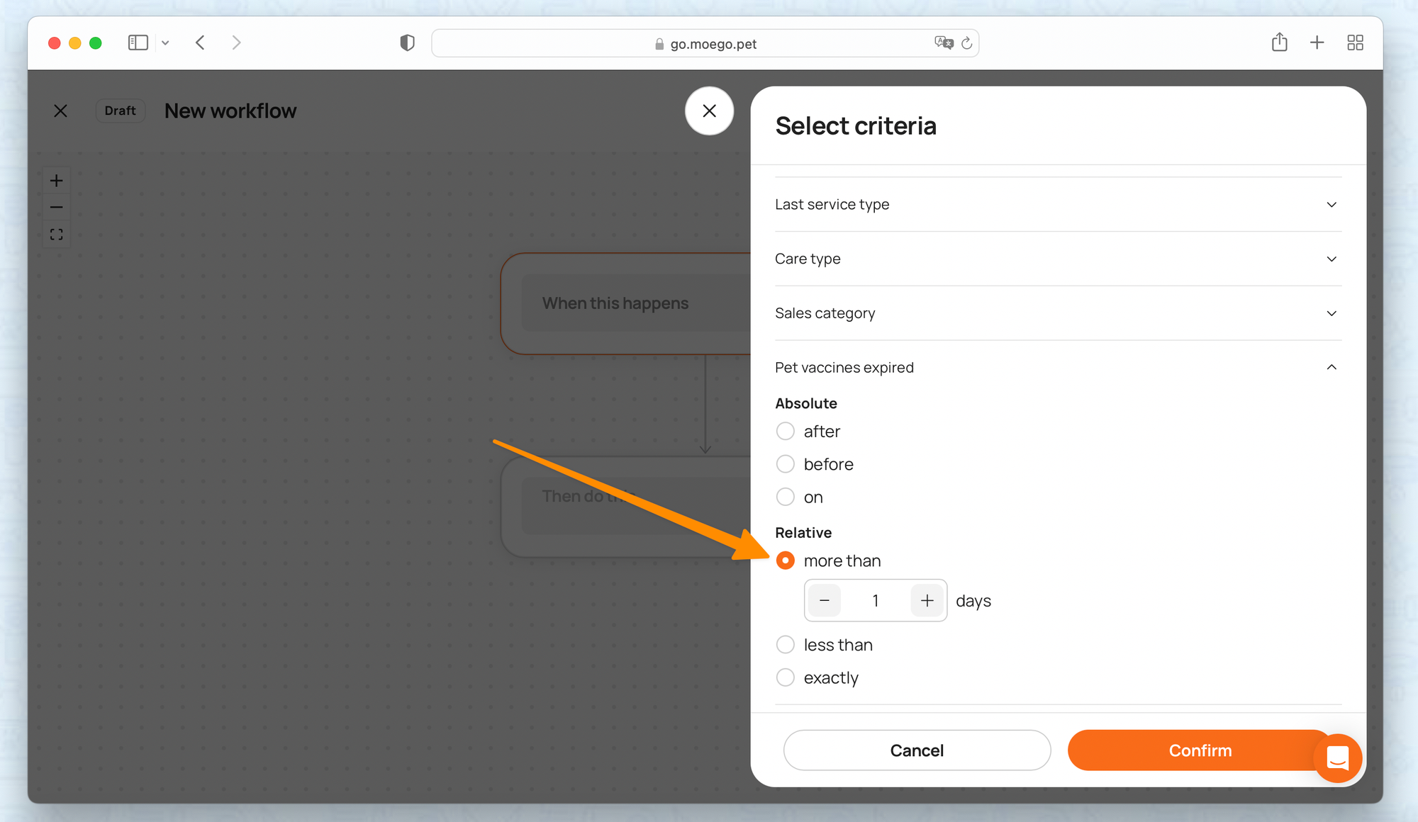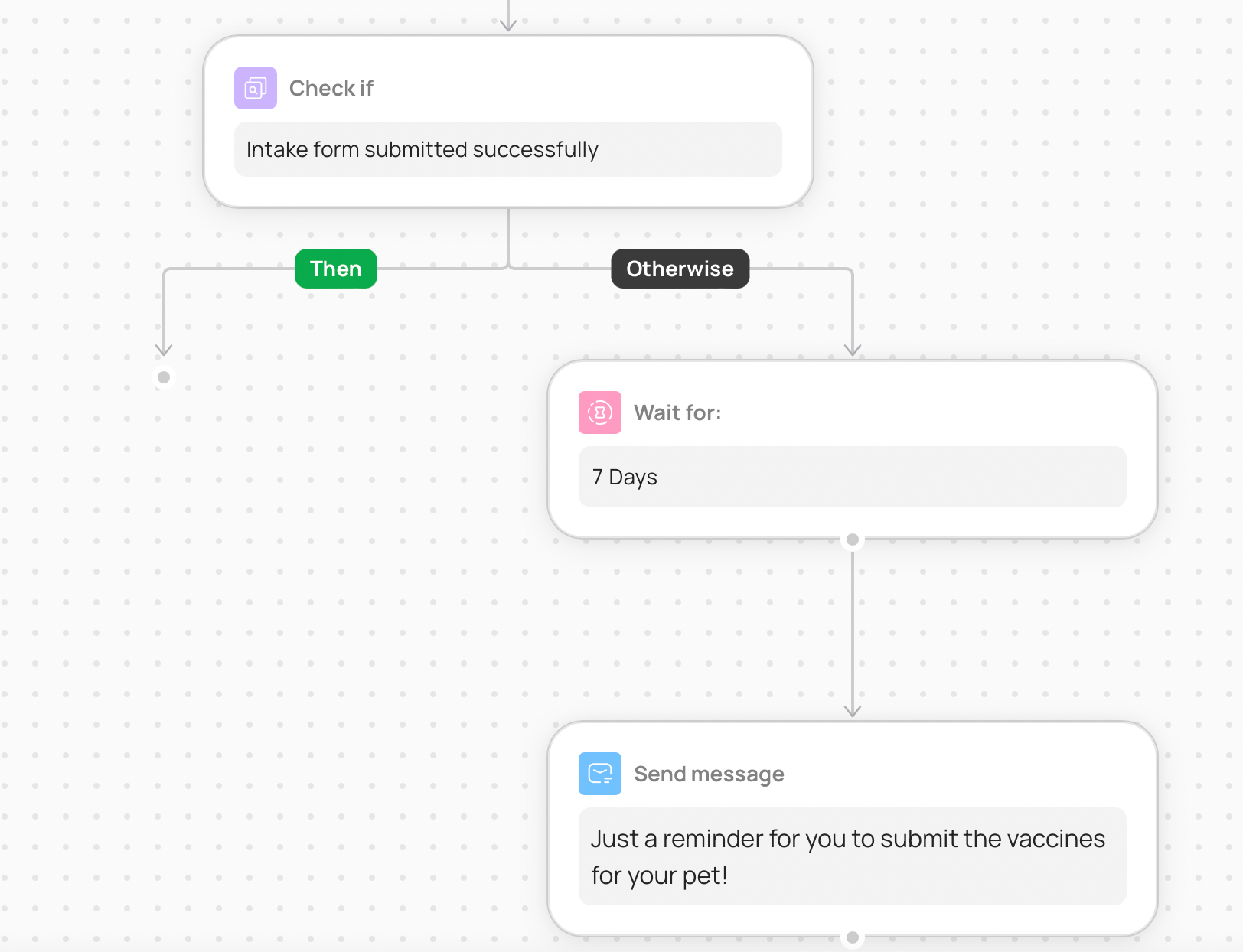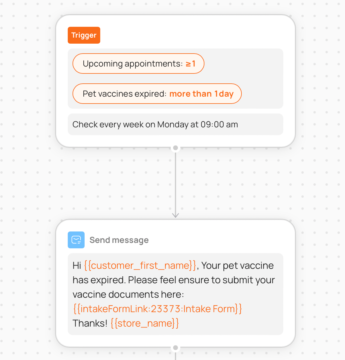 Similarly, maintaining up-to-date vaccine records for your pets is crucial for the health and safety of all animals in your care. By establishing a trigger with a filter such as < Pet Vaccine Expired More Than X Days > , you can automate the collection of vaccine documents. This can be achieved by sending an automated message to clients when they schedule an appointment or based on a customized time frequency you've taliored with. This proactive approach ensures compliance with vaccination requirements and enhances the safety of your pet care environment.