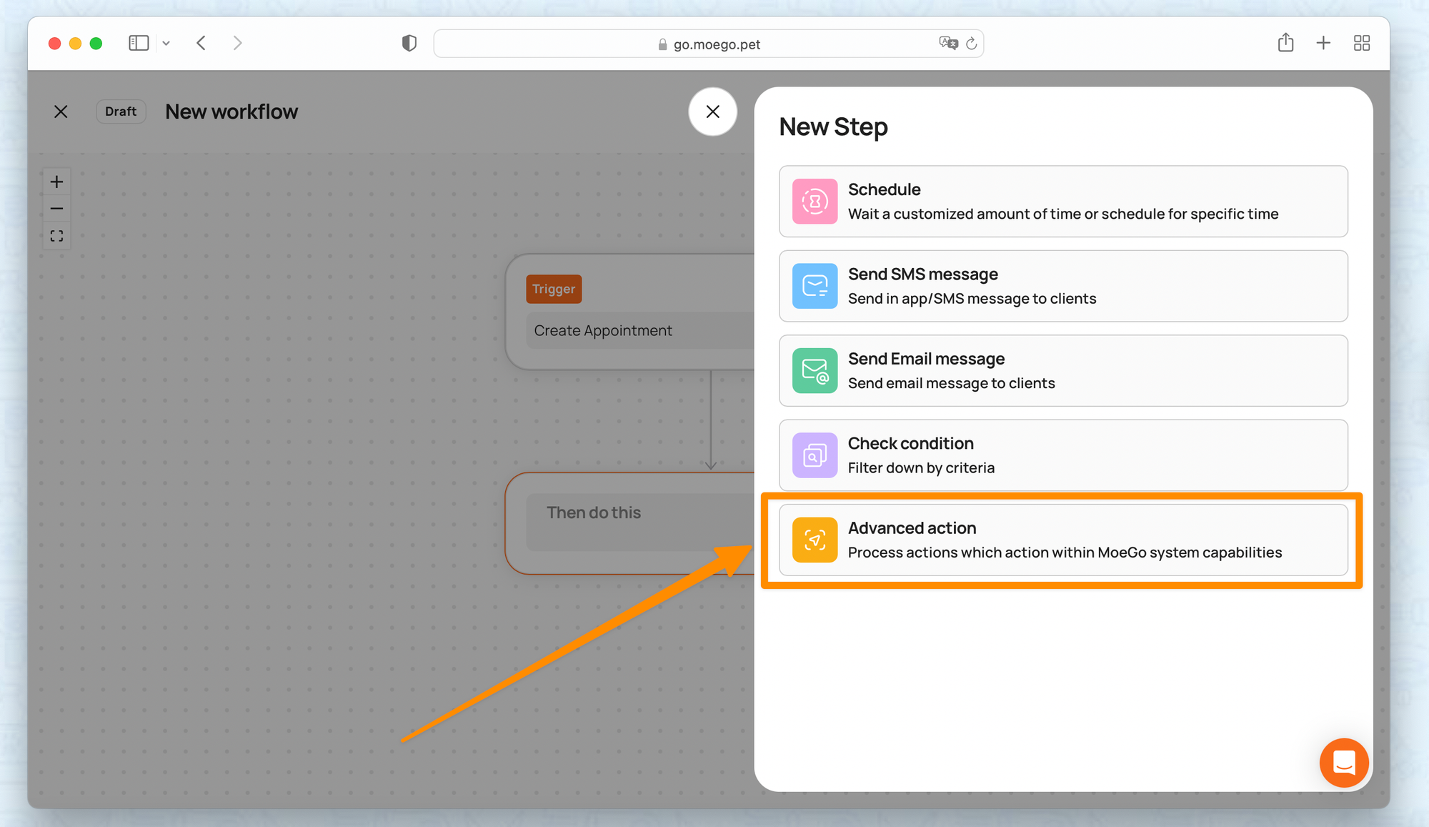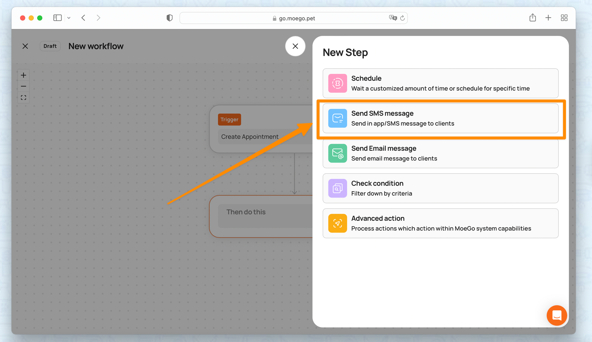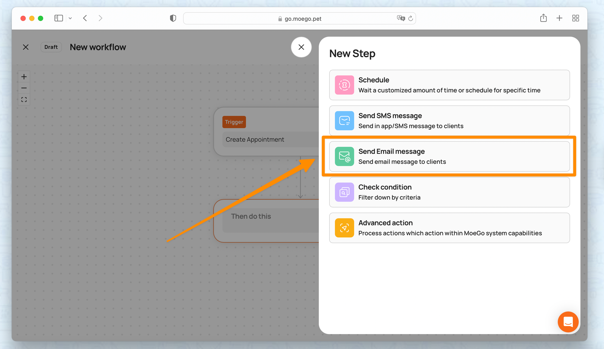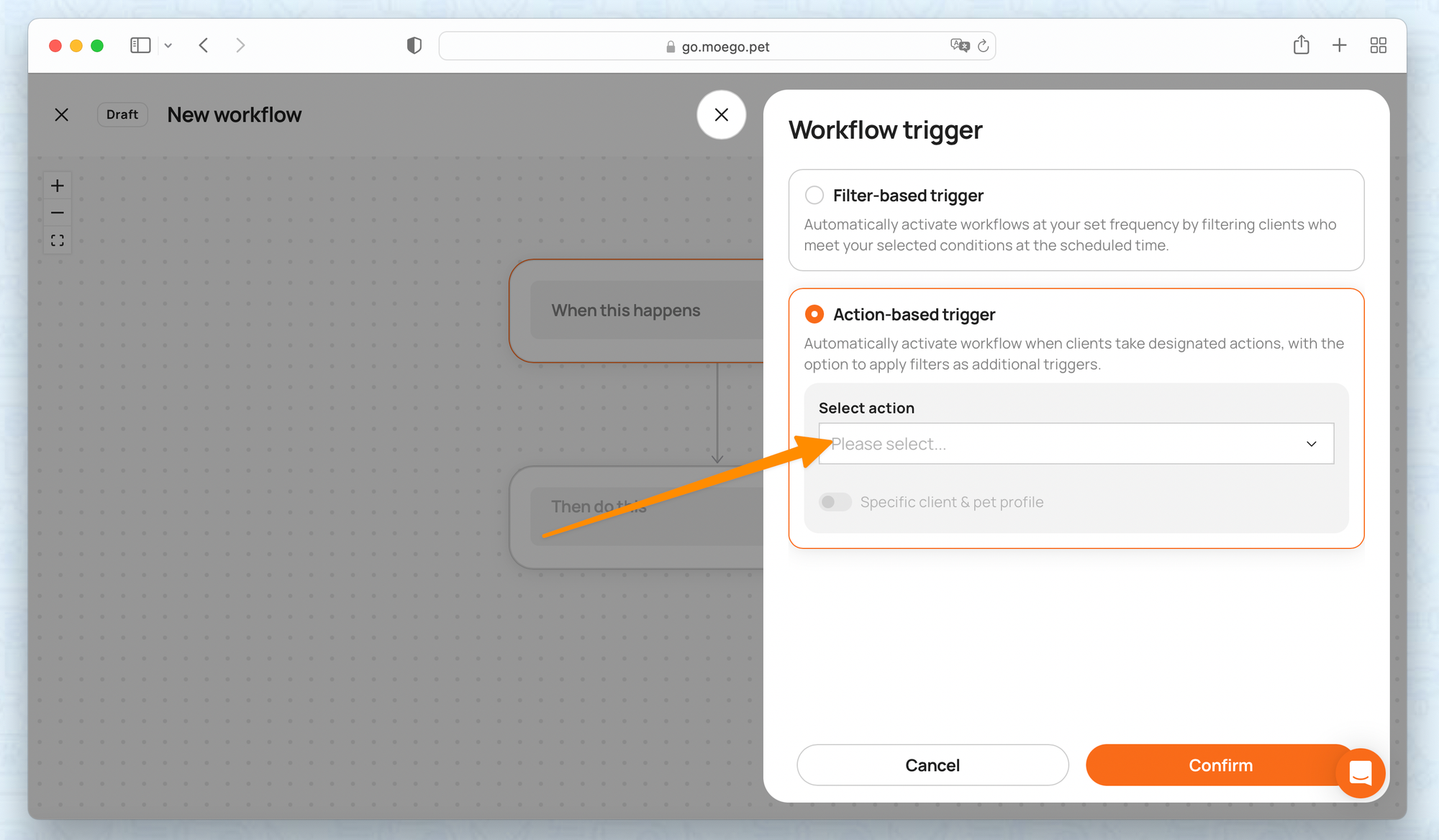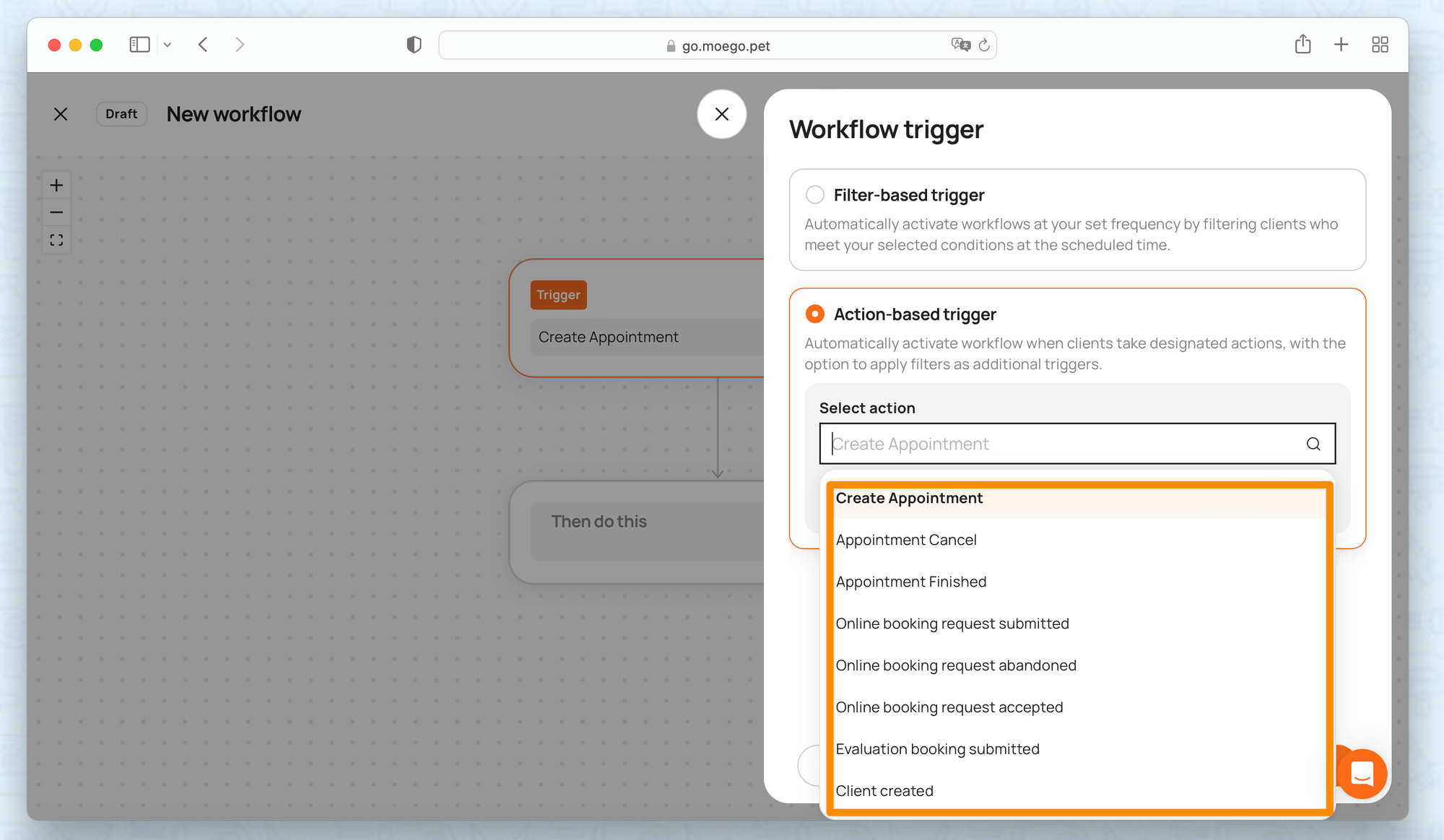 - Select an action like: < Client Created >, < Appointment Cancel >, < Online booking request submitted >, etc.