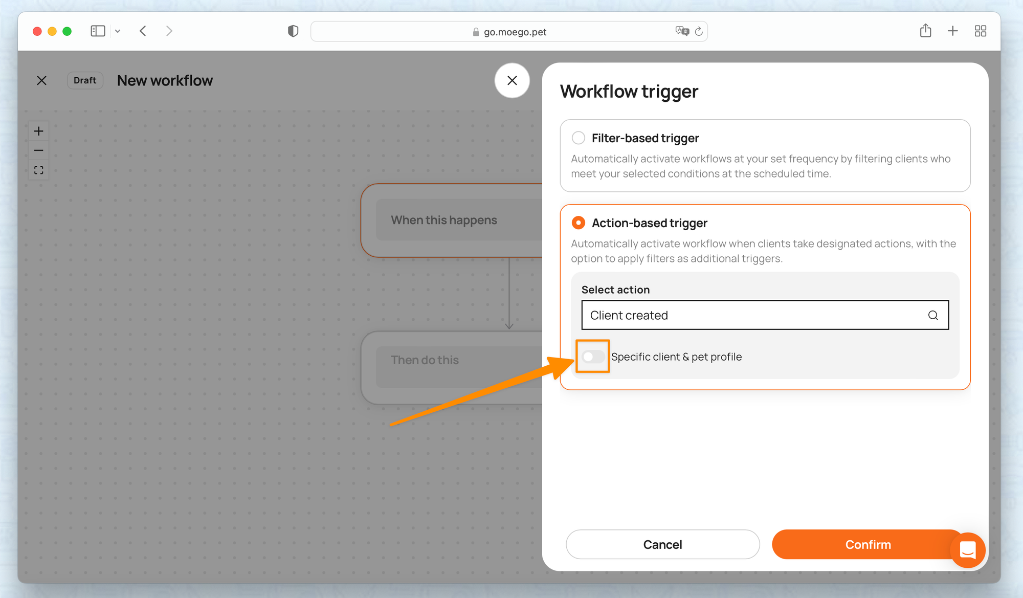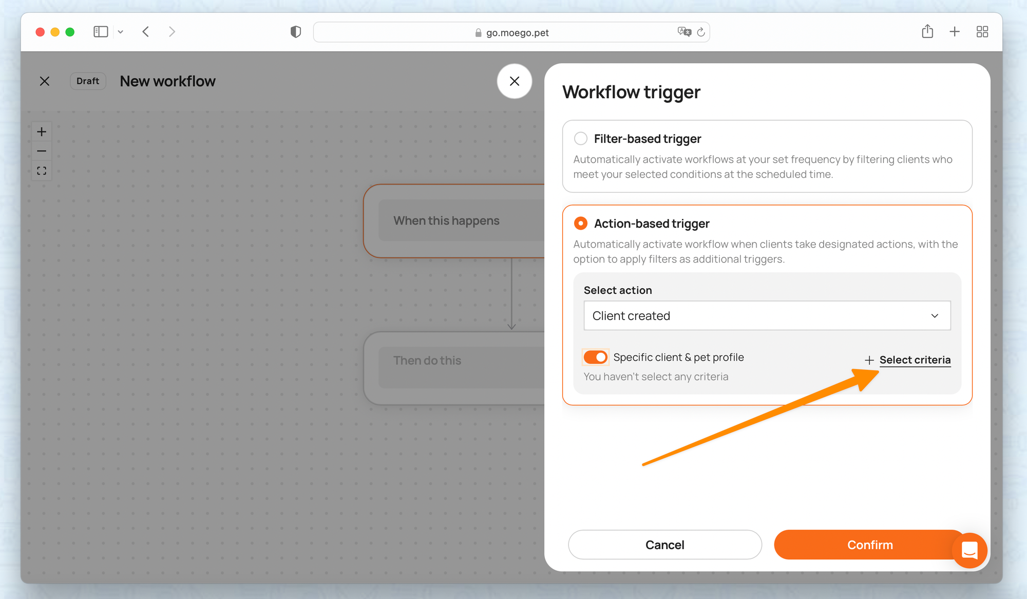 - Select Specific client & pet profile (optional): Narrow down the specific client & pet group to ensure the workflow only starts when actions occur for this particular group of clients.
