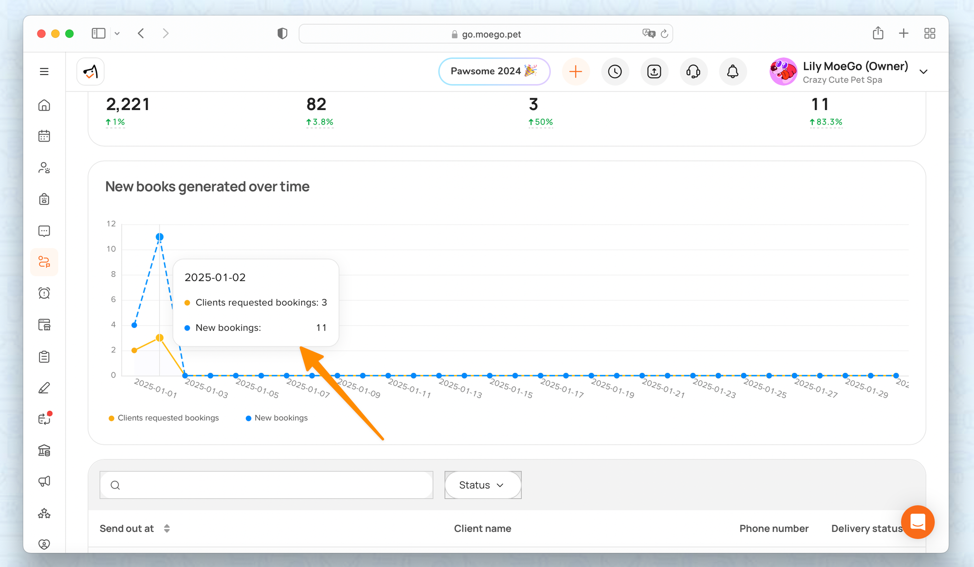- This graph visually represents the trend of new appointments created over a specified period and compares between client-requested bookings and new bookings generated.