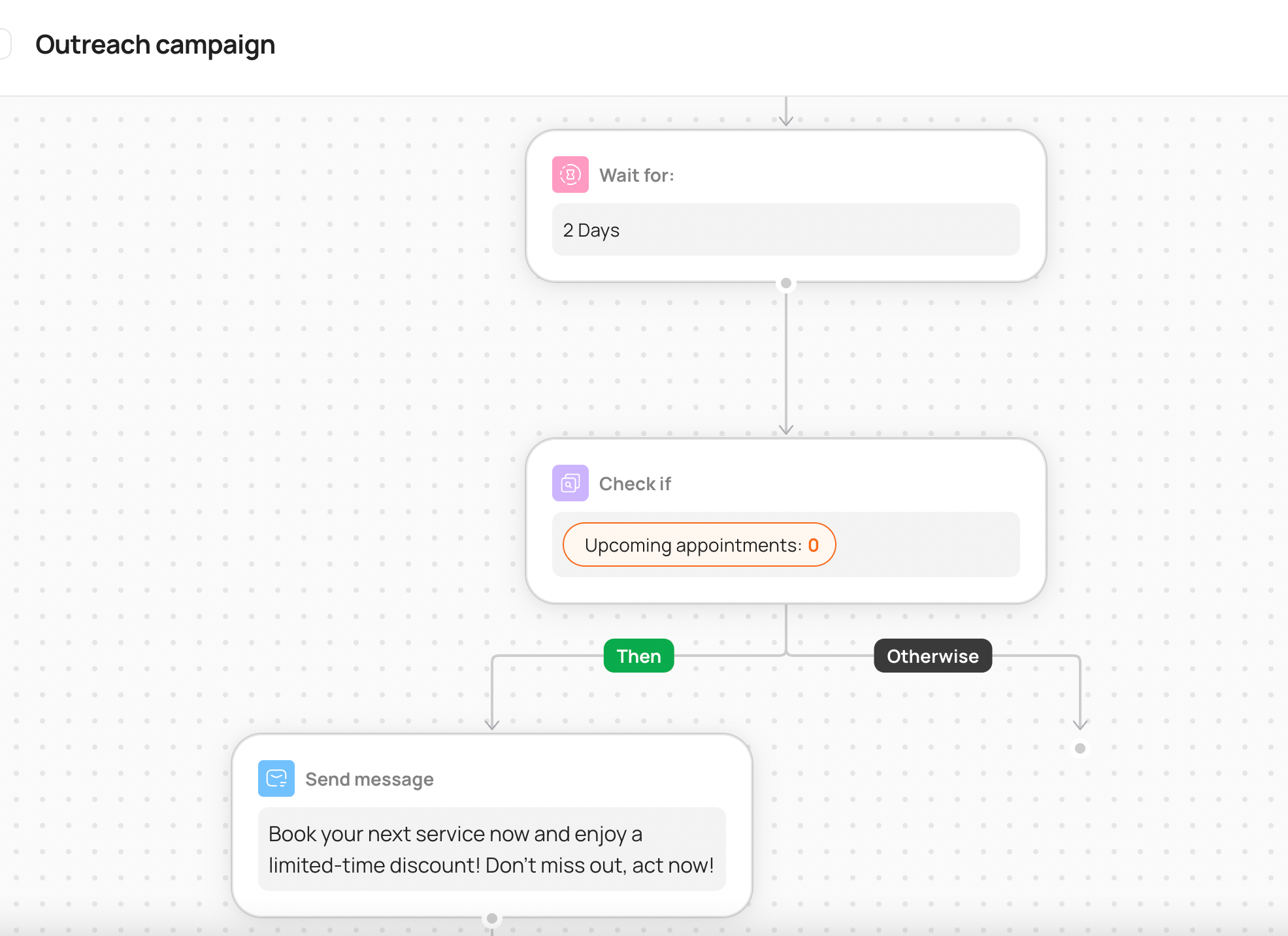 The Outreach Campaign Workflow Template is designed to automatically send reminders based on timing and client actions to encourage bookings. Each Monty on 1st at 10 AM, the system will check for clients with the filter < 0 upcoming appointments >. If a client has no upcoming appointments scheduled, the system will wait two days before sending a campaign message to prompt them to book.