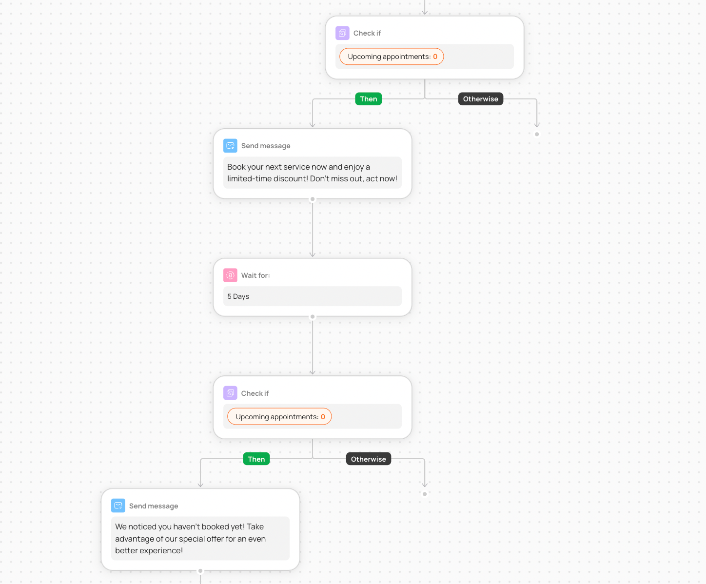 For instance, after a two-day delay, check if the client has zero upcoming appointments. This will ensure the message will only be sent to the client who are still under 0 upcoming appointment status.