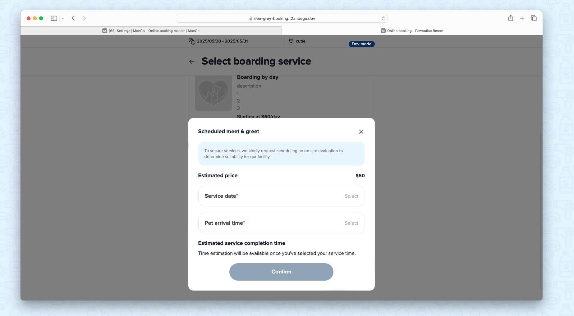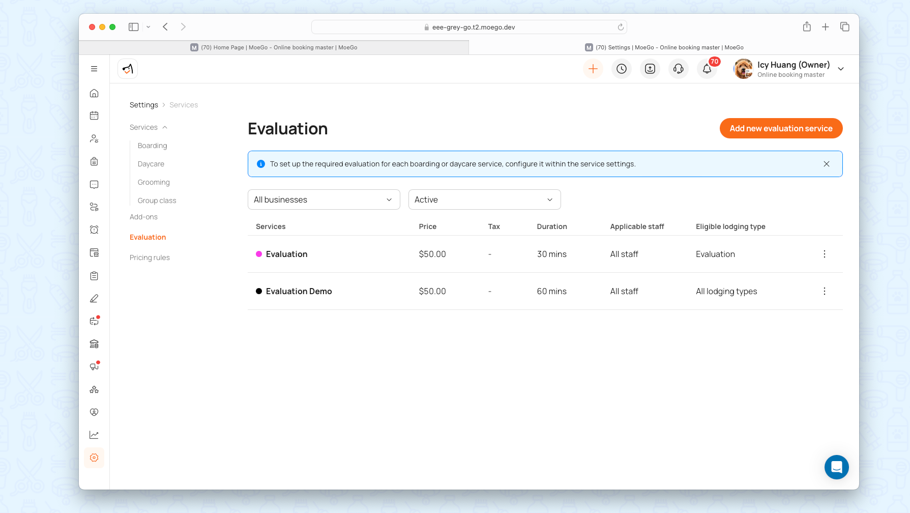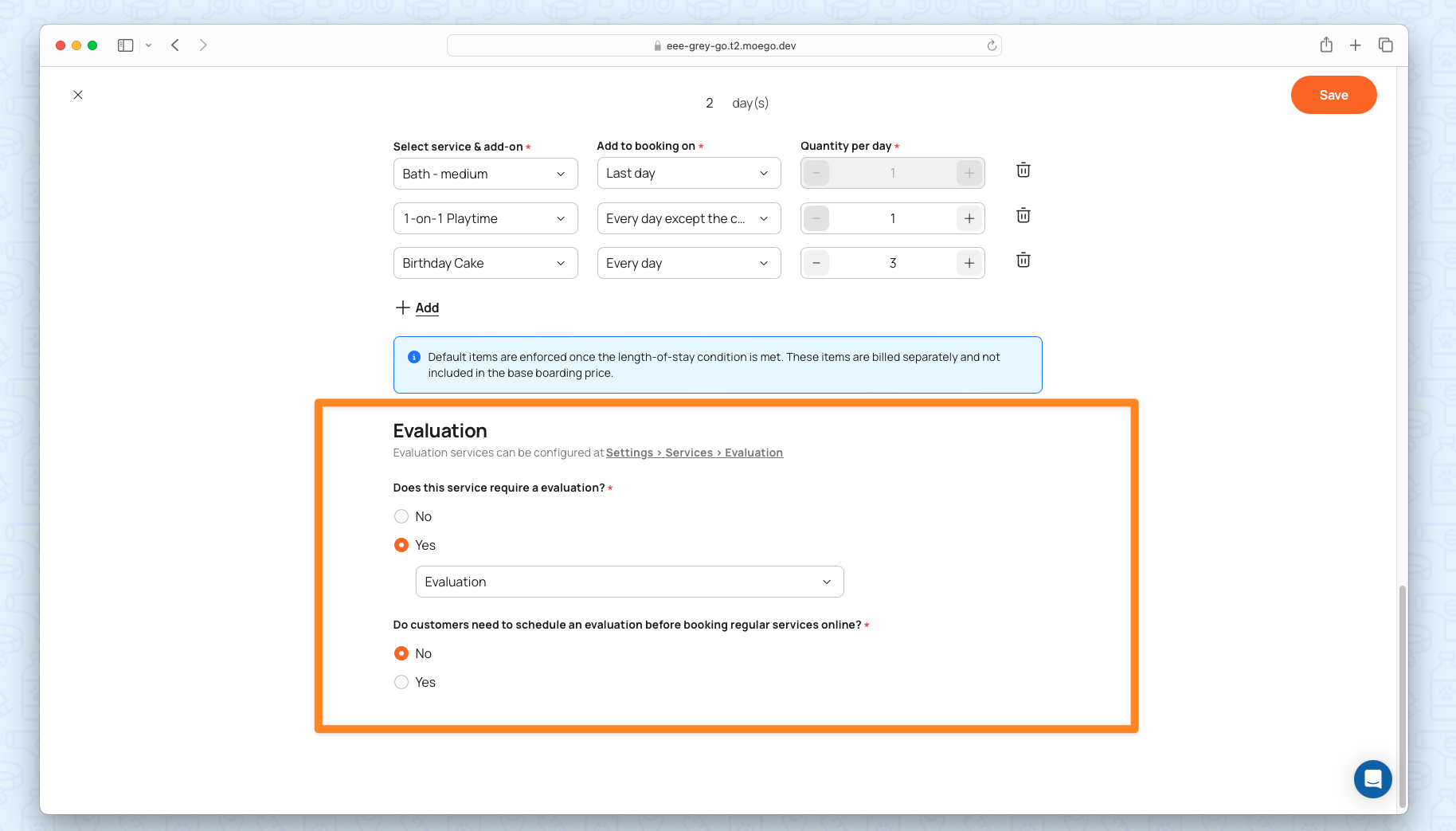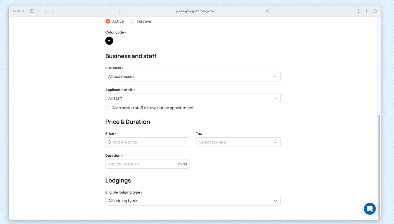 MoeGo’s Evaluation by Service feature allows businesses to set customized evaluation requirements for each service (e.g., Daycare or Boarding) rather than just per care type. This ensures pets meet safety and operational standards before accessing specific services, improving care quality while streamlining bookings. Businesses can: