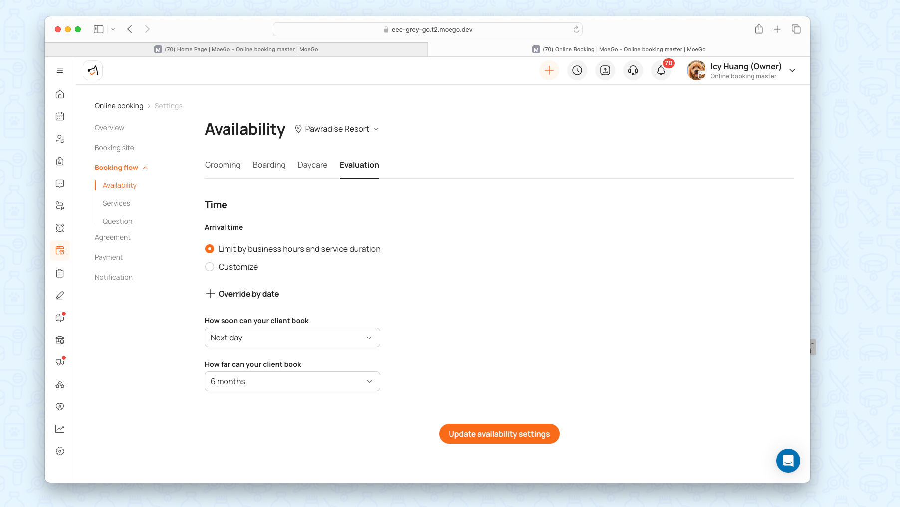 Navigate to Online Booking > Settings > Availability > Evaluation to: