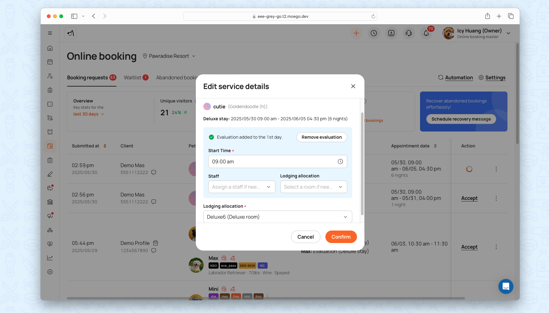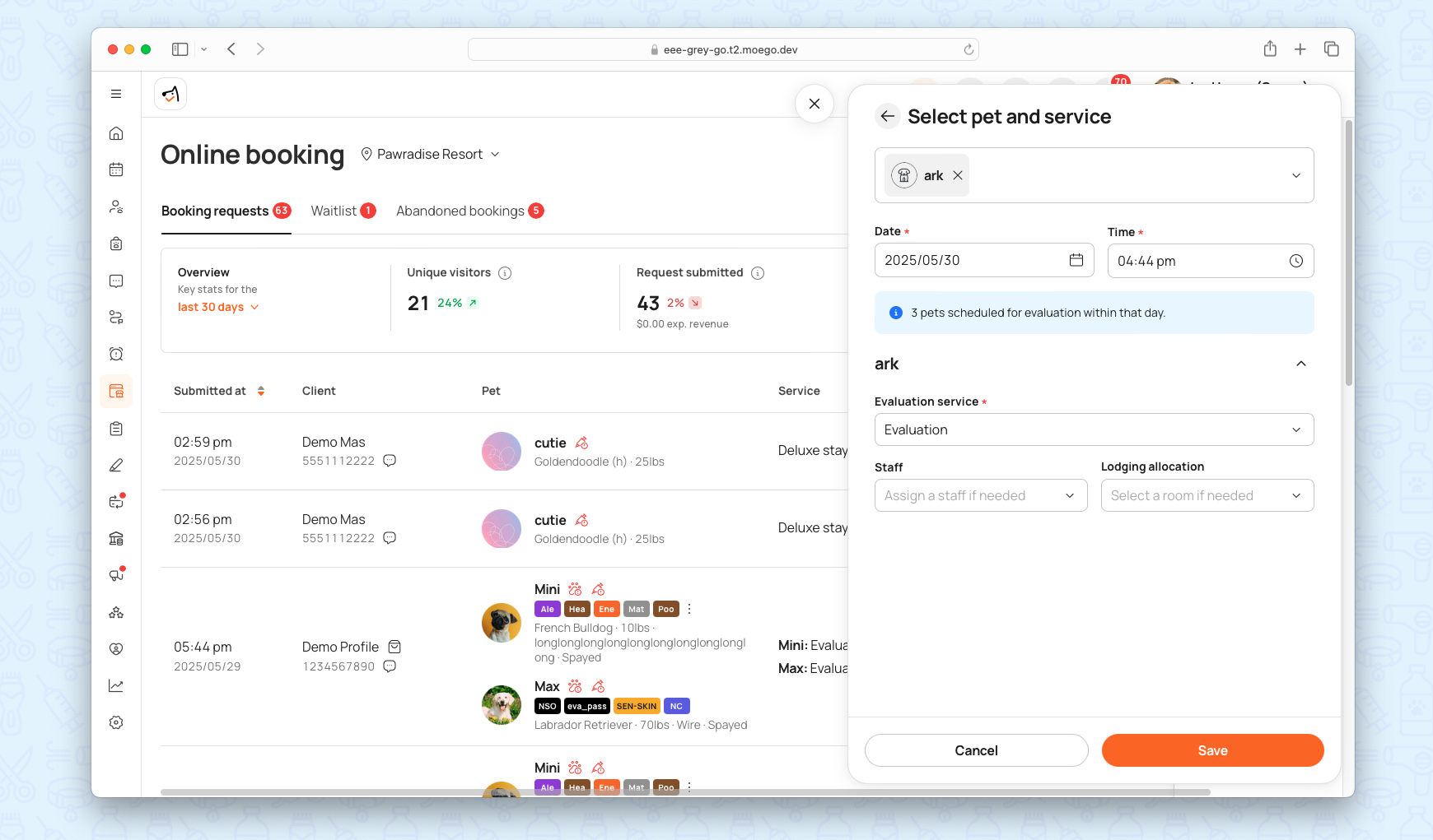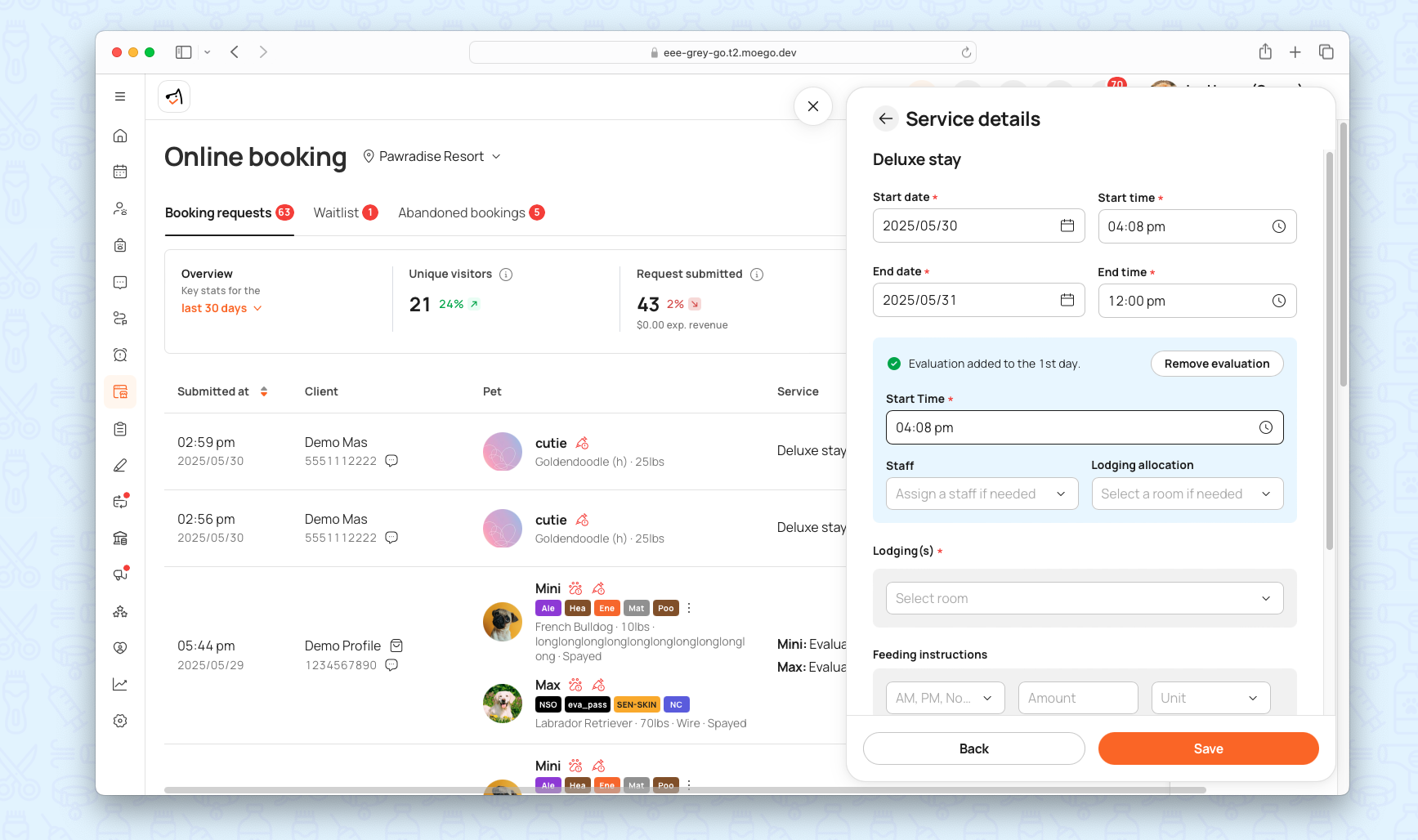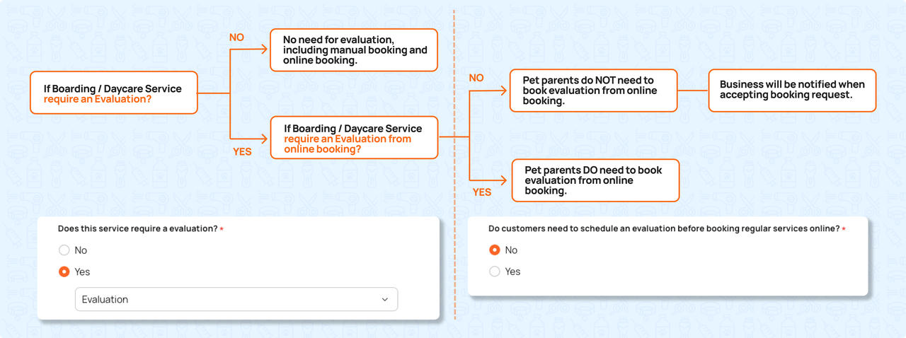 - Mixed-Service Bookings: Support multi-pet, multi-service bookings with evaluation checks.