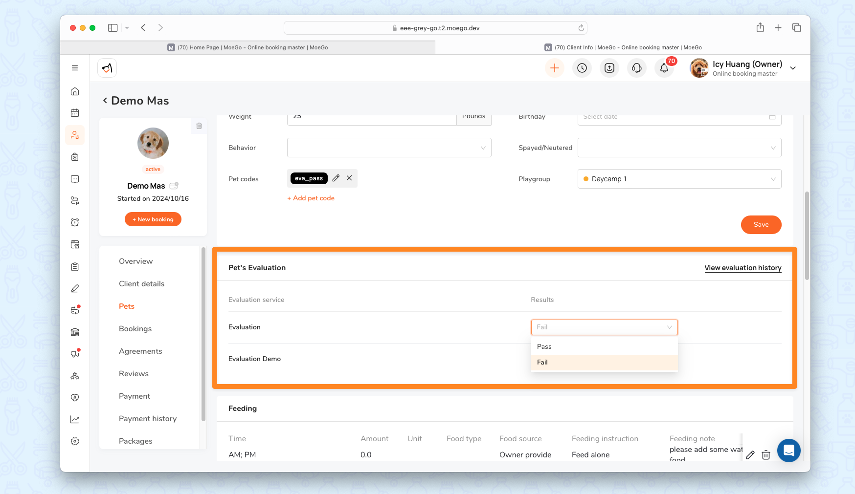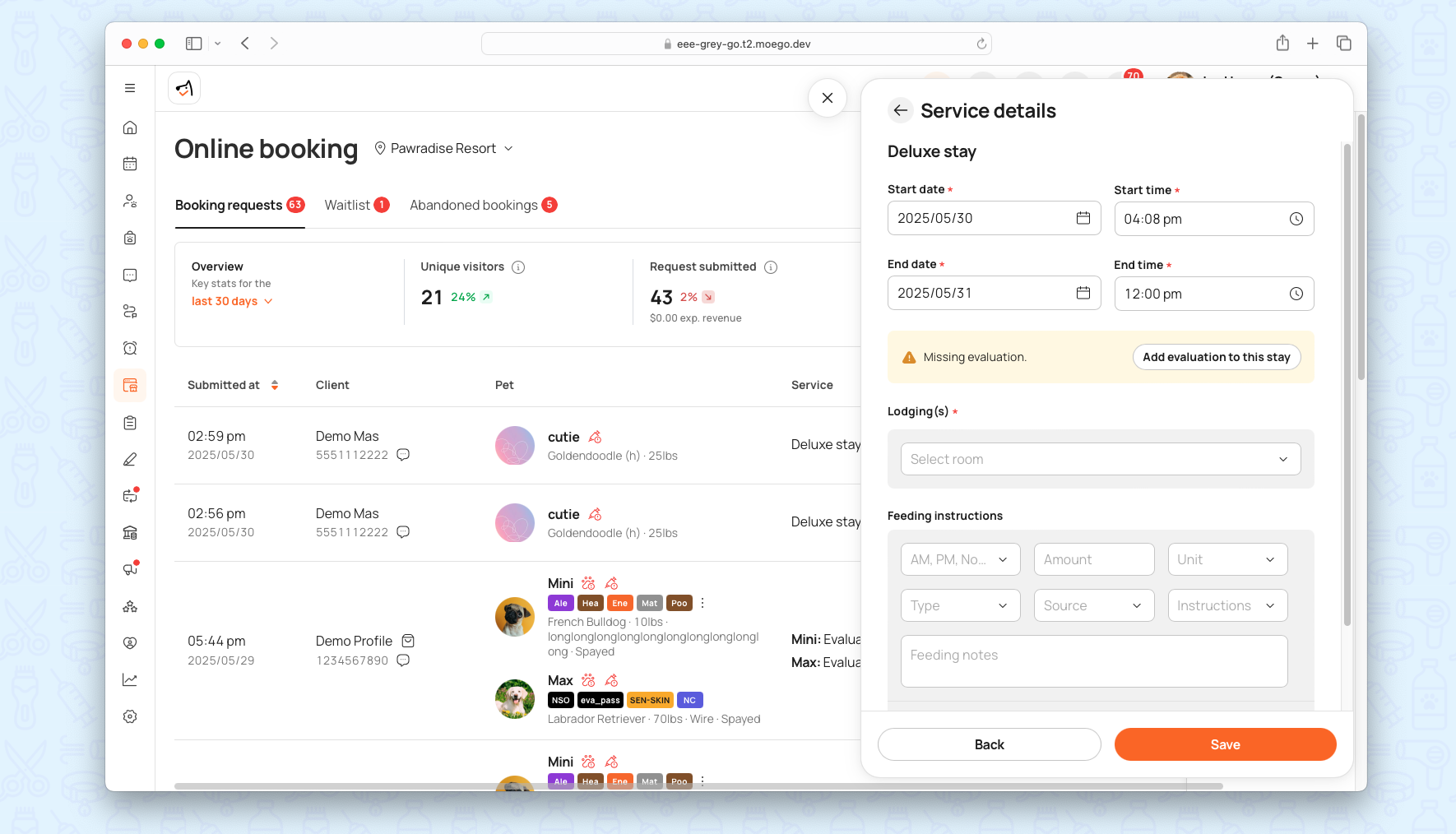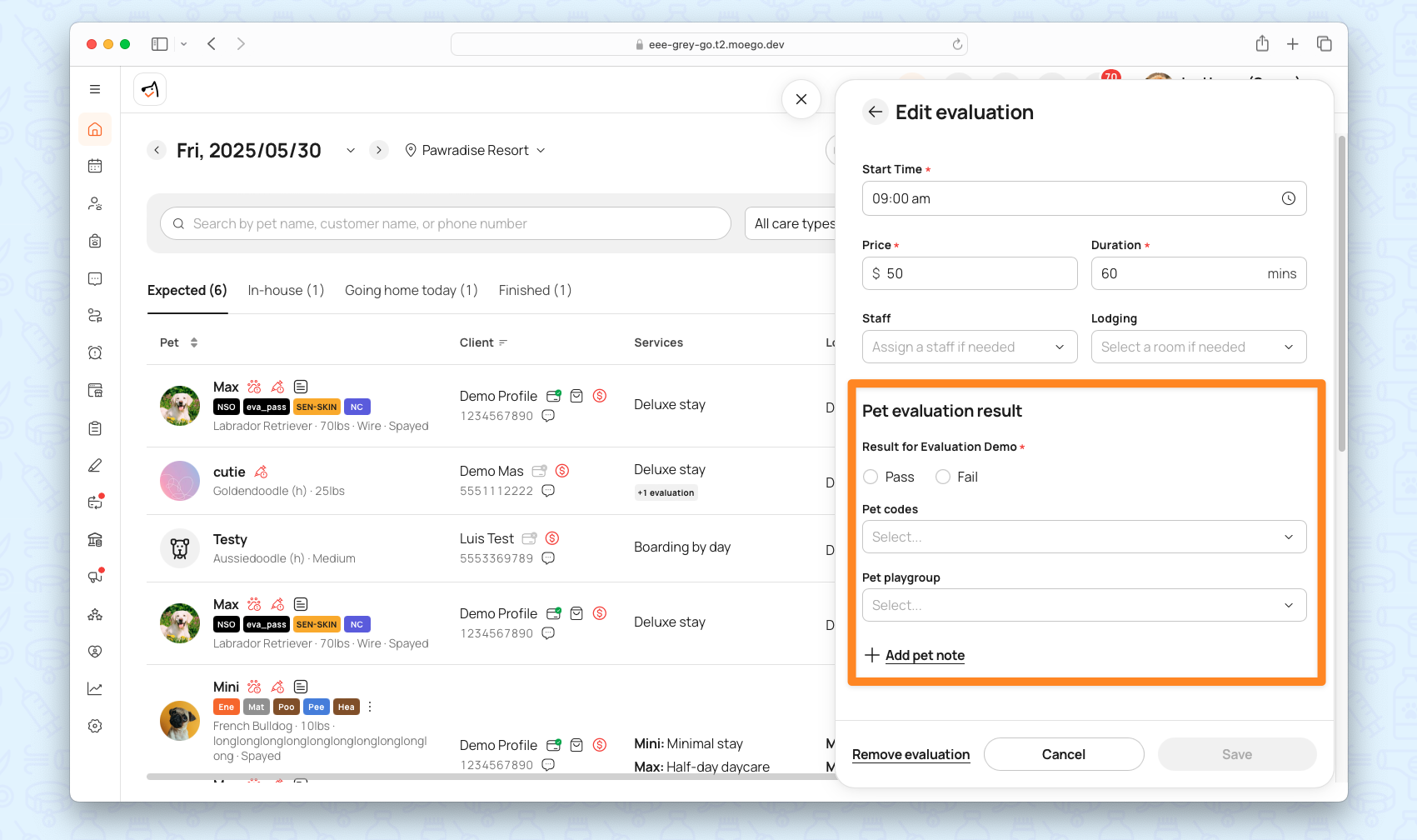 - Tailored Evaluations: Define different evaluations per service (e.g., aggression test for Group Play, health check for Boarding).