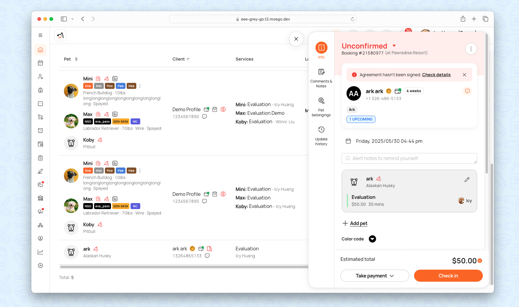 - Automated Reminders: Staff are alerted if a pet lacks an evaluation for a booked service.