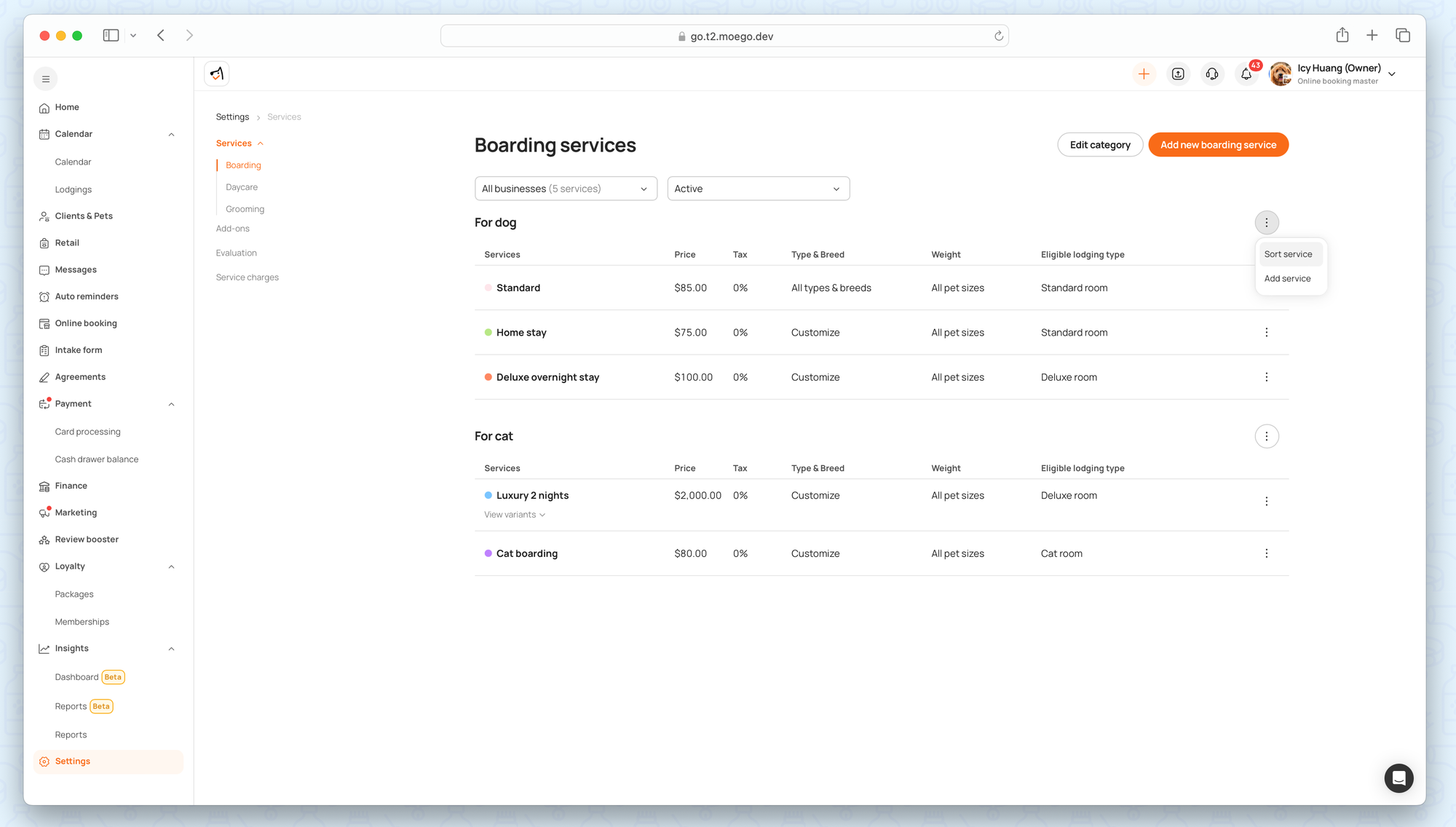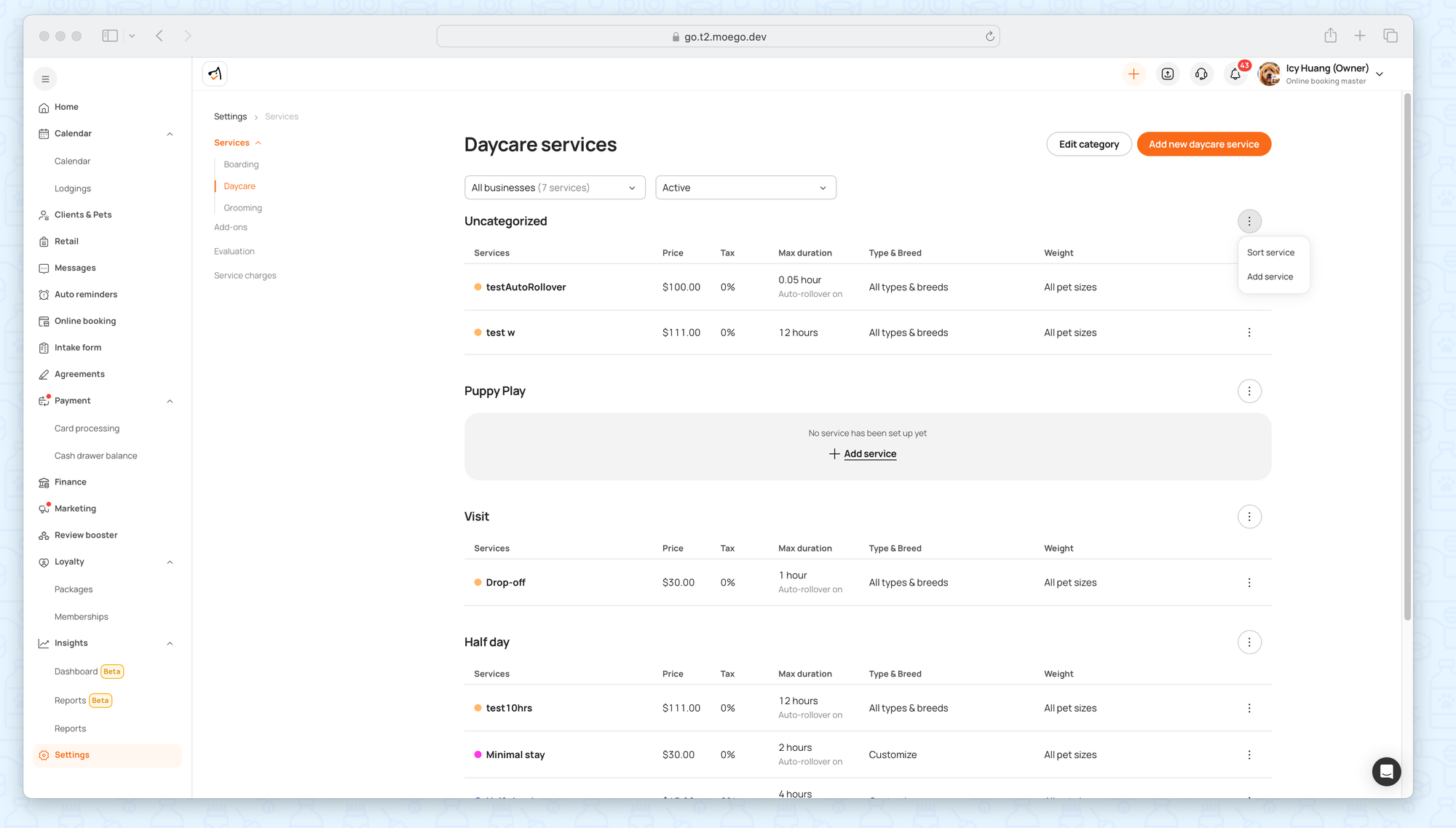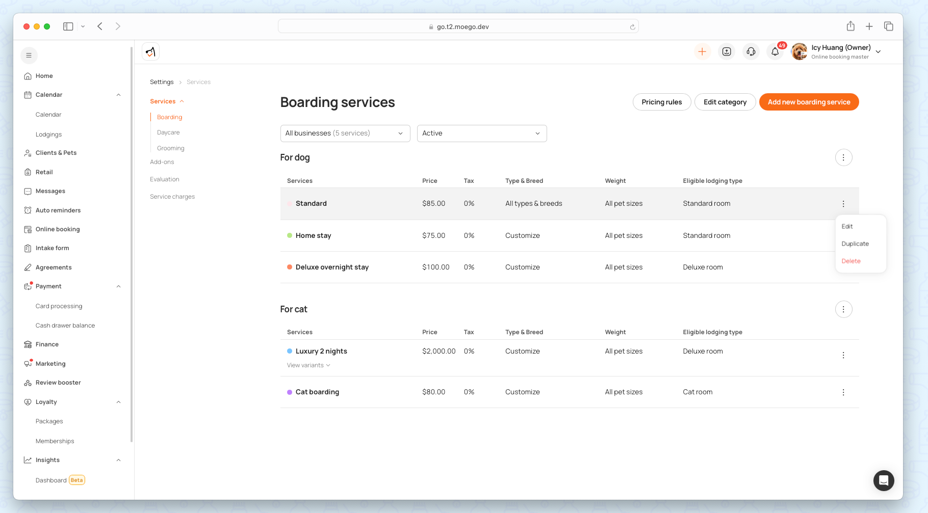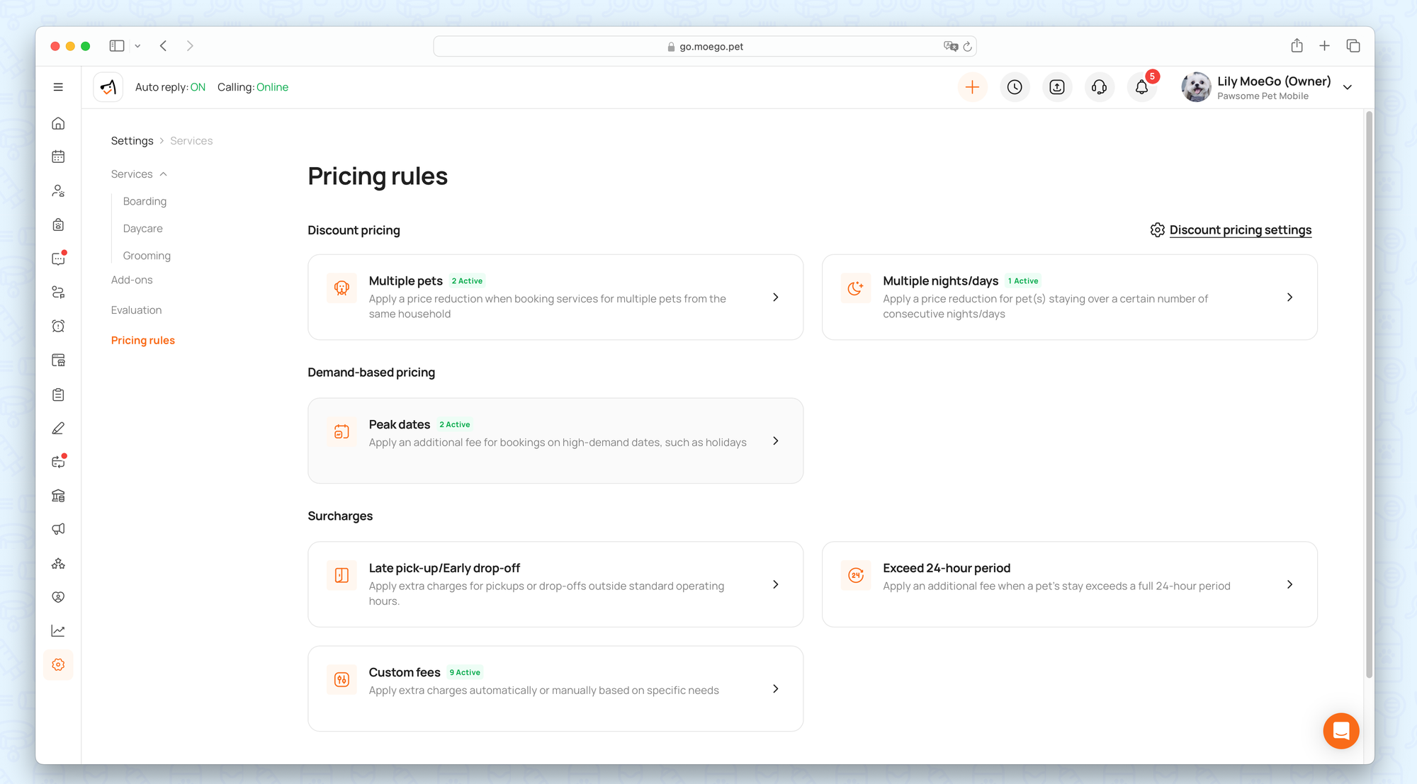 Tailor your boarding and daycare services to align with your business operations seamlessly. This guide will walk you through setting up services, pricing rules, and custom fees to enhance efficiency and flexibility.
