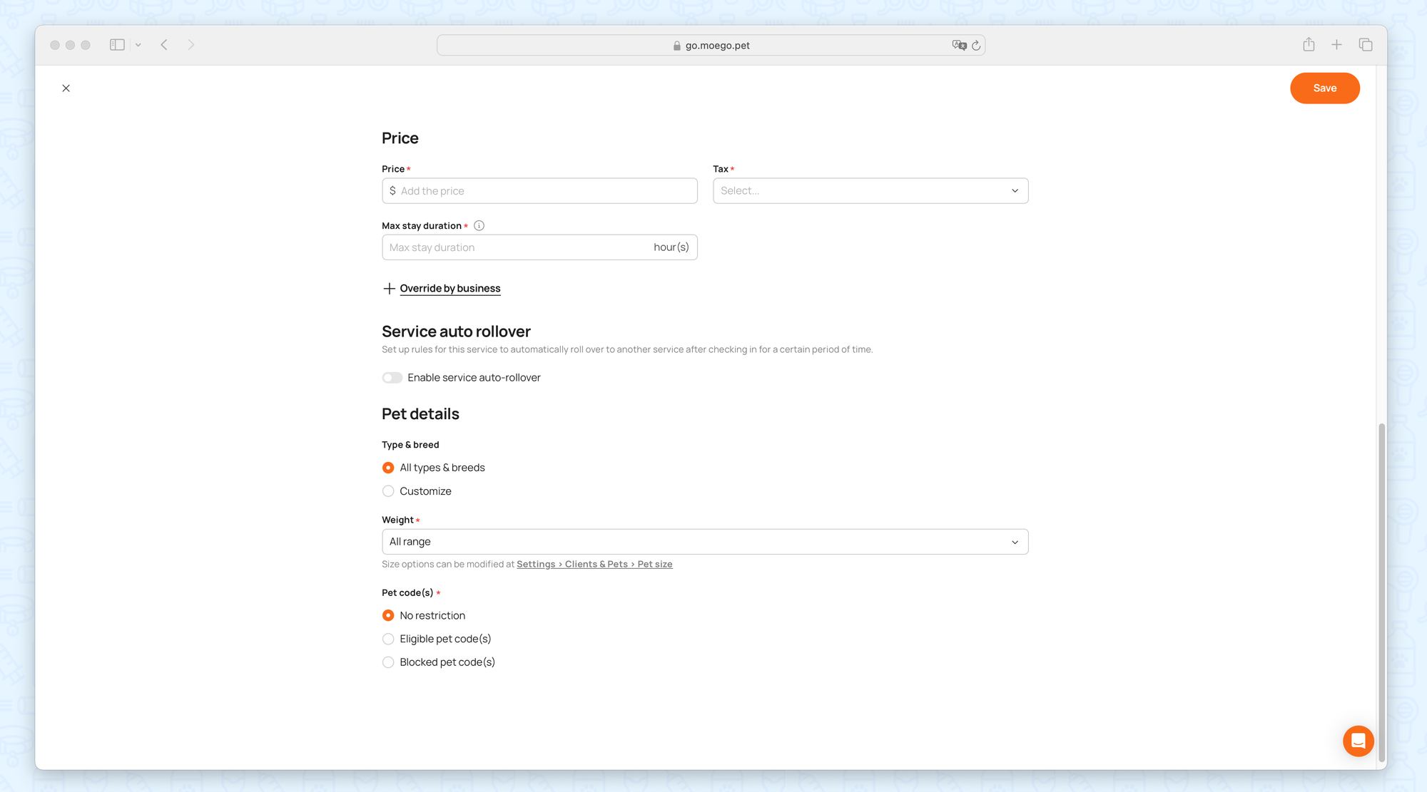 - Pet codes: Set up eligible pet codes or blocked pet codes. Pets with blocked pet codes will not be able to book for the service.