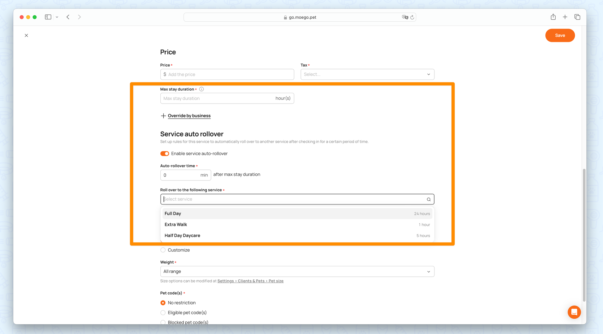 .5for half-hour increments.) - Service auto-rollover: Automatically transition pets to another service after a set duration.