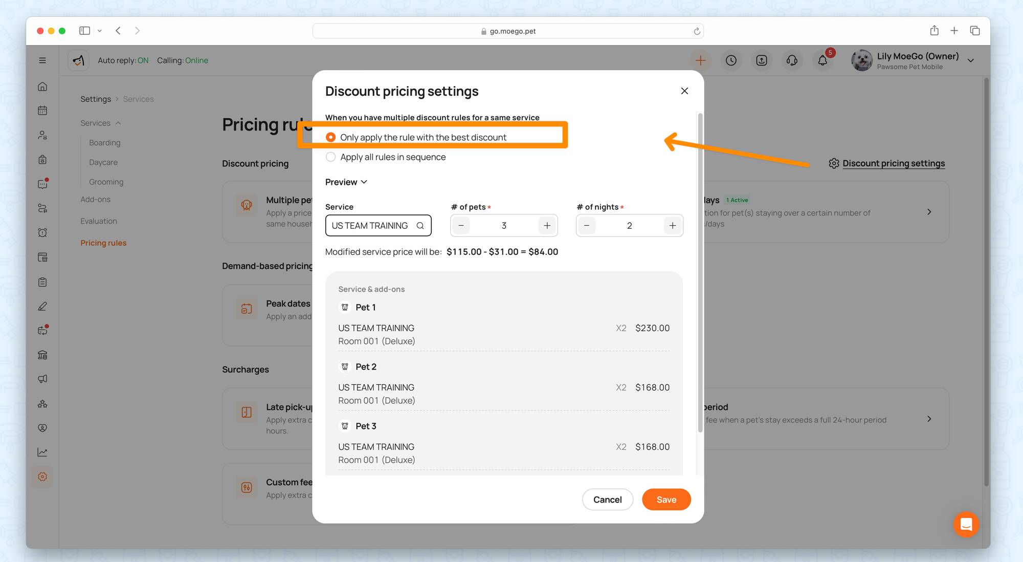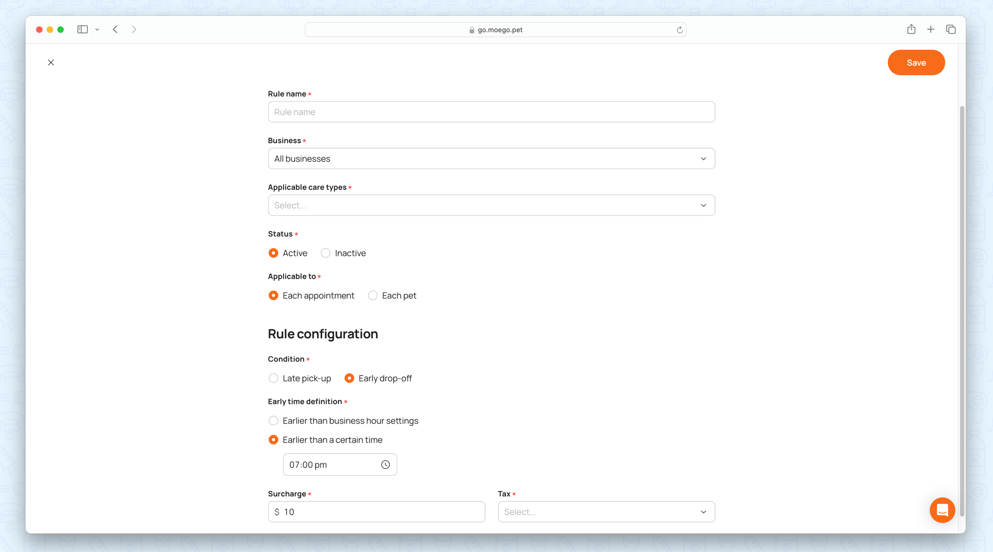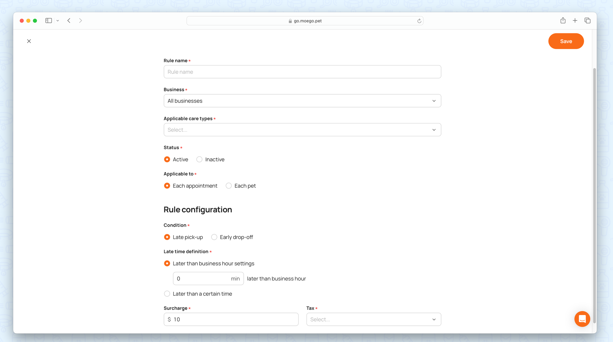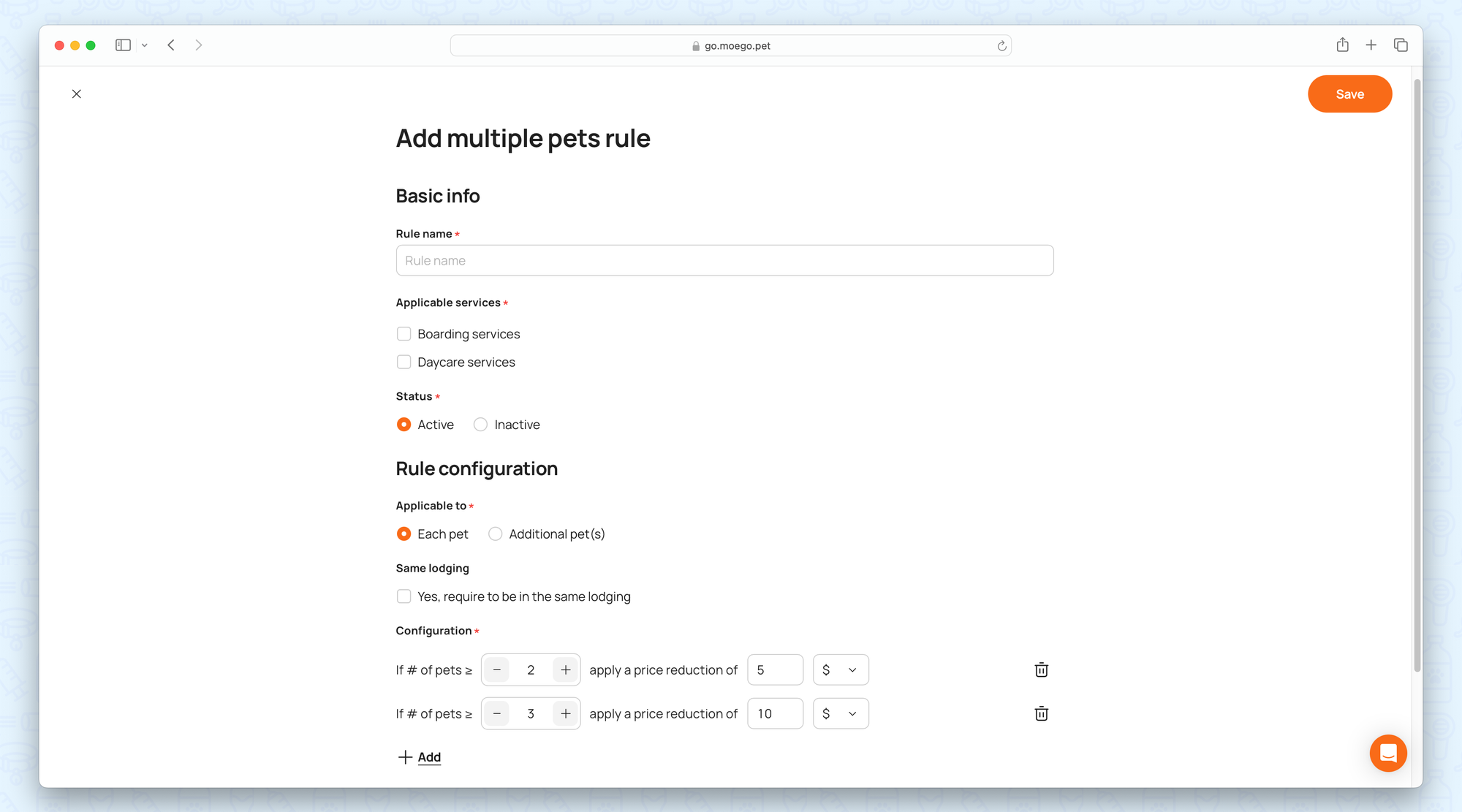 | Custom Fees | Add special charges based on unique scenarios. | Apply a $10 medication fee per pet if required. |