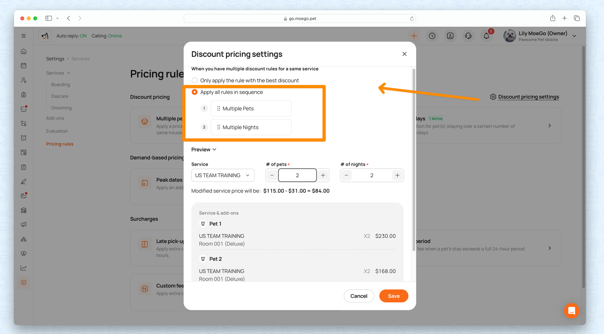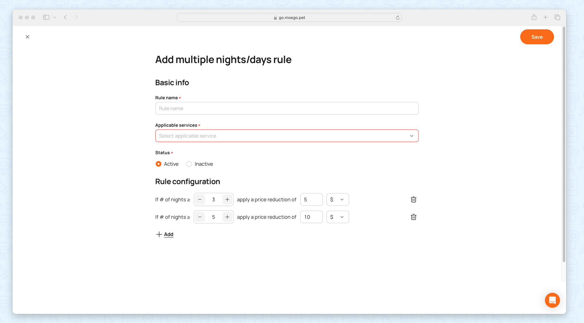 - Rule configuration: Apply a price reduction for pets staying over a certain number of consecutive nights.