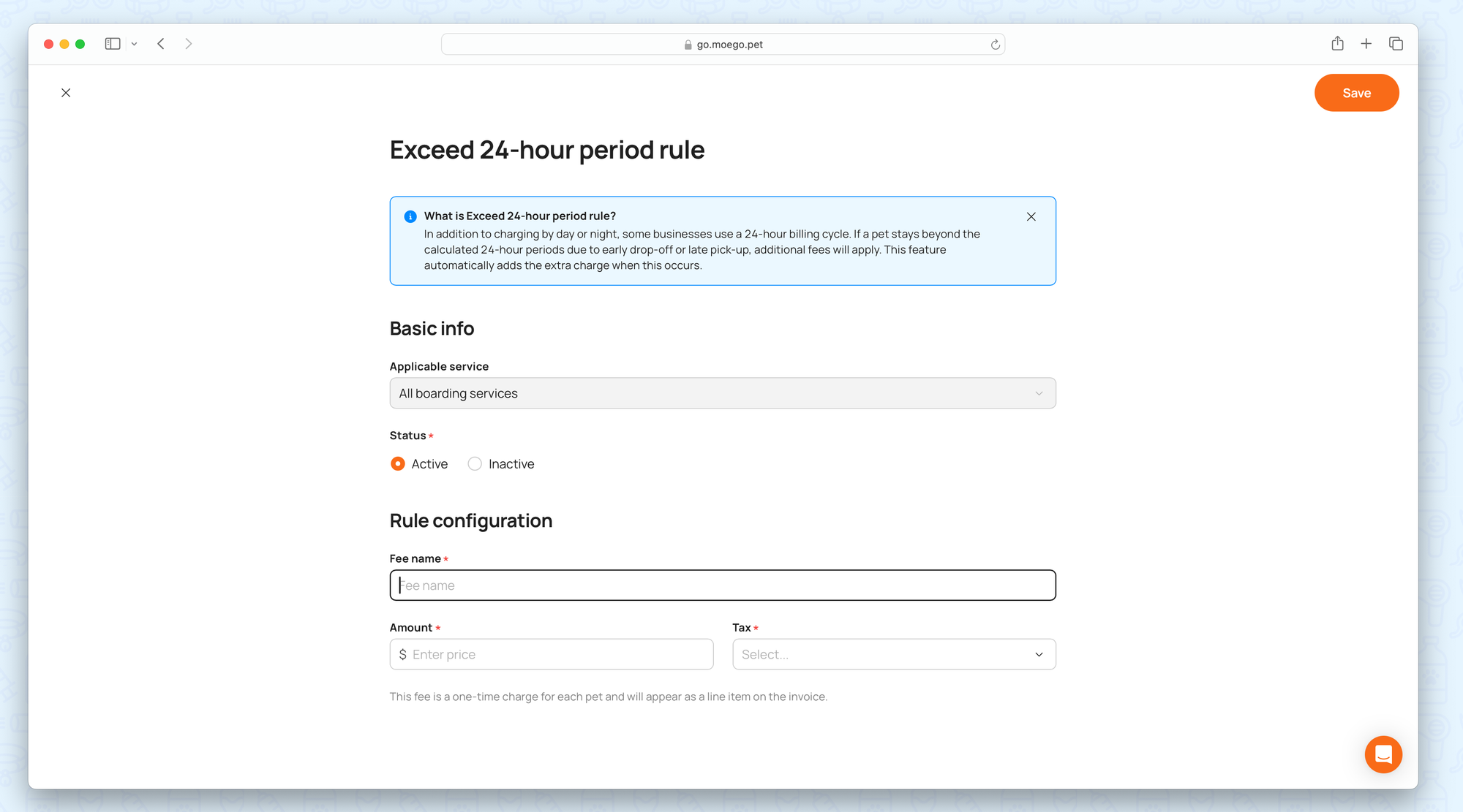 Charge an additional fee when a pet's stay exceeds 24 hours. This pricing rule is applicable to boarding services only.
