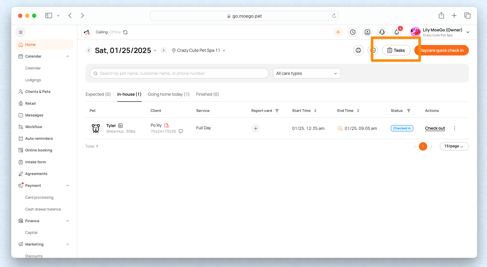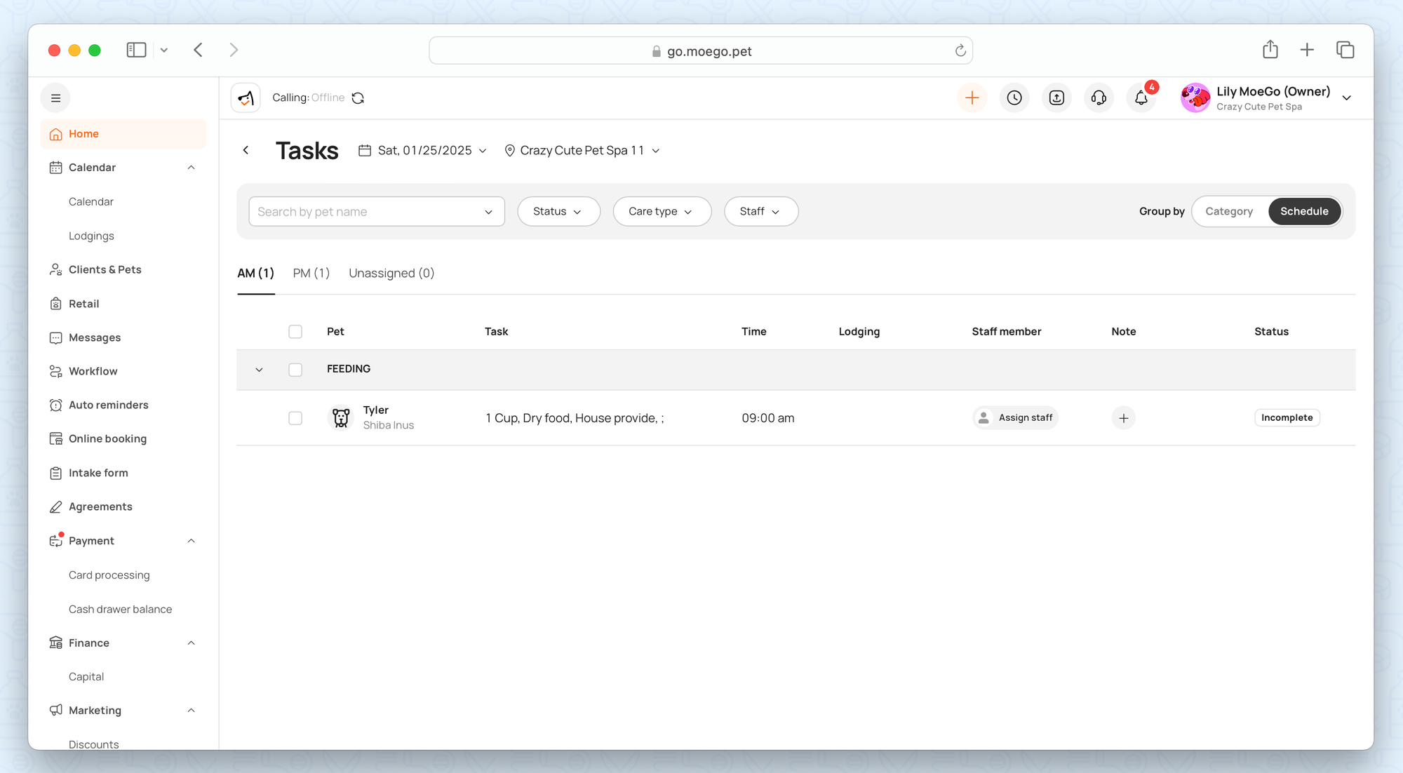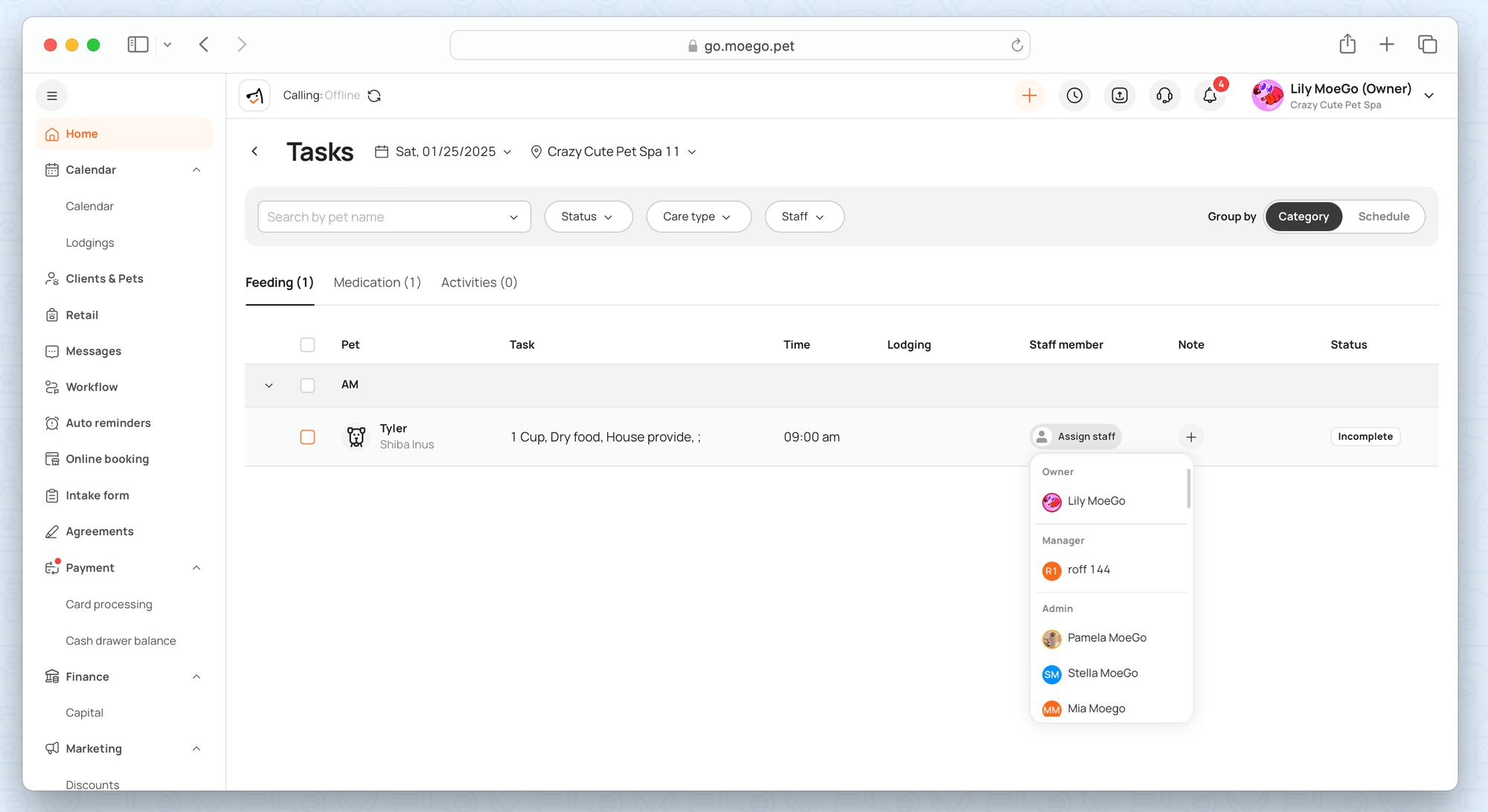 The Task Management feature helps you keep track of daily tasks and responsibilities for pets and staff. It offers an organized approach to managing both scheduled and ad-hoc tasks.