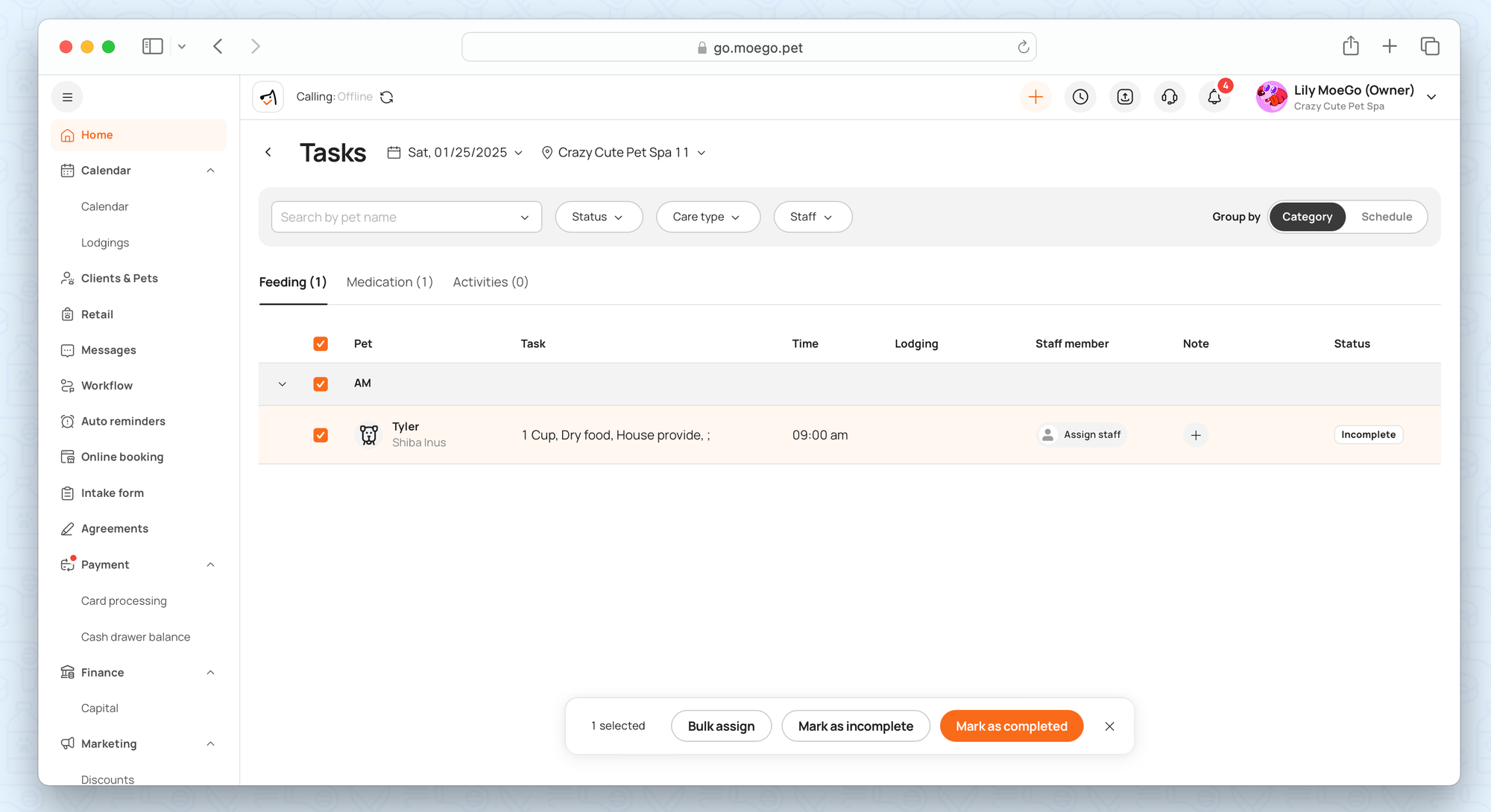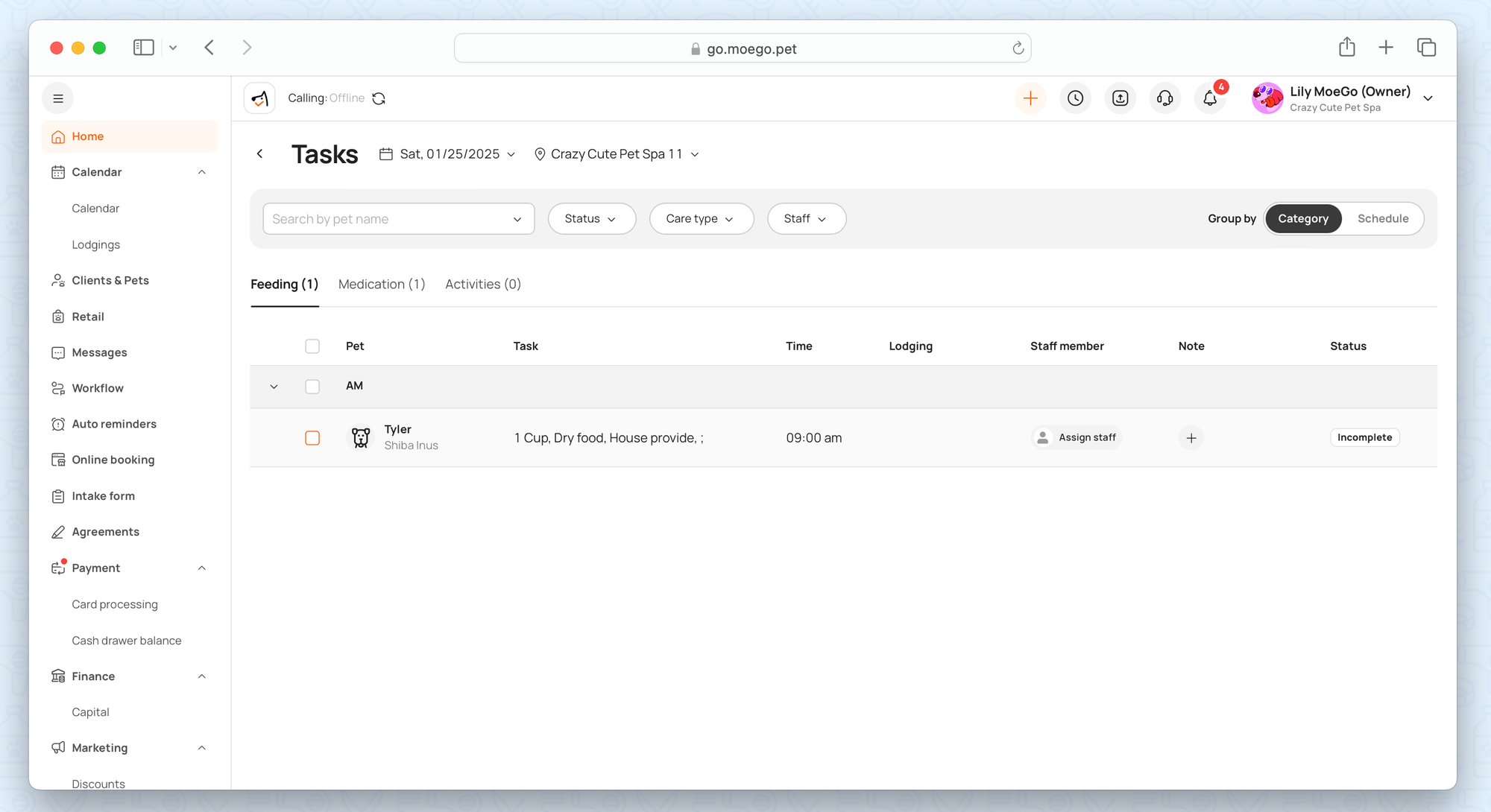 Tasks are automatically added when inputting feeding and medication schedules or adding add-ons without an assigned staff member.