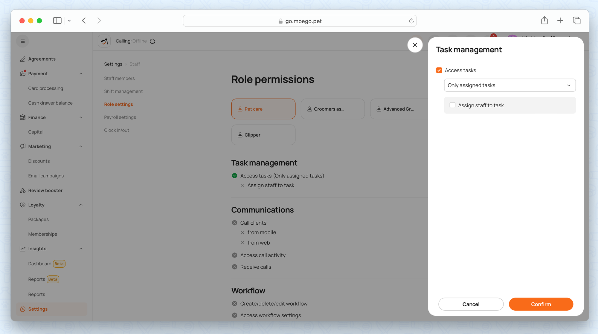 To manage staff's access to the task list, go to settings > staff > Role settings.