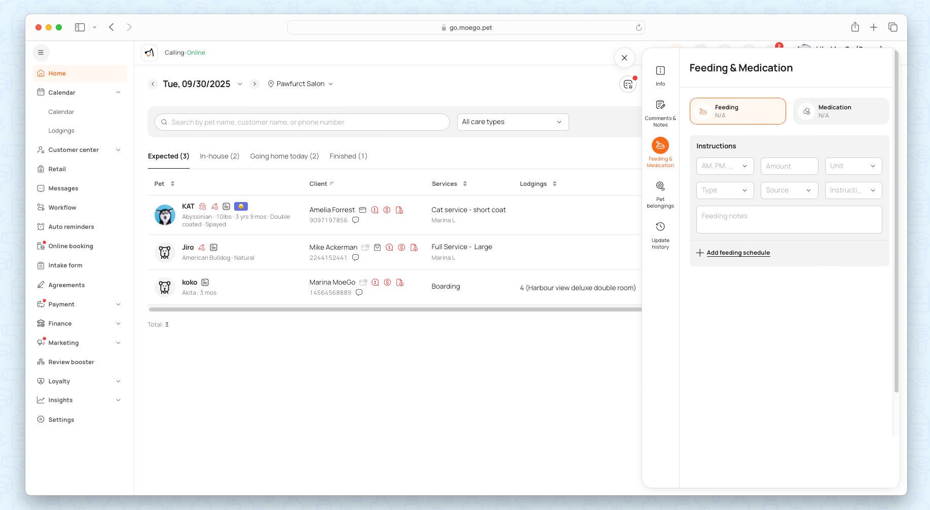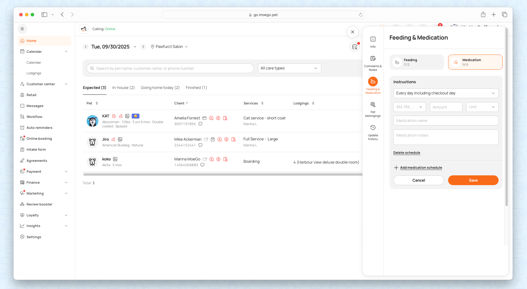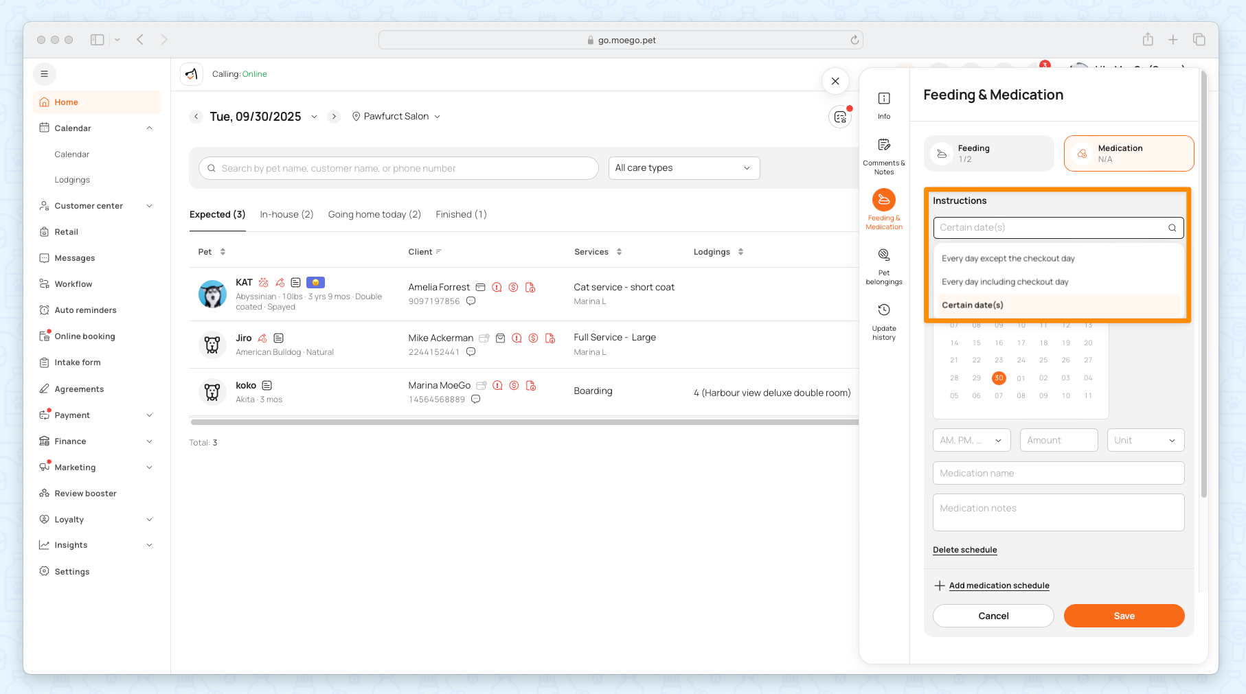 When the pet needs medication, the business can set up the specific date requirement for the appointment. Go to Appointment details > Feeding & Medication to set up.