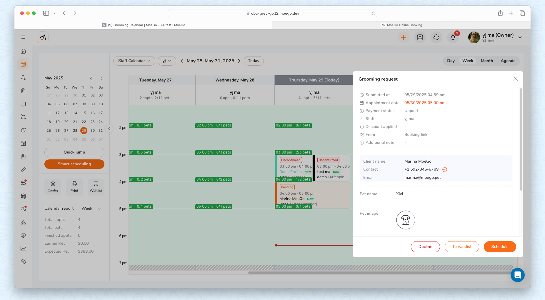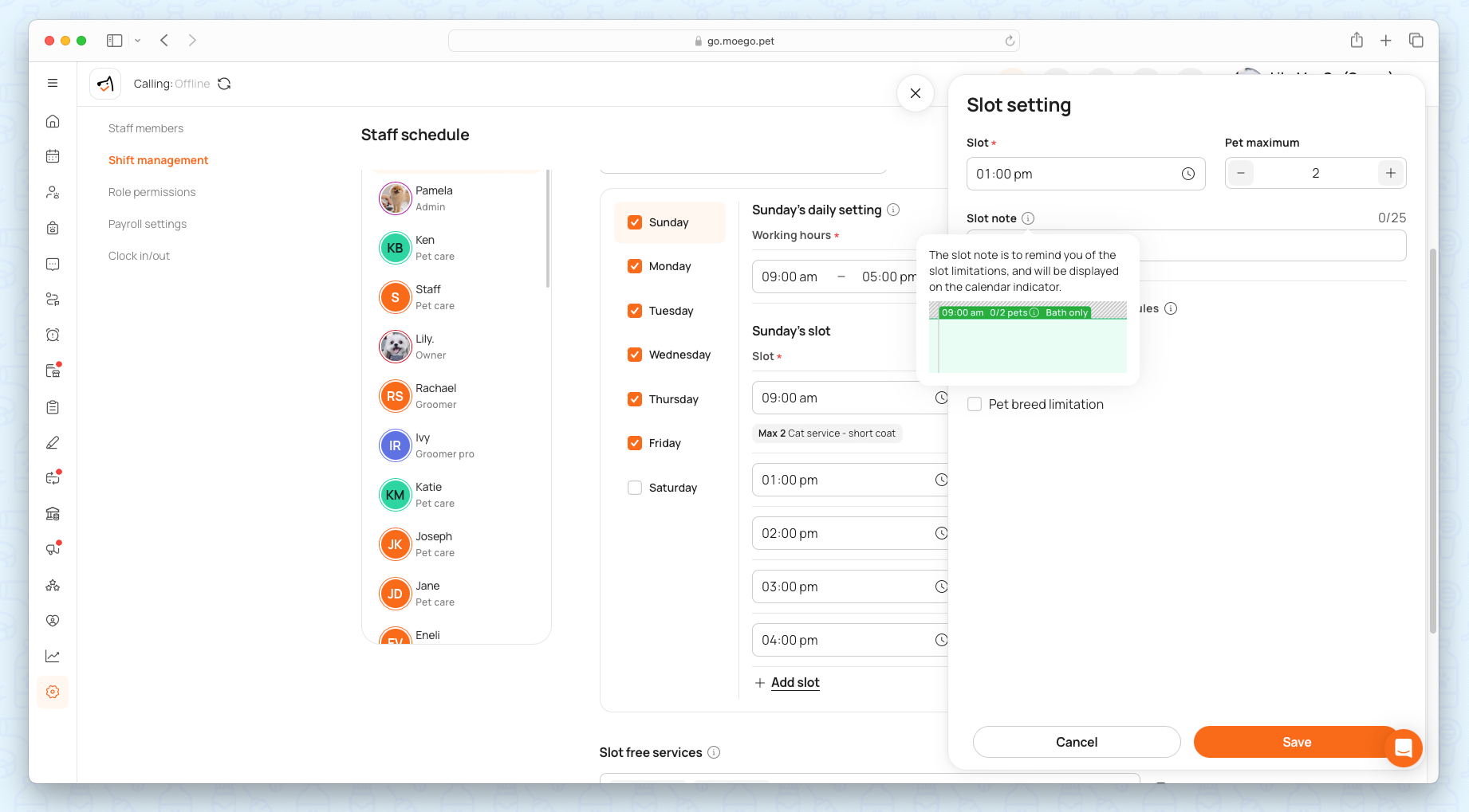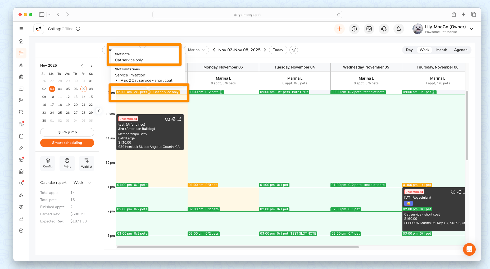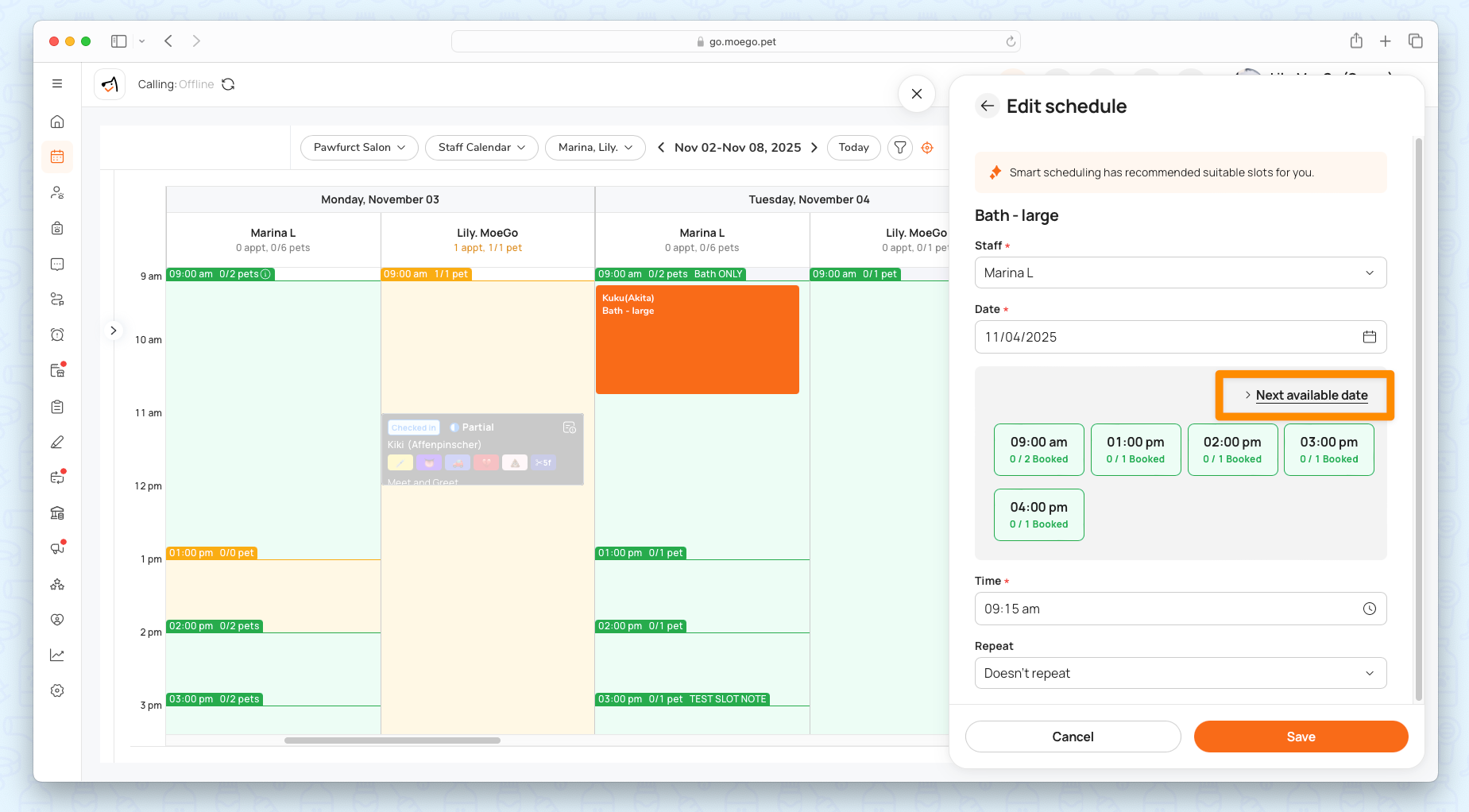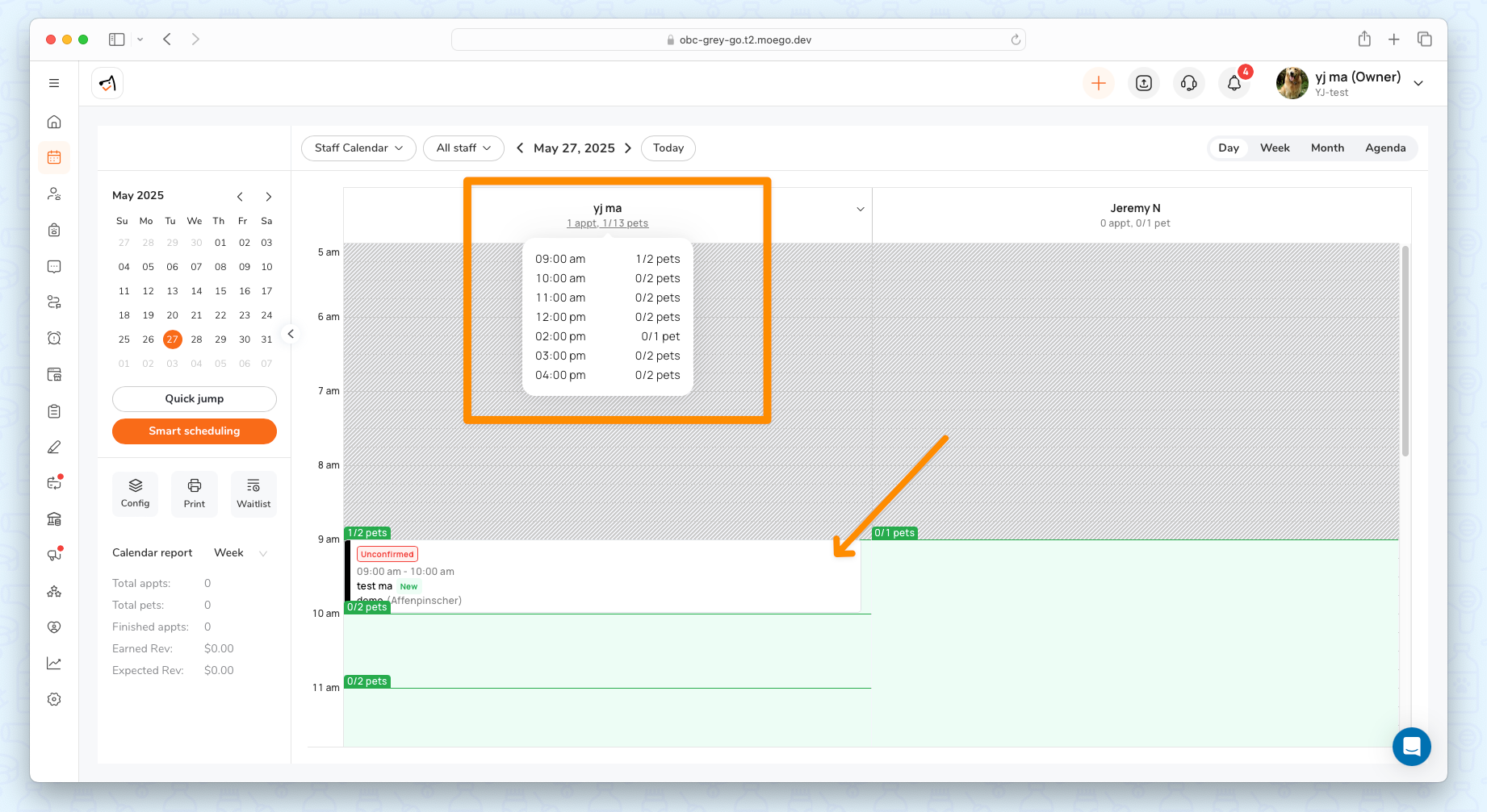 - The system will show all slots on the appointment date selected, with details on how many pets booked