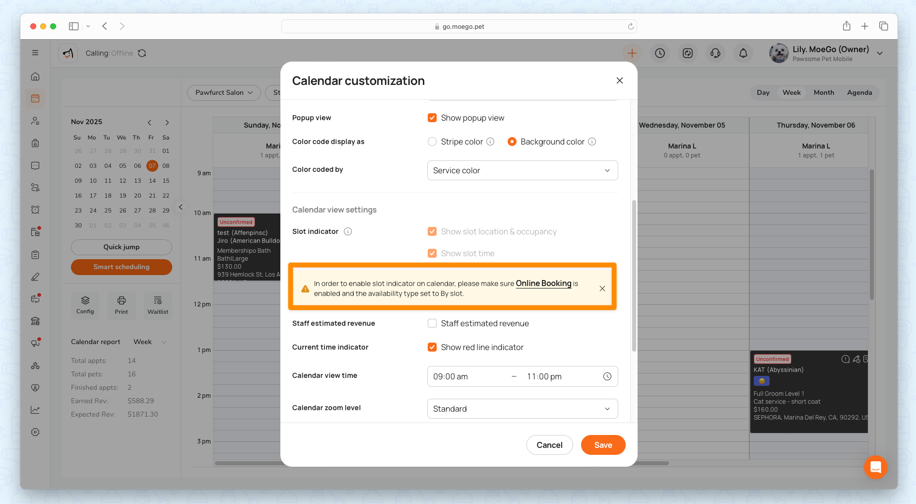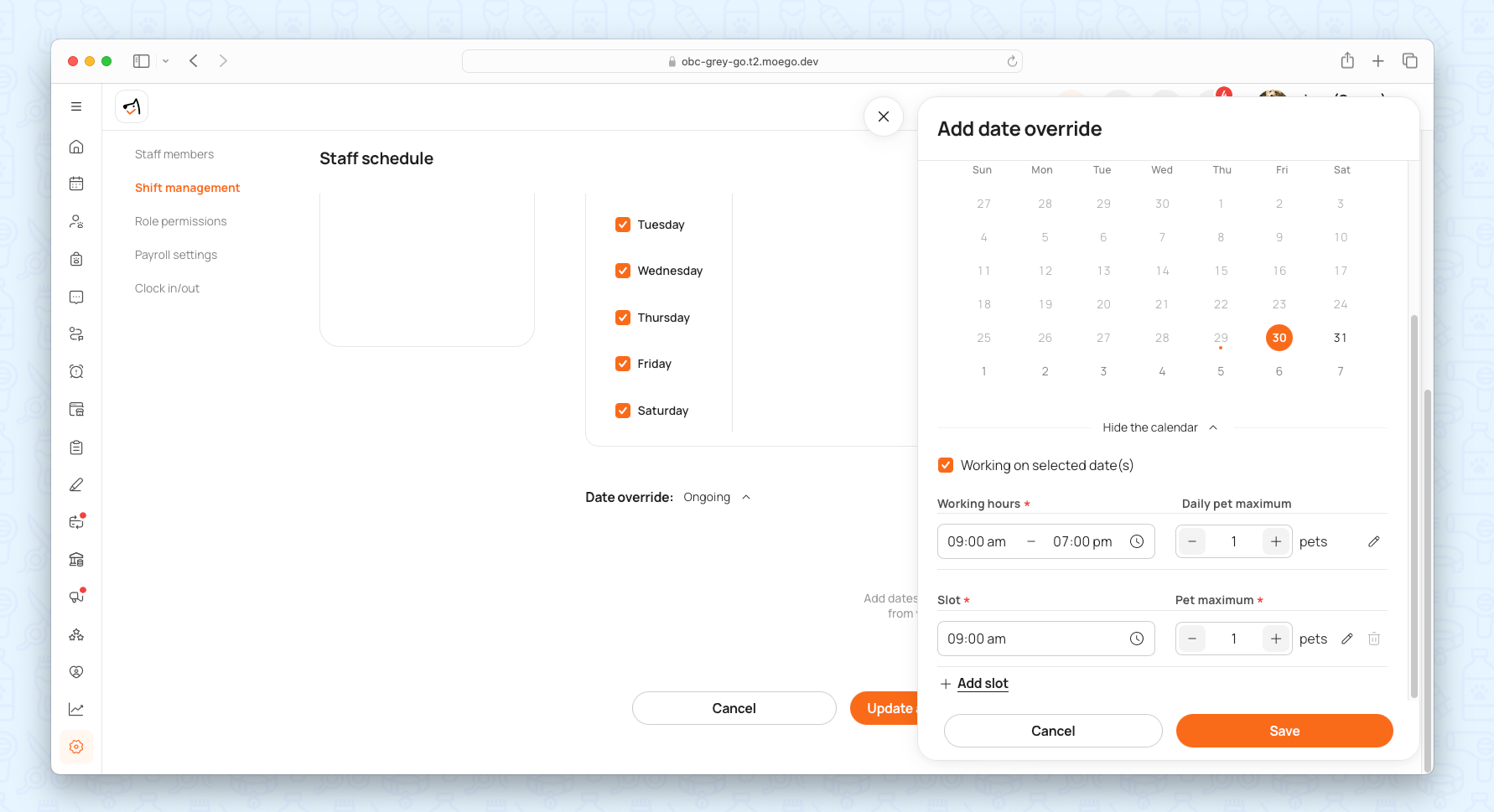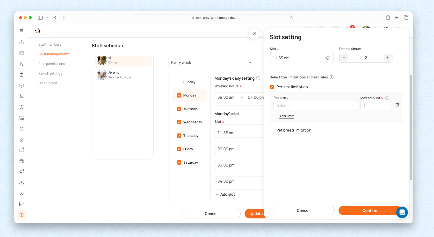 - Smart Slot Customization: Tailor slot lengths (30 mins for nail trims, 2 hrs for full grooms). Add buffer times between appointments.